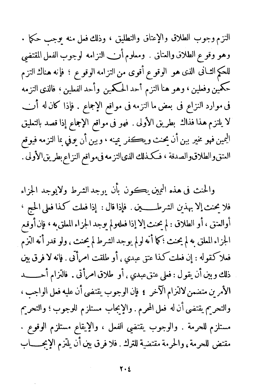 الْتَزَمَ وُجُوبَ الطَّلَاقِ وَالْإِعْتَاقِ وَالتَّطْلِيقِ وَذَلِكَ فِعْلٌ مِنْهُ يُوجِبُ حُكْمًا وَهُوَ وُقُوعُ الطَّلَاقِ وَالْعَتَاقِ. وَمَعْلُومٌ أَنَّ الْتِزَامَهُ لِوُجُوبِ الْفِعْلِ الْمُقْتَضِي لِلْحُكْمِ الثَّانِي الَّذِي هُوَ الْوُقُوعُ أَقْوَى مِنْ الْتِزَامِهِ الْوُقُوعَ؛ فَإِنَّهُ هُنَاكَ الْتَزَمَ حُكْمَيْنِ وَفِعْلَيْنِ وَهُوَ هُنَا الْتَزَمَ أَحَدَ الْحُكْمَيْنِ وَأَحَدَ الْفِعْلَيْنِ فَاَلَّذِي الْتَزَمَهُ فِي مَوَارِدِ النِّزَاعِ فِي بَعْضِ مَا الْتَزَمَهُ فِي مَوَاقِعِ الْإِجْمَاعِ. فَإِذَا كَانَ لَهُ أَنْ لَا يَلْتَزِمَ هَذَا فَذَاكَ بِطَرِيقِ الْأَوْلَى. فَهُوَ فِي مَوَاقِعِ الْإِجْمَاعِ إذَا قَصَدَ بِالتَّعْلِيقِ الْيَمِينَ فَهُوَ مُخَيَّرٌ بَيْنَ أَنْ يَحْنَثَ وَيُكَفِّرَ يَمِينَهُ وَبَيْنَ أَنْ يُوفِيَ بِمَا الْتَزَمَهُ فَيُوقِعُ الْعِتْقَ وَالطَّلَاقَ وَالصَّدَقَةَ فَكَذَلِكَ الَّذِي الْتَزَمَهُ فِي مَوَاقِعِ النِّزَاعِ بِطَرِيقِ الْأَوْلَى. وَالْحِنْثُ فِي هَذِهِ الْيَمِينِ يَكُونُ بِأَنْ يُوجَدَ الشَّرْطُ وَلَا يُوجَدَ الْجَزَاءُ فَلَا يَحْنَثُ إلَّا بِهَذَيْنِ الشَّرْطَيْنِ. فَإِذَا قَالَ: إذَا فَعَلْت كَذَا فَعَلَيَّ الْحَجُّ أَوْ الْعِتْقُ أَوْ الطَّلَاقُ: لَمْ يَحْنَثْ إلَّا إذَا فَعَلَهُ وَلَمْ يُوجَدْ الْجَزَاءُ الْمُعَلَّقُ بِهِ فَإِنْ أَوْقَعَ الْجَزَاءَ الْمُعَلَّقَ بِهِ لَمْ يَحْنَثْ؛ كَمَا أَنَّهُ لَوْ لَمْ يُوجَدْ الشَّرْطُ لَمْ يَحْنَثْ وَلَوْ قُدِّرَ أَنَّهُ الْتَزَمَ فِعْلًا كَقَوْلِهِ: إنْ فَعَلْت كَذَا عَتَقَ عَبْدِي أَوْ طَلُقَتْ امْرَأَتِي. فَإِنَّهُ لَا فَرْقَ بَيْنَ ذَلِكَ وَبَيْنَ أَنْ يَقُولَ: فَعَلَيَّ عِتْقُ عَبْدِي أَوْ طَلَاقُ امْرَأَتِي. فَالْتِزَامُ أَحَدِ الْأَمْرَيْنِ مُتَضَمِّنٌ لِالْتِزَامِ الْآخَرِ؛ فَإِنَّ الْوُجُوبَ يَقْتَضِي أَنَّ عَلَيْهِ فِعْلَ الْوَاجِبِ وَالتَّحْرِيمَ يَقْتَضِي أَنَّ لَهُ فِعْلَ الْمُحَرَّمِ. وَالْإِيجَابُ مُسْتَلْزِمٌ لِلْوُجُوبِ؛ وَالتَّحْرِيمُ مُسْتَلْزِمٌ لِلْحُرْمَةِ. وَالْوُجُوبُ يَقْتَضِي الْفِعْلَ وَالْإِيقَاعُ مُسْتَلْزِمُ الْوُقُوعِ مُقْتَضٍ لِلْحُرْمَةِ وَالْحُرْمَةُ مُقْتَضِيَةٌ لِلتَّرْكِ. فَلَا فَرْقَ بَيْنَ أَنْ يَلْتَزِمَ الْإِيجَابَ