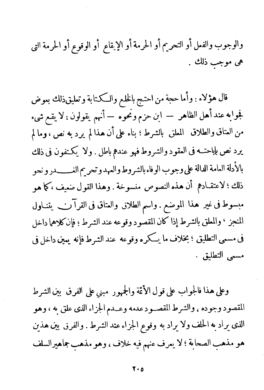 وَالْوُجُوبَ وَالْفِعْلَ أَوْ التَّحْرِيمَ أَوْ الْحُرْمَةَ أَوْ الْإِيقَاعَ أَوْ الْوُقُوعَ أَوْ الْحُرْمَةَ الَّتِي هِيَ مُوجَبُ ذَلِكَ. قَالَ هَؤُلَاءِ: وَأَمَّا حُجَّةُ مَنْ احْتَجَّ بِالْخُلْعِ وَالْكِتَابَةِ وَتَعْلِيقِ ذَلِكَ بِعِوَضِ فَجَوَابُهُ عِنْدَ أَهْلِ الظَّاهِرِ - ابْنِ حَزْمٍ وَنَحْوِهِ - أَنَّهُمْ يَقُولُونَ: لَا يَقَعُ شَيْءٌ مِنْ الْعَتَاقِ وَالطَّلَاقِ وَالْمُعَلَّقِ بِالشَّرْطِ؛ بِنَاءً عَلَى أَنَّ هَذَا لَمْ يَرِدْ بِهِ نَصٌّ وَمَا لَمْ يَرِدْ نَصٌّ بِإِبَاحَتِهِ فِي الْعُقُودِ وَالشُّرُوطِ فَهُوَ عِنْدَهُمْ بَاطِلٌ. وَلَا يَكْتَفُونَ فِي ذَلِكَ بِالْأَدِلَّةِ الْعَامَّةِ الدَّالَّةِ عَلَى وُجُوبِ الْوَفَاءِ بِالشُّرُوطِ وَالْعَهْدِ وَتَحْرِيمِ الْغَدْرِ وَنَحْوِ ذَلِكَ؛ لِاعْتِقَادِهِمْ أَنَّ هَذِهِ النُّصُوصَ مَنْسُوخَةٌ. وَهَذَا الْقَوْلُ ضَعِيفٌ كَمَا هُوَ مَبْسُوطٌ فِي غَيْرِ هَذَا الْمَوْضِعِ. وَاسْمُ الطَّلَاقِ وَالْعَتَاقِ فِي الْقُرْآنِ يَتَنَاوَلُ الْمُنْجَزَ وَالْمُعَلَّقَ بِالشَّرْطِ إذَا كَانَ الْمَقْصُودُ وُقُوعَهُ عِنْدَ الشَّرْطِ؛ فَإِنَّ كِلَاهُمَا دَاخِلٌ فِي مُسَمَّى التَّطْلِيقِ؛ بِخِلَافِ مَا يُكْرَهُ وُقُوعُهُ عِنْدَ الشَّرْطِ فَإِنَّهُ يَمِينٌ دَاخِلُ فِي مُسَمَّى التَّطْلِيقِ. وَعَلَى هَذَا فَالْجَوَابُ عَلَى قَوْلِ الْأَئِمَّةِ وَالْجُمْهُورِ مَبْنِيٌّ عَلَى الْفَرْقِ بَيْنَ الشَّرْطِ الْمَقْصُودِ وُجُودُهُ وَالشَّرْطِ الْمَقْصُودِ عَدَمُهُ وَعَدَمِ الْجَزَاءِ الَّذِي عُلِّقَ بِهِ وَهُوَ الَّذِي يُرَادُ بِهِ الْحَلِفُ وَلَا يُرَادُ بِهِ وُقُوعُ الْجَزَاءِ عِنْدَ الشَّرْطِ. وَالْفَرْقُ بَيْنَ هَذَيْنِ هُوَ مَذْهَبُ الصَّحَابَةِ؛ لَا يُعْرَفُ عَنْهُمْ فِيهِ خِلَافٌ وَهُوَ مَذْهَبُ جَمَاهِيرِ السَّلَفِ