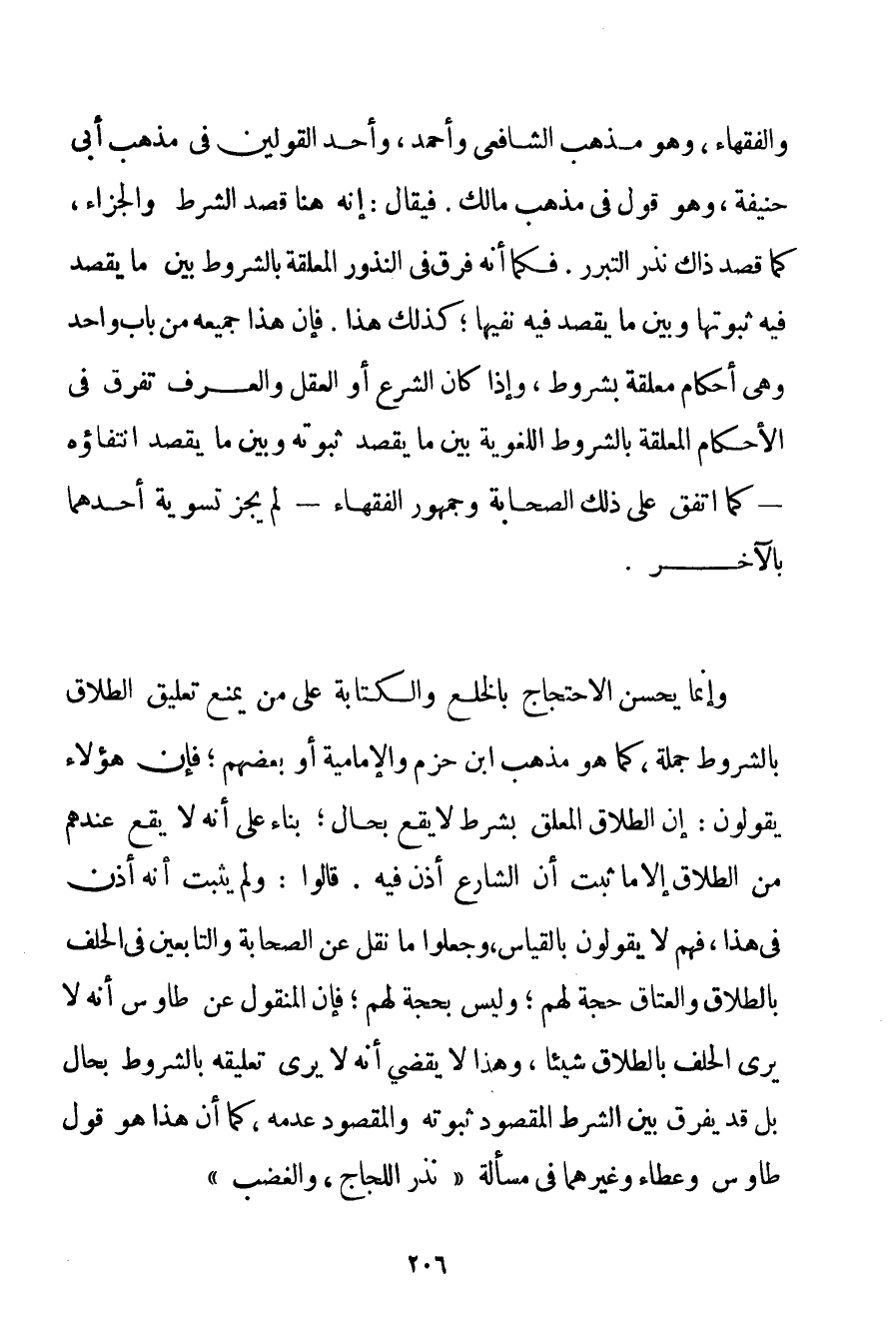 وَالْفُقَهَاءِ وَهُوَ مَذْهَبُ الشَّافِعِيِّ وَأَحْمَد وَأَحَدُ الْقَوْلَيْنِ فِي مَذْهَبِ أَبِي حَنِيفَةَ وَهُوَ قَوْلٌ فِي مَذْهَبِ مَالِكٍ. فَيُقَالُ: إنَّهُ هُنَا قَصَدَ الشَّرْطَ وَالْجَزَاءَ كَمَا قَصَدَ ذَاكَ نَذْرَ التَّبَرُّرِ. فَكَمَا أَنَّهُ فَرَّقَ فِي النُّذُورِ الْمُعَلَّقَةِ بِالشُّرُوطِ بَيْنَ مَا يَقْصِدُ فِيهِ ثُبُوتَهَا وَبَيْنَ مَا يَقْصِدُ فِيهِ نَفْيَهَا؛ كَذَلِكَ هَذَا. فَإِنَّ هَذَا جَمِيعُهُ مِنْ بَابٍ وَاحِدٍ وَهِيَ أَحْكَامٌ مُعَلَّقَةٌ بِشُرُوطِ وَإِذَا كَانَ الشَّرْعُ أَوْ الْعَقْلُ وَالْعُرْفُ تَفَرَّقَ فِي الْأَحْكَامِ الْمُعَلَّقَةِ بِالشُّرُوطِ اللُّغَوِيَّةِ بَيْنَ مَا يَقْصِدُ ثُبُوتَهُ وَبَيْنَ مَا يَقْصِدُ انْتِفَاءَهُ - كَمَا اتَّفَقَ عَلَى ذَلِكَ الصَّحَابَةُ وَجُمْهُورُ الْفُقَهَاءِ - لَمْ يَجُزْ تَسْوِيَةُ أَحَدِهِمَا بِالْآخَرِ. وَإِنَّمَا يَحْسُنُ الِاحْتِجَاجُ بِالْخُلْعِ وَالْكِتَابَةِ كُلُّ مَنْ يَمْنَعُ تَعْلِيقَ الطَّلَاقِ بِالشُّرُوطِ جُمْلَةً كَمَا هُوَ مَذْهَبُ ابْنِ حَزْمٍ وَالْإِمَامِيَّةِ أَوْ بَعْضِهِمْ؛ فَإِنَّ هَؤُلَاءِ يَقُولُونَ: إنَّ الطَّلَاقَ الْمُعَلَّقَ بِشَرْطِ لَا يَقَعُ بِحَالِ؛ بِنَاءً عَلَى أَنَّهُ لَا يَقَعُ عِنْدَهُمْ مِنْ الطَّلَاقِ إلَّا مَا ثَبَتَ أَنَّ الشَّارِعَ أَذِنَ فِيهِ. قَالُوا: وَلَمْ يَثْبُتْ أَنَّهُ أَذِنَ فِي هَذَا فَهُمْ لَا يَقُولُونَ بِالْقِيَاسِ وَجَعَلُوا مَا نُقِلَ عَنْ الصَّحَابَةِ وَالتَّابِعِينَ فِي الْحَلِف بِالطَّلَاقِ وَالْعَتَاقِ حُجَّةً لَهُمْ؛ وَلَيْسَ بِحُجَّةِ لَهُمْ؛ فَإِنَّ الْمَنْقُولَ عَنْ طاوس أَنَّهُ لَا يَرَى الْحَلِفَ بِالطَّلَاقِ شَيْئًا وَهَذَا لَا يَقْضِي أَنَّهُ لَا يَرَى تَعْلِيقَهُ بِالشُّرُوطِ بِحَالِ بَلْ قَدْ يُفَرِّقُ بَيْنَ الشَّرْطِ الْمَقْصُودِ ثُبُوتُهُ وَالْمَقْصُودِ عَدَمُهُ كَمَا أَنَّ هَذَا هُوَ قَوْلُ طَاوُوسٍ وَعَطَاءٍ وَغَيْرِهِمَا فِي مَسْأَلَةِ " نَذْرِ اللَّجَاجِ وَالْغَضَبِ "