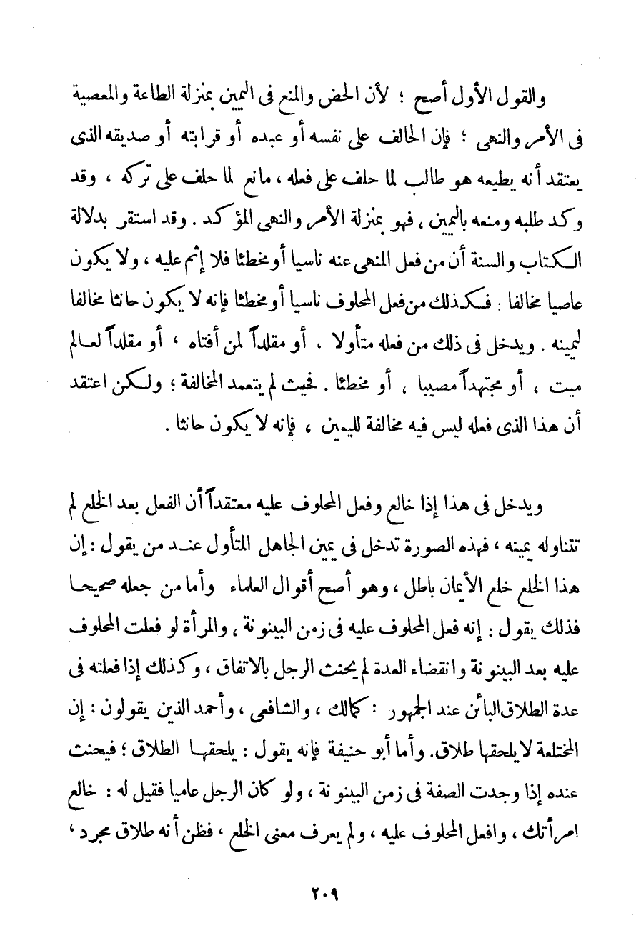 وَالْقَوْلُ الْأَوَّلُ أَصَحُّ؛ لِأَنَّ الْحَضَّ وَالْمَنْعَ فِي الْيَمِينِ بِمَنْزِلَةِ الطَّاعَةِ وَالْمَعْصِيَةِ فِي الْأَمْرِ وَالنَّهْيِ؛ فَإِنَّ الْحَالِفَ عَلَى نَفْسِهِ أَوْ عَبْدِهِ أَوْ قَرَابَتِهِ أَوْ صَدِيقِهِ الَّذِي يَعْتَقِدُ أَنَّهُ يُطِيعُهُ هُوَ طَالِبٌ لِمَا حَلَفَ عَلَى فِعْلِهِ مَانِعٌ لِمَا حَلَفَ عَلَى تَرْكِهِ وَقَدْ وَكَّدَ طَلَبَهُ وَمَنَعَهُ بِالْيَمِينِ فَهُوَ بِمَنْزِلَةِ الْأَمْرِ وَالنَّهْيِ الْمُؤَكَّدِ. وَقَدْ اسْتَقَرَّ بِدَلَالَةِ الْكِتَابِ وَالسُّنَّةِ أَنَّ مَنْ فَعَلَ الْمَنْهِيَّ عَنْهُ نَاسِيًا أَوْ مُخْطِئًا فَلَا إثْمَ عَلَيْهِ وَلَا يَكُونُ عَاصِيًا مُخَالِفًا: فَكَذَلِكَ مَنْ فَعَلَ الْمَحْلُوفَ نَاسِيًا أَوْ مُخْطِئًا فَإِنَّهُ لَا يَكُونُ حَانِثًا مُخَالِفًا لِيَمِينِهِ. وَيَدْخُلُ فِي ذَلِكَ مَنْ فَعَلَهُ مُتَأَوِّلًا أَوْ مُقَلِّدًا لِمَنْ أَفْتَاهُ أَوْ مُقَلِّدًا لِعَالِمِ مَيِّتٍ أَوْ مُجْتَهِدًا مُصِيبًا أَوْ مُخْطِئًا. فَحَيْثُ لَمْ يَتَعَمَّدْ الْمُخَالَفَةَ؛ وَلَكِنْ اعْتَقَدَ أَنَّ هَذَا الَّذِي فَعَلَهُ لَيْسَ فِيهِ مُخَالَفَةٌ لِلْيَمِينِ فَإِنَّهُ لَا يَكُونُ حَانِثًا. وَيَدْخُلُ فِي هَذَا إذَا خَالَعَ وَفَعَلَ الْمَحْلُوفَ عَلَيْهِ مُعْتَقِدًا أَنَّ الْفِعْلَ بَعْدَ الْخُلْعِ لَمْ تَتَنَاوَلْهُ يَمِينُهُ فَهَذِهِ الصُّورَةُ تَدْخُلُ فِي يَمِينِ الْجَاهِلِ الْمُتَأَوِّلِ عِنْدَ مَنْ يَقُولُ: إنَّ هَذَا الْخُلْعَ خُلْعَ الْأَيْمَانِ بَاطِلٌ وَهُوَ أَصَحُّ أَقْوَالِ الْعُلَمَاءِ وَأَمَّا مَنْ جَعَلَهُ صَحِيحًا فَذَلِكَ يَقُولُ: إنَّهُ فَعَلَ الْمَحْلُوفَ عَلَيْهِ فِي زَمَنِ الْبَيْنُونَةِ وَالْمَرْأَةُ لَوْ فَعَلَتْ الْمَحْلُوفَ عَلَيْهِ بَعْدَ الْبَيْنُونَةِ وَانْقِضَاءِ الْعِدَّةِ لَمْ يَحْنَثْ الرَّجُلُ بِالِاتِّفَاقِ وَكَذَلِكَ إذَا فَعَلَتْهُ فِي عِدَّةِ الطَّلَاقِ الْبَائِنِ عِنْدَ الْجُمْهُورِ: كَمَالِكِ وَالشَّافِعِيِّ وَأَحْمَد الَّذِينَ يَقُولُونَ: إنَّ الْمُخْتَلِعَةَ لَا يَلْحَقُهَا طَلَاقٌ. وَأَمَّا أَبُو حَنِيفَةَ فَإِنَّهُ يَقُولُ: يَلْحَقُهَا الطَّلَاقُ؛ فَيَحْنَثُ عِنْدَهُ إذَا وَجَدَتْ الصِّفَةَ فِي زَمَنِ الْبَيْنُونَةِ وَلَوْ كَانَ الرَّجُلُ عَامِّيًّا فَقِيلَ لَهُ: خَالِعْ امْرَأَتَك وَافْعَلْ الْمَحْلُوفَ عَلَيْهِ وَلَمْ يَعْرِفْ مَعْنَى الْخُلْعِ فَظَنَ أَنَّهُ طَلَاقٌ مُجَرَّدٌ