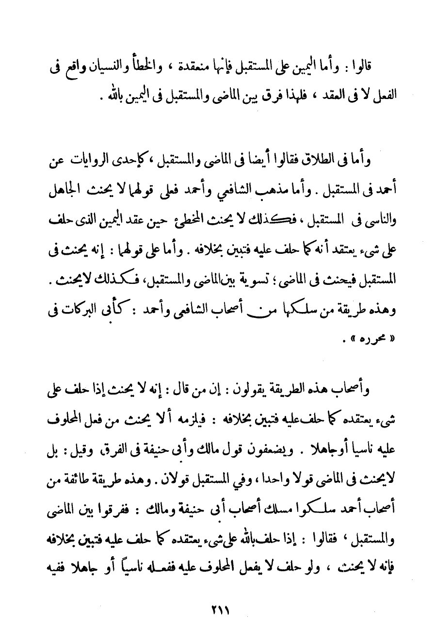 وَأَمَّا الْيَمِينُ عَلَى الْمُسْتَقْبَلِ فَإِنَّهَا مُنْعَقِدَةٌ وَالْخَطَأُ وَالنِّسْيَانُ وَاقِعٌ فِي الْفِعْلِ لَا فِي الْعَقْدِ فَلِهَذَا فَرَّقَ بَيْنَ الْمَاضِي وَالْمُسْتَقْبَلِ فِي الْيَمِينِ بِاَللَّهِ. وَأَمَّا فِي الطَّلَاقِ فَقَالُوا أَيْضًا فِي الْمَاضِي وَالْمُسْتَقْبَلِ كَإِحْدَى الرِّوَايَاتِ عَنْ أَحْمَد فِي الْمُسْتَقْبَلِ. وَأَمَّا مَذْهَبُ الشَّافِعِيِّ وَأَحْمَد فَعَلَى قَوْلِهِمَا لَا يَحْنَثُ الْجَاهِلُ وَالنَّاسِي فِي الْمُسْتَقْبَلِ فَكَذَلِكَ لَا يَحْنَثُ الْمُخْطِئُ حِينَ عَقَدَ الْيَمِينَ الَّذِي حَلَفَ عَلَى شَيْءٍ يَعْتَقِدُ أَنَّهُ كَمَا حَلَفَ عَلَيْهِ فَتَبَيَّنَ بِخِلَافِهِ. وَأَمَّا عَلَى قَوْلِهِمَا: إنَّهُ يَحْنَثُ فِي الْمُسْتَقْبَلِ فَيَحْنَثُ فِي الْمَاضِي؛ تَسْوِيَةً بَيْنَ الْمَاضِي وَالْمُسْتَقْبَلِ فَكَذَلِكَ لَا يَحْنَثُ. وَهَذِهِ طَرِيقَةُ مَنْ سَلَكَهَا مِنْ أَصْحَابِ الشَّافِعِيِّ وَأَحْمَد: كَأَبِي الْبَرَكَاتِ فِي " مُحَرَّرِهِ ". وَأَصْحَابُ هَذِهِ الطَّرِيقَةِ يَقُولُونَ: إنَّ مَنْ قَالَ: إنَّهُ لَا يَحْنَثُ إذَا حَلَفَ عَلَى شَيْءٍ يَعْتَقِدُهُ كَمَا حَلَفَ عَلَيْهِ فَتَبَيَّنَ بِخِلَافِهِ: فَيَلْزَمُهُ أَلَّا يَحْنَثَ مِنْ فِعْلِ الْمَحْلُوفِ عَلَيْهِ نَاسِيًا أَوْ جَاهِلًا. وَيُضَعِّفُونَ قَوْلَ مَالِكٍ وَأَبِي حَنِيفَةَ فِي الْفَرْقِ وَقِيلَ: بَلْ لَا يَحْنَثُ فِي الْمَاضِي قَوْلًا وَاحِدًا وَفِي الْمُسْتَقْبَلِ قَوْلَانِ. وَهَذِهِ طَرِيقَةُ طَائِفَةٍ مِنْ أَصْحَابِ أَحْمَد سَلَكُوا مَسْلَكَ أَصْحَابِ أَبِي حَنِيفَةَ وَمَالِكٍ: فَفَرَّقُوا بَيْنَ الْمَاضِي وَالْمُسْتَقْبَلِ فَقَالُوا: إذَا حَلَفَ بِاَللَّهِ عَلَى شَيْءٍ يَعْتَقِدُهُ كَمَا حَلَفَ عَلَيْهِ فَتَبَيَّنَ بِخِلَافِهِ فَإِنَّهُ لَا يَحْنَثُ وَلَوْ حَلَفَ لَا يَفْعَلُ الْمَحْلُوفَ عَلَيْهِ فَفَعَلَهُ نَاسِيًا أَوْ جَاهِلًا فَفِيهِ