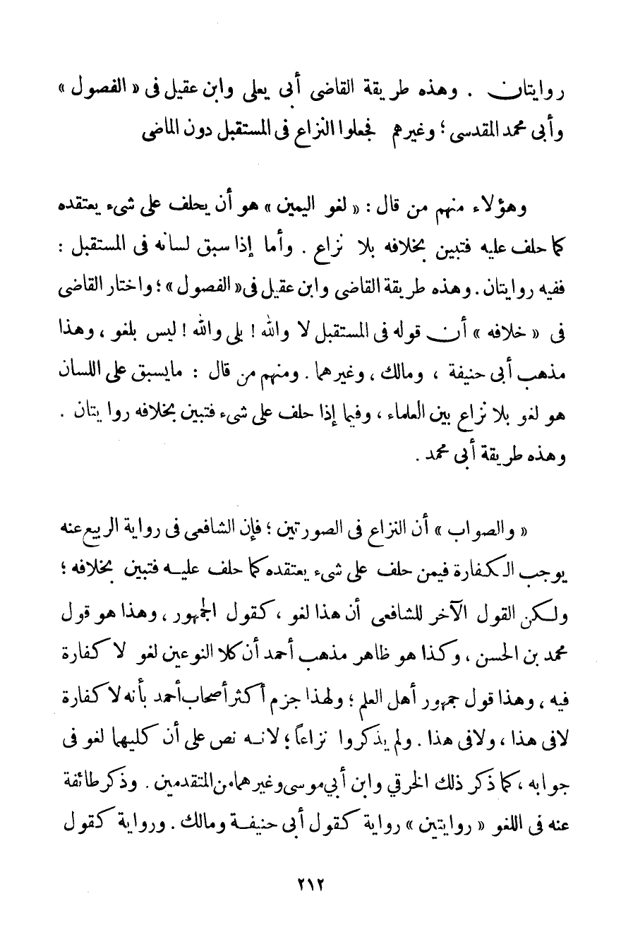 رِوَايَتَانِ. وَهَذِهِ طَرِيقَةُ الْقَاضِي أَبِي يَعْلَى وَابْنِ عَقِيلٍ فِي " الْفُصُولِ " وَأَبِي مُحَمَّدٍ المقدسي؛ وَغَيْرِهِمْ فَجَعَلُوا النِّزَاعَ فِي الْمُسْتَقْبَلِ دُونَ الْمَاضِي. وَهَؤُلَاءِ مِنْهُمْ مَنْ قَالَ: " لَغْوُ الْيَمِينِ " هُوَ أَنْ يَحْلِفَ عَلَى شَيْءٍ يَعْتَقِدُهُ كَمَا حَلَفَ عَلَيْهِ فَتَبَيَّنَ بِخِلَافِهِ بِلَا نِزَاعٍ. وَأَمَّا إذَا سَبَقَ لِسَانُهُ فِي الْمُسْتَقْبَلِ: فَفِيهِ رِوَايَتَانِ. وَهَذِهِ طَرِيقَةُ الْقَاضِي وَابْنِ عَقِيلٍ فِي " الْفُصُولِ "؛ وَاخْتَارَ الْقَاضِي فِي " خِلَافِهِ " أَنَّ قَوْلَهُ فِي الْمُسْتَقْبَلِ لَا وَاَللَّهِ بَلَى وَاَللَّهِ لَيْسَ بِلَغْوِ وَهَذَا مَذْهَبُ أَبِي حَنِيفَةَ وَمَالِكٍ وَغَيْرِهِمَا. وَمِنْهُمْ مَنْ قَالَ: مَا يَسْبِقُ عَلَى اللِّسَانِ هُوَ لَغْوٌ بِلَا نِزَاعٍ بَيْنَ الْعُلَمَاءِ وَفِيمَا إذَا حَلَفَ عَلَى شَيْءٍ فَتَبَيَّنَ بِخِلَافِهِ رِوَايَتَانِ. وَهَذِهِ طَرِيقَةُ أَبِي مُحَمَّدٍ. " وَالصَّوَابُ " أَنَّ النِّزَاعَ فِي الصُّورَتَيْنِ؛ فَإِنَّ الشَّافِعِيَّ فِي رِوَايَةِ الرَّبِيعِ عَنْهُ يُوجِبُ الْكَفَّارَةَ فِيمَنْ حَلَفَ عَلَى شَيْءٍ يَعْتَقِدُهُ كَمَا حَلَفَ عَلَيْهِ فَتَبَيَّنَ بِخِلَافِهِ؛ وَلَكِنَّ الْقَوْلَ الْآخَرَ لِلشَّافِعِيِّ أَنَّ هَذَا لَغْوٌ كَقَوْلِ الْجُمْهُورِ وَهَذَا هُوَ قَوْلُ مُحَمَّدِ بْنِ الْحَسَنِ وَكَذَا هُوَ ظَاهِرُ مَذْهَبِ أَحْمَد أَنَّ كِلَا النَّوْعَيْنِ لَغْوٌ لَا كَفَّارَةَ فِيهِ وَهَذَا قَوْلُ جُمْهُورِ أَهْلِ الْعِلْمِ؛ وَلِهَذَا جَزَمَ أَكْثَرُ أَصْحَابِ أَحْمَد بِأَنَّهُ لَا كَفَّارَةَ لَا فِي هَذَا وَلَا فِي هَذَا. وَلَمْ يَذْكُرُوا نِزَاعًا؛ لِأَنَّهُ نَصَّ عَلَى أَنَّ كِلَيْهِمَا لَغْوٌ فِي جَوَابِهِ كَمَا ذَكَرَ ذَلِكَ الخرقي وَابْنُ أَبِي مُوسَى وَغَيْرُهُمَا مِنْ الْمُتَقَدِّمِينَ. وَذَكَرَ طَائِفَةٌ عَنْهُ فِي اللَّغْوِ " رِوَايَتَيْنِ " رِوَايَةً كَقَوْلِ أَبِي حَنِيفَةَ وَمَالِكٍ. وَرِوَايَةً كَقَوْلِ