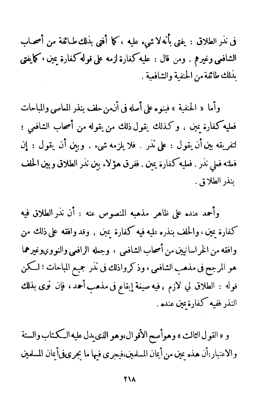 فِي نَذْرِ الطَّلَاقِ: يُفْتِي بِأَنَّهُ لَا شَيْءَ عَلَيْهِ كَمَا أَفْتَى بِذَلِكَ طَائِفَةٌ مِنْ أَصْحَابِ الشَّافِعِيِّ وَغَيْرِهِمْ وَمَنْ قَالَ: عَلَيْهِ كَفَّارَةٌ لَزِمَهُ عَلَى قَوْلِهِ كَفَّارَةُ يَمِينٍ كَمَا يُفْتَى بِذَلِكَ طَائِفَةٌ مِنْ الْحَنَفِيَّةِ وَالشَّافِعِيَّةِ. وَأَمَّا " الْحَنَفِيَّةُ " فَبَنَوْهُ عَلَى أَصْلِهِ فِي أَنَّ مَنْ حَلَفَ بِنَذْرِ الْمَعَاصِي وَالْمُبَاحَاتِ فَعَلَيْهِ كَفَّارَةُ يَمِينٍ وَكَذَلِكَ يَقُولُ ذَلِكَ مَنْ يَقُولُهُ مِنْ أَصْحَابِ الشَّافِعِيِّ؛ لِتَفْرِيقِهِ بَيْنَ أَنْ يَقُولَ: عَلَيَّ نَذْرٌ. فَلَا يَلْزَمُهُ شَيْءٌ. وَبَيْنَ أَنْ يَقُولَ: إنْ فَعَلْته فَعَلَيَّ نَذْرٌ. فَعَلَيْهِ كَفَّارَةُ يَمِينٍ. فَفَرَّقَ هَؤُلَاءِ بَيْنَ نَذْرِ الطَّلَاقِ وَبَيْنَ الْحَلِفِ بِنَذْرِ الطَّلَاقِ.