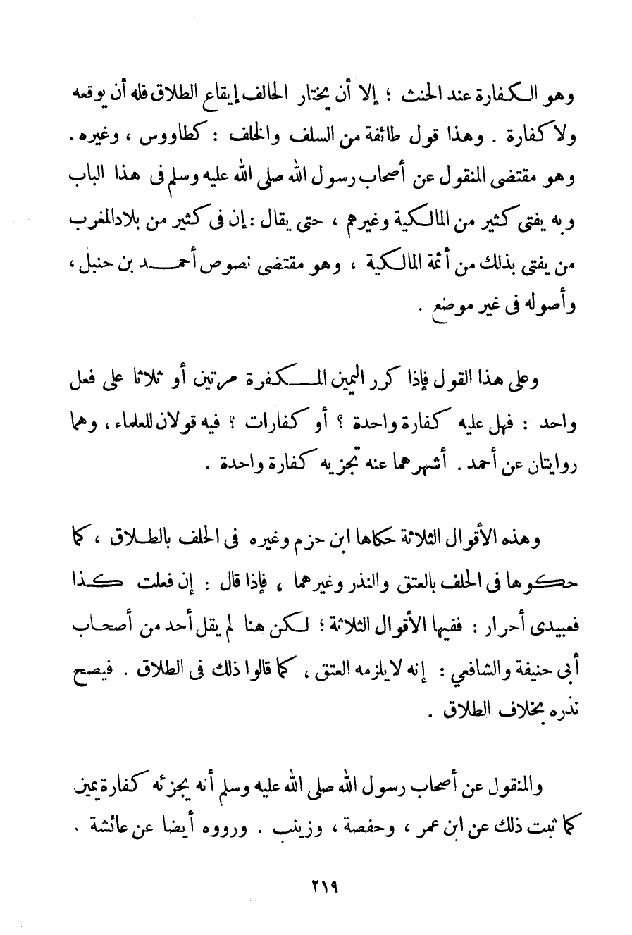 إلَّا أَنْ يَخْتَارَ الْحَالِفُ إيقَاعَ الطَّلَاقِ فَلَهُ أَنْ يُوقِعَهُ وَلَا كَفَّارَةَ. وَهَذَا قَوْلُ طَائِفَةٍ مِنْ السَّلَفِ وَالْخَلَفِ: كَطَاوُوسِ وَغَيْرِهِ. وَهُوَ مُقْتَضَى الْمَنْقُولِ عَنْ أَصْحَابِ رَسُولِ اللَّهِ صَلَّى اللَّهُ عَلَيْهِ وَسَلَّمَ فِي هَذَا الْبَابِ وَبِهِ يُفْتِي كَثِيرٌ مِنْ الْمَالِكِيَّةِ وَغَيْرِهِمْ حَتَّى يُقَالَ: إنَّ فِي كَثِيرٍ مِنْ بِلَادِ الْمَغْرِبِ مَنْ يُفْتِي بِذَلِكَ مِنْ أَئِمَّةِ الْمَالِكِيَّةِ وَهُوَ مُقْتَضَى نُصُوصِ أَحْمَد بْنِ حَنْبَلٍ وَأُصُولُهُ فِي غَيْرِ مَوْضِعٍ. وَعَلَى هَذَا الْقَوْلِ فَإِذَا كَرَّرَ الْيَمِينَ الْمُكَفِّرَةَ مَرَّتَيْنِ أَوْ ثَلَاثًا عَلَى فِعْلٍ وَاحِدٍ: فَهَلْ عَلَيْهِ كَفَّارَةٌ وَاحِدَةٌ؟ أَوْ كَفَّارَاتٌ؟ فِيهِ قَوْلَانِ لِلْعُلَمَاءِ وَهُمَا رِوَايَتَانِ عَنْ أَحْمَد. أَشْهَرُهُمَا عَنْهُ تَجْزِيه كَفَّارَةٌ وَاحِدَةٌ. وَهَذِهِ الْأَقْوَالُ الثَّلَاثَةُ حَكَاهَا ابْنُ حَزْمٍ وَغَيْرُهُ فِي الْحَلِف بِالطَّلَاقِ كَمَا حَكَوْهَا فِي الْحَلِفِ بِالْعِتْقِ وَالنَّذْرِ وَغَيْرِهِمَا فَإِذَا قَالَ: إنْ فَعَلْت كَذَا فَعَبِيدِي أَحْرَارٌ: فَفِيهَا الْأَقْوَالُ الثَّلَاثَةُ؛ لَكِنْ هُنَا لَمْ يَقُلْ أَحَدٌ مِنْ أَصْحَابِ أَبِي حَنِيفَةَ وَالشَّافِعِيِّ: إنَّهُ لَا يَلْزَمُهُ الْعِتْقُ كَمَا قَالُوا ذَلِكَ فِي الطَّلَاقِ. فَيَصِحُّ نَذْرُهُ بِخِلَافِ الطَّلَاقِ. وَالْمَنْقُولُ عَنْ أَصْحَابِ رَسُولِ اللَّهِ صَلَّى اللَّهُ عَلَيْهِ وَسَلَّمَ أَنَّهُ يُجْزِئُهُ كَفَّارَةُ يَمِينٍ كَمَا ثَبَتَ ذَلِكَ عَنْ ابْنِ عُمَرَ وَحَفْصَةَ وَزَيْنَبَ. وَرَوَوْهُ أَيْضًا عَنْ عَائِشَةَ.