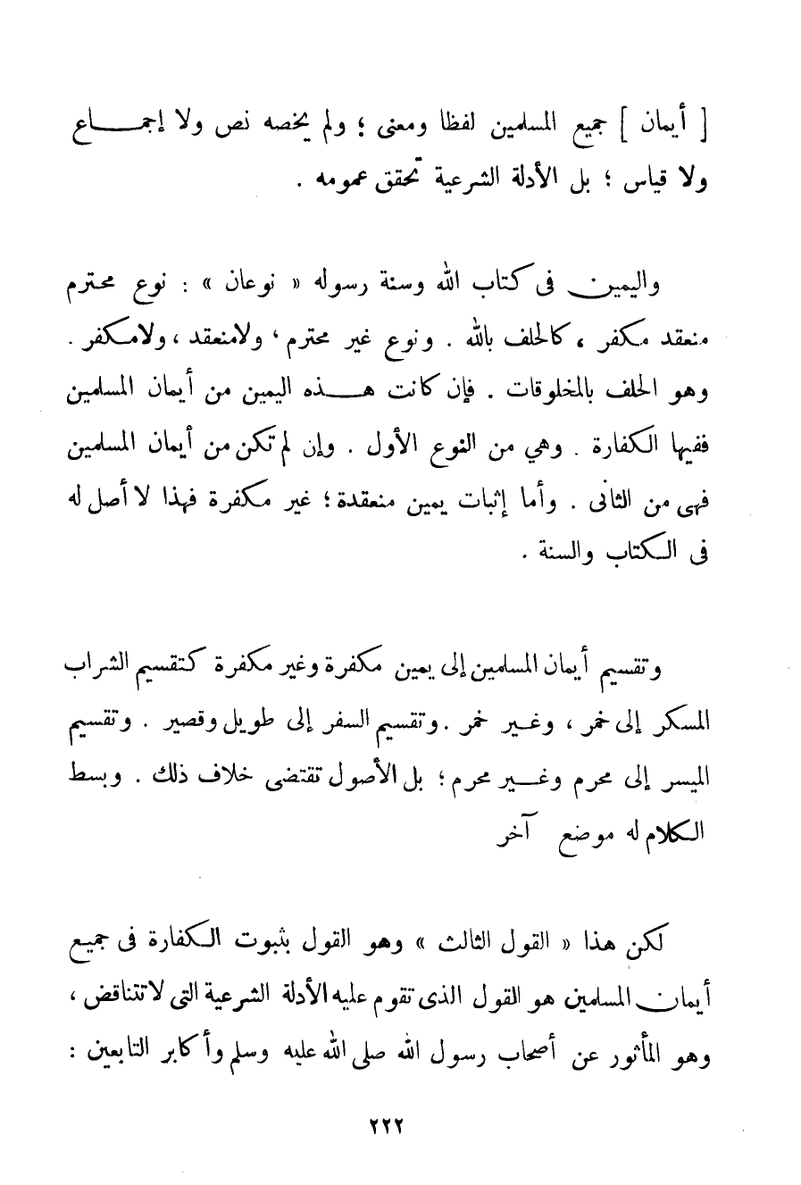 وَالْيَمِينُ فِي كِتَابِ اللَّهِ وَسُنَّةِ رَسُولِهِ " نَوْعَانِ ": نَوْعٌ مُحْتَرَمٌ مُنْعَقِدٌ مُكَفِّرٌ كَالْحَلِفِ بِاَللَّهِ. وَنَوْعٌ غَيْرُ مُحْتَرَمٍ؛ وَلَا مُنْعَقِدٍ وَلَا مُكَفِّرٍ وَهُوَ الْحَلِفُ بِالْمَخْلُوقَاتِ. فَإِنْ كَانَتْ هَذِهِ الْيَمِينُ مِنْ أَيْمَانِ الْمُسْلِمِينَ فَفِيهَا الْكَفَّارَةُ. وَهِيَ مِنْ النَّوْعِ الْأَوَّلِ. وَإِنْ لَمْ تَكُنْ مِنْ أَيْمَانِ الْمُسْلِمِينَ فَهِيَ مِنْ الثَّانِي. وَأَمَّا إثْبَاتُ يَمِينٍ مُنْعَقِدَةٍ؛ غَيْرِ مُكَفِّرَةٍ فَهَذَا لَا أَصْلَ لَهُ فِي الْكِتَابِ وَالسُّنَّةِ. وَتَقْسِيمُ أَيْمَانِ الْمُسْلِمِينَ إلَى يَمِينٍ مُكَفِّرَةٍ وَغَيْرِ مُكَفِّرَةٍ كَتَقْسِيمِ الشَّرَابِ الْمُسْكِرِ إلَى خَمْرٍ وَغَيْرِ خَمْرٍ. وَتَقْسِيمِ السَّفَرِ إلَى طَوِيلٍ وَقَصِيرٍ. وَتَقْسِيمِ الْمُيَسَّرِ إلَى مُحَرَّمٍ وَغَيْرِ مُحَرَّمٍ؛ بَلْ الْأُصُولُ تَقْتَضِي خِلَافَ ذَلِكَ. وَبَسْطُ الْكَلَامِ لَهُ مَوْضُوعٌ آخَرُ لَكِنَّ هَذَا " الْقَوْلَ الثَّالِثَ " وَهُوَ الْقَوْلُ بِثُبُوتِ الْكَفَّارَةِ فِي جَمِيعِ أَيْمَانِ الْمُسْلِمِينَ هُوَ الْقَوْلُ الَّذِي تَقُومُ عَلَيْهِ الْأَدِلَّةُ الشَّرْعِيَّةُ الَّتِي لَا تَتَنَاقَضُ وَهُوَ الْمَأْثُورُ عَنْ أَصْحَابِ رَسُولِ اللَّهِ صَلَّى اللَّهُ عَلَيْهِ وَسَلَّمَ وَأَكَابِرِ التَّابِعِينَ: