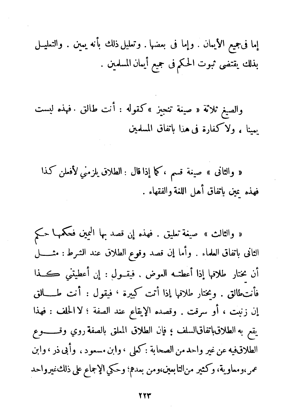 إمَّا فِي جَمِيعِ الْأَيْمَانِ. وَإِمَّا فِي بَعْضِهَا. وَتَعْلِيلُ ذَلِكَ بِأَنَّهُ يَمِينٌ. وَالتَّعْلِيلُ بِذَلِكَ يَقْتَضِي ثُبُوتَ الْحُكْمِ فِي جَمِيعِ أَيْمَانِ الْمُسْلِمِينَ. وَالصِّيَغُ ثَلَاثَةٌ " صِيغَةُ تَنْجِيزٍ " كَقَوْلِهِ: أَنْتِ طَالِقٌ فَهَذِهِ لَيْسَتْ يَمِينًا وَلَا كَفَّارَةَ فِي هَذَا بِاتِّفَاقِ الْمُسْلِمِينَ " وَالثَّانِي " صِيغَةُ قَسَمٍ كَمَا إذَا قَالَ: الطَّلَاقُ يَلْزَمُنِي لَأَفْعَلَنَّ كَذَا فَهَذِهِ يَمِينٌ بِاتِّفَاقِ أَهْلِ اللُّغَةِ وَالْفُقَهَاءِ. " وَالثَّالِثُ " صِيغَةُ تَعْلِيقٍ. فَهَذِهِ إنْ قَصَدَ بِهَا الْيَمِينَ فَحُكْمُهَا حُكْمُ الثَّانِي بِاتِّفَاقِ الْعُلَمَاءِ. وَأَمَّا إنْ قَصَدَ وُقُوعَ الطَّلَاقِ عِنْدَ الشَّرْطِ: مِثْلَ أَنْ يَخْتَارَ طَلَاقَهَا إذَا أَعْطَتْهُ الْعِوَضَ فَيَقُولُ: إنْ أَعْطَيْتِنِي كَذَا فَأَنْتِ طَالِقٌ. وَيَخْتَارُ طَلَاقَهَا إذَا أَتَتْ كَبِيرَةً فَيَقُولُ: أَنْتِ طَالِقٌ إنْ زَنَيْت أَوْ سَرَقْت. وَقَصْدُهُ الْإِيقَاعَ عِنْدَ الصِّفَةِ؛ لَا الْحَلِفِ: فَهَذَا يَقَعُ بِهِ الطَّلَاقُ بِاتِّفَاقِ السَّلَفِ؛ فَإِنَّ الطَّلَاقَ الْمُعَلَّقَ بِالصِّفَةِ رُوِيَ وُقُوعُ الطَّلَاقِ فِيهِ عَنْ غَيْرِ وَاحِدٍ مِنْ الصَّحَابَةِ: كَعَلِيِّ وَابْنِ مَسْعُودٍ وَأَبِي ذَرٍّ وَابْنِ عُمَرَ وَمُعَاوِيَةَ وَكَثِيرٍ مِنْ التَّابِعِينَ وَمَنْ بَعْدَهُمْ وَحَكَى الْإِجْمَاعَ عَلَى ذَلِكَ غَيْرُ وَاحِدٍ