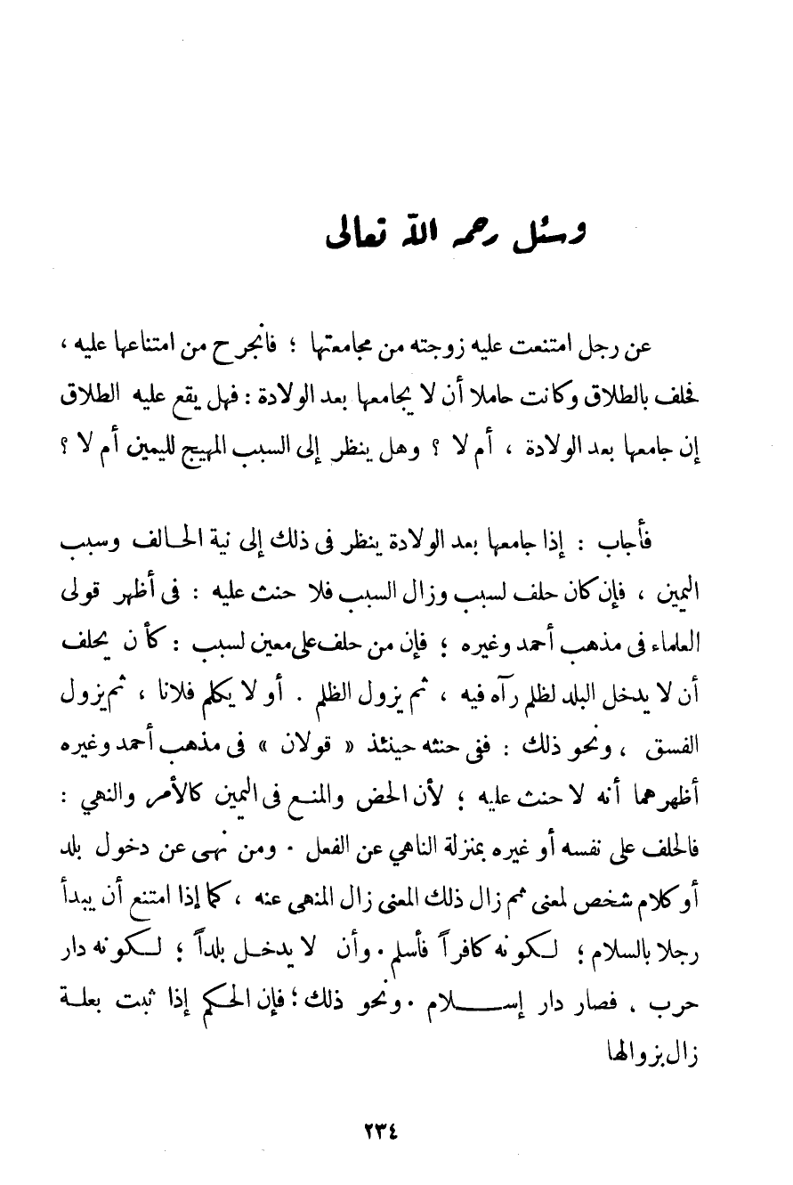 إذَا جَامَعَهَا بَعْدَ الْوِلَادَةِ يُنْظَرُ فِي ذَلِكَ إلَى نِيَّةِ الْحَالِفِ وَسَبَبِ الْيَمِينِ فَإِنْ كَانَ حَلَفَ لِسَبَبِ وَزَالَ السَّبَبُ فَلَا حِنْثَ عَلَيْهِ: فِي أَظْهَرِ قَوْلَيْ الْعُلَمَاءِ فِي مَذْهَبِ أَحْمَد وَغَيْرِهِ؛ فَإِنَّ مَنْ حَلَفَ عَلَى مُعَيَّنٍ لِسَبَبِ: كَأَنْ يَحْلِفَ أَنْ لَا يَدْخُلَ الْبَلَدَ لِظُلْمِ رَآهُ فِيهِ ثُمَّ يَزُولُ الظُّلْمُ. أَوْ لَا يُكَلِّمُ فُلَانًا ثُمَّ يَزُولُ الْفِسْقُ وَنَحْوُ ذَلِكَ: فَفِي حِنْثِهِ حِينَئِذٍ " قَوْلَانِ " فِي مَذْهَبِ أَحْمَد وَغَيْرِهِ أَظْهَرُهُمَا أَنَّهُ لَا حِنْثَ عَلَيْهِ؛ لِأَنَّ الْحَضَّ وَالْمَنْعَ فِي الْيَمِينِ كَالْأَمْرِ وَالنَّهْيِ: فَالْحَلِفُ كُلُّ نَفْسِهِ أَوْ غَيْرِهِ بِمَنْزِلَةِ النَّاهِي عَنْ الْفِعْلِ. وَمَنْ نَهَى عَنْ دُخُولِ بَلَدٍ أَوْ كَلَامٍ شُخِّصَ لِمَعْنَى ثُمَّ زَالَ ذَلِكَ الْمَعْنَى زَالَ الْمَنْهِيُّ عَنْهُ كَمَا إذَا امْتَنَعَ أَنْ يَبْدَأَ رَجُلًا بِالسَّلَامِ؛ لِكَوْنِهِ كَافِرًا فَأَسْلَمَ. وَأَنْ لَا يَدْخُلَ بَلَدًا؛ لِكَوْنِهِ دَارَ حَرْبٍ فَصَارَ دَارَ إسْلَامٍ. وَنَحْوَ ذَلِكَ؛ فَإِنَّ الْحُكْمَ إذَا ثَبَتَ بِعِلَّةِ زَالَ بِزَوَالِهَا