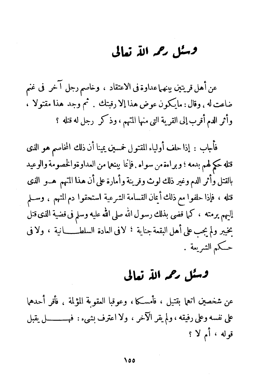 عَنْ أَهْلِ قَرْيَتَيْنِ بَيْنَهُمَا عَدَاوَةٌ فِي الِاعْتِقَادِ وَخَاصَمَ رَجُلٌ آخَرَ فِي غَنَمٍ ضَاعَتْ لَهُ وَقَالَ: مَا يَكُونُ عِوَضُ هَذَا إلَّا رَقَبَتَك. ثُمَّ وُجِدَ هَذَا مَقْتُولًا وَأَثَرُ الدَّمِ أَقْرَبُ إلَى الْقَرْيَةِ الَّتِي مِنْهَا الْمُتَّهَمُ وَذَكَرَ رَجُلٌ لَهُ قَتَلَهُ؟