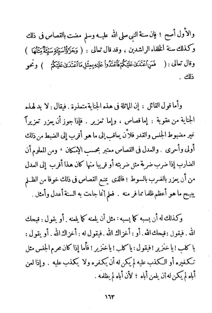 وَالْأَوَّلُ أَصَحُّ؛ فَإِنَّ سُنَّةَ النَّبِيِّ صَلَّى اللَّهُ عَلَيْهِ وَسَلَّمَ مَضَتْ بِالْقِصَاصِ فِي ذَلِكَ وَكَذَلِكَ سُنَّةُ الْخُلَفَاءِ الرَّاشِدِينَ وَقَدْ قَالَ تَعَالَى: {وَجَزَاءُ سَيِّئَةٍ سَيِّئَةٌ مِثْلُهَا} وَقَالَ تَعَالَى: {فَمَنِ اعْتَدَى عَلَيْكُمْ فَاعْتَدُوا عَلَيْهِ بِمِثْلِ مَا اعْتَدَى عَلَيْكُمْ} وَنَحْوَ ذَلِكَ. وَأَمَّا قَوْلُ الْقَائِلِ: إنَّ الْمُمَاثَلَةَ فِي هَذِهِ الْجِنَايَةِ مُتَعَذِّرَةٌ. فَيُقَالُ: لَا بُدَّ لِهَذِهِ الْجِنَايَةِ مِنْ عُقُوبَةٍ: إمَّا قِصَاصٌ وَإِمَّا تَعْزِيرٌ. فَإِذَا جُوِّزَ أَنْ يُعَزَّزَ تَعْزِيرًا غَيْرَ مَضْبُوطِ الْجِنْسِ وَالْقَدْرِ فَلَأَنْ يُعَاقِبَ إلَى مَا هُوَ أَقْرَبُ إلَى الضَّبْطِ مِنْ ذَلِكَ أَوْلَى وَأَحْرَى. وَالْعَدْلُ فِي الْقِصَاصِ مُعْتَبَرٌ بِحَسَبِ الْإِمْكَانِ وَمِنْ الْمَعْلُومِ أَنَّ الضَّارِبَ إذَا ضُرِبَ ضَرْبَةً مِثْلَ ضَرْبَتِهِ أَوْ قَرِيبًا مِنْهَا كَانَ هَذَا أَقْرَبَ إلَى الْعَدْلِ مِنْ أَنْ يُعَزَّرَ بِالضَّرْبِ بِالسَّوْطِ؛ فَاَلَّذِي يَمْنَعُ الْقِصَاصَ فِي ذَلِكَ خَوْفًا مِنْ الظُّلْمِ يُبِيحُ مَا هُوَ أَعْظَمُ ظُلْمًا مِمَّا فَرَّ مِنْهُ. فَعُلِمَ أَنَّمَا جَاءَتْ بِهِ السُّنَّةُ أَعْدَلُ وَأَمْثَلُ. وَكَذَلِكَ لَهُ أَنْ يَسُبَّهُ كَمَا يَسُبُّهُ: مِثْلَ أَنْ يَلْعَنَهُ كَمَا يَلْعَنُهُ. أَوْ يَقُولُ: قَبَّحَك اللَّهُ. فَيَقُولُ: قَبَّحَك اللَّهُ. أَوْ: أَخْزَاك اللَّهُ. فَيَقُولُ لَهُ: أَخْزَاك اللَّهُ. أَوْ يَقُولُ: يَا كَلْبُ يَا خِنْزِيرُ فَيَقُولُ: يَا كَلْبُ يَا خِنْزِيرُ فَأَمَّا إذَا كَانَ مُحَرَّمَ الْجِنْسِ مِثْلَ تَكْفِيرِهِ أَوْ الْكَذِبِ عَلَيْهِ لَمْ يَكُنْ لَهُ أَنْ يُكَفِّرَهُ وَلَا يَكْذِبَ عَلَيْهِ. وَإِذَا لَعَنَ أَبَاهُ لَمْ يَكُنْ لَهُ أَنْ يَلْعَنَ أَبَاهُ لِأَنَّ أَبَاهُ لَمْ يَظْلِمْهُ.