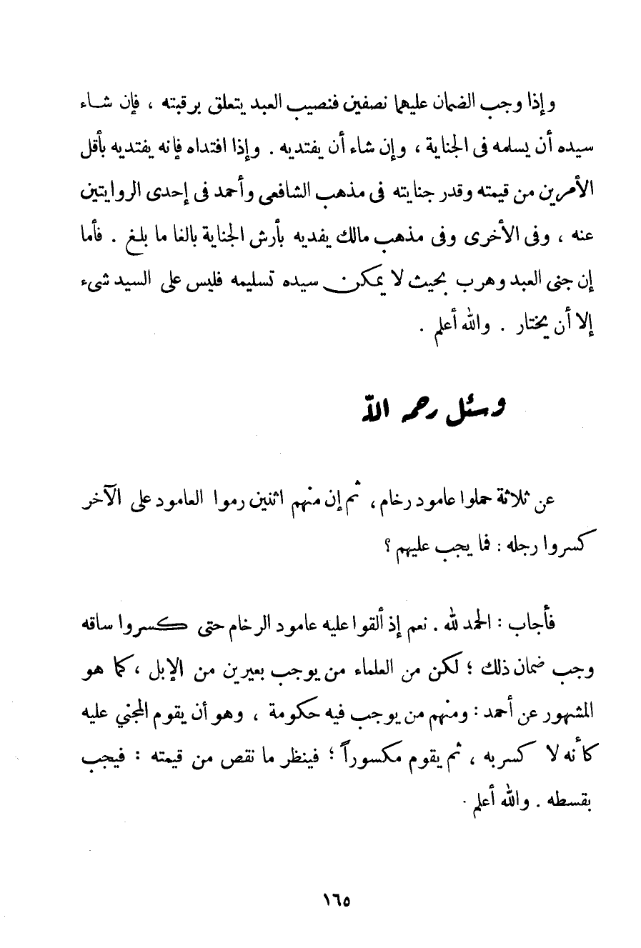 الْحَمْدُ لِلَّهِ، نَعَمْ إذَا أَلْقَوْا عَلَيْهِ عَمُودَ الرُّخَامِ حَتَّى كَسَرُوا سَاقَهُ وَجَبَ ضَمَانُ ذَلِكَ؛ لَكِنْ مِنْ الْعُلَمَاءِ مَنْ يُوجِبُ بَعِيرَيْنِ مِنْ الْإِبِلِ كَمَا هُوَ الْمَشْهُورُ عَنْ أَحْمَد: وَمِنْهُمْ مَنْ يُوجِبُ فِيهِ حُكُومَةً وَهُوَ أَنْ يُقَوَّمَ الْمَجْنِيُّ عَلَيْهِ كَأَنَّهُ لَا كَسْرَ بِهِ ثُمَّ يُقَوَّمَ مَكْسُورًا؛ فَيُنْظَرُ مَا نَقَصَ مِنْ قِيمَتِهِ: فَيَجِبُ بِقِسْطِهِ. وَاَللَّهُ أَعْلَمُ.