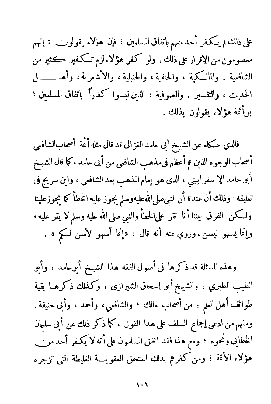 عَلَى ذَلِكَ لَمْ يُكَفَّرْ أَحَدٌ مِنْهُمْ بِاتِّفَاقِ الْمُسْلِمِينَ؛ فَإِنَّ هَؤُلَاءِ يَقُولُونَ: إنَّهُمْ مَعْصُومُونَ مِنْ الْإِقْرَارِ عَلَى ذَلِكَ، وَلَوْ كَفَرَ هَؤُلَاءِ لَزِمَ تَكْفِيرُ كَثِيرٍ مِنْ الشَّافِعِيَّةِ، وَالْمَالِكِيَّةِ، وَالْحَنَفِيَّةِ، وَالْحَنْبَلِيَّةِ، وَالْأَشْعَرِيَّةِ، وَأَهْلِ الْحَدِيثِ، وَالتَّفْسِيرِ، وَالصُّوفِيَّةِ: الَّذِينَ لَيْسُوا كُفَّارًا بِاتِّفَاقِ الْمُسْلِمِينَ؛ بَلْ أَئِمَّةُ هَؤُلَاءِ يَقُولُونَ بِذَلِك. فَاَلَّذِي حَكَاهُ عَنْ الشَّيْخِ أَبِي حَامِدٍ الْغَزَالِيِّ قَدْ قَالَ مِثْلَهُ أَئِمَّةُ أَصْحَابِ الشَّافِعِيِّ أَصْحَابُ الْوُجُوهِ الَّذِينَ هُمْ أَعْظَمُ فِي مَذْهَبِ الشَّافِعِيِّ مِنْ أَبِي حَامِدٍ، كَمَا قَالَ الشَّيْخُ أَبُو حَامِدٍ الإسفراييني، الَّذِي هُوَ إمَامُ الْمَذْهَبِ بَعْدَ الشَّافِعِيِّ، وَابْنُ سُرَيْجٍ فِي تَعْلِيقِهِ: وَذَلِك أَنَّ عِنْدَنَا أَنَّ النَّبِيَّ صَلَّى اللَّهُ عَلَيْهِ وَسَلَّمَ يَجُوزُ عَلَيْهِ الْخَطَأُ كَمَا يَجُوزُ عَلَيْنَا وَلَكِنَّ الْفَرَقَ بَيْنَنَا أَنَّا نَقِرُّ عَلَى الْخَطَأِ وَالنَّبِيُّ صَلَّى اللَّهُ عَلَيْهِ وَسَلَّمَ لَا يَقِرُّ عَلَيْهِ، وَإِنَّمَا يَسْهُو لِيَسُنَّ، وَرُوِيَ عَنْهُ أَنَّهُ قَالَ: {إنَّمَا أَسْهُو لِأَسُنَّ لَكُمْ} . وَهَذِهِ الْمَسْأَلَةُ قَدْ ذَكَرَهَا فِي أُصُولِ الْفِقْهِ هَذَا الشَّيْخُ أَبُو حَامِدٍ، وَأَبُو الطَّيِّبِ الطبري، وَالشَّيْخُ أَبُو إسْحَاقَ الشِّيرَازِيّ. وَكَذَلِكَ ذَكَرَهَا بَقِيَّةُ طَوَائِفِ أَهْلِ الْعِلْمِ: مِنْ أَصْحَابِ مَالِكٍ، وَالشَّافِعِيِّ، وَأَحْمَد، وَأَبِي حَنِيفَةَ. وَمِنْهُمْ مَنْ ادَّعَى إجْمَاعَ السَّلَفِ عَلَى هَذَا الْقَوْلِ، كَمَا ذُكِرَ ذَلِكَ عَنْ أَبِي سُلَيْمَانَ الخطابي وَنَحْوِهِ؛ وَمَعَ هَذَا فَقَدْ اتَّفَقَ الْمُسْلِمُونَ عَلَى أَنَّهُ لَا يُكَفَّرُ أَحَدٌ مِنْ هَؤُلَاءِ الْأَئِمَّةِ، وَمَنْ كَفَّرَهُمْ بِذَلِكَ اسْتَحَقَّ الْعُقُوبَةَ الْغَلِيظَةَ الَّتِي تَزْجُرُهُ