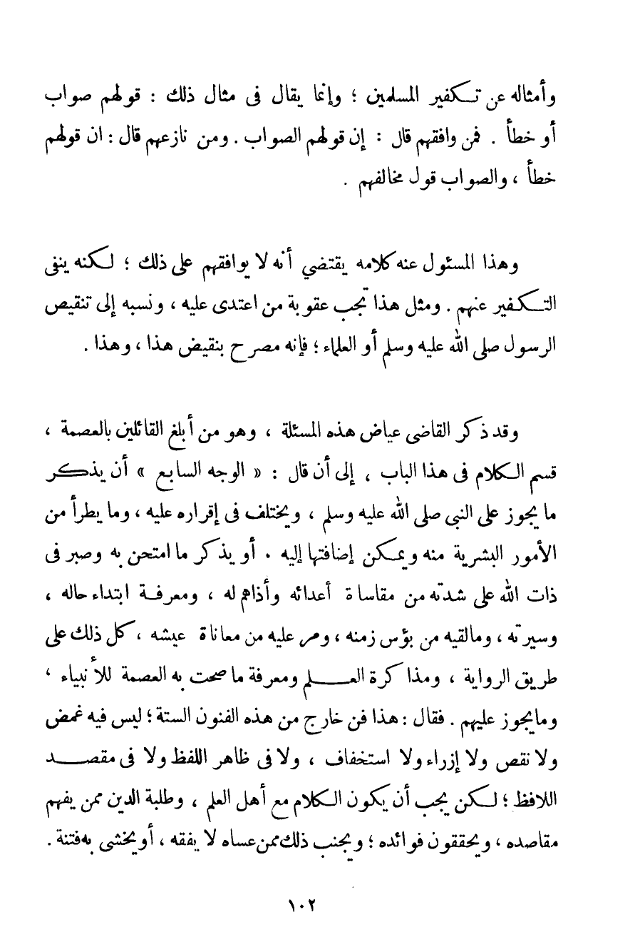 وَأَمْثَالَهُ عَنْ تَكْفِيرِ الْمُسْلِمِينَ؛ وَإِنَّمَا يُقَالُ فِي مِثَالِ ذَلِكَ: قَوْلُهُمْ صَوَابٌ أَوْ خَطَأٌ. فَمَنْ وَافَقَهُمْ قَالَ: إنَّ قَوْلَهُمْ الصَّوَابُ. وَمَنْ نَازَعَهُمْ قَالَ: إنَّ قَوْلَهُمْ خَطَأٌ، وَالصَّوَابُ قَوْلُ مُخَالِفِهِمْ. وَهَذَا الْمَسْئُولُ عَنْهُ كَلَامُهُ يَقْتَضِي أَنَّهُ لَا يُوَافِقُهُمْ عَلَى ذَلِكَ؛ لَكِنَّهُ يَنْفِي التَّكْفِيرَ عَنْهُمْ. وَمِثْلُ هَذَا تَجِبُ عُقُوبَةُ مَنْ اعْتَدَى عَلَيْهِ، وَنَسَبُهُ إلَى تَنْقِيصِ الرَّسُولِ صَلَّى اللَّهُ عَلَيْهِ وَسَلَّمَ أَوْ الْعُلَمَاءِ؛ فَإِنَّهُ مُصَرِّحٌ بِنَقِيضِ هَذَا، وَهَذَا. وَقَدْ ذَكَرَ الْقَاضِي عِيَاضٌ هَذِهِ الْمَسْأَلَةَ، وَهُوَ مِنْ أَبْلَغِ الْقَائِلِينَ بِالْعِصْمَةِ، قَسَّمَ الْكَلَامَ فِي هَذَا الْبَابِ، إلَى أَنْ قَالَ: " الْوَجْهُ السَّابِعُ " أَنْ يَذْكُرَ مَا يَجُوزُ عَلَى النَّبِيِّ صَلَّى اللَّهُ عَلَيْهِ وَسَلَّمَ، وَيَخْتَلِفَ فِي إقْرَارِهِ عَلَيْهِ، وَمَا يَطْرَأُ مِنْ الْأُمُورِ الْبَشَرِيَّةِ مِنْهُ وَيُمْكِنُ إضَافَتُهَا إلَيْهِ. أَوْ يَذْكُرَ مَا اُمْتُحِنَ بِهِ وَصَبَرَ فِي ذَاتِ اللَّهِ عَلَى شِدَّتِهِ مِنْ مُقَاسَاةِ أَعْدَائِهِ وَأَذَاهُمْ لَهُ، وَمَعْرِفَةِ ابْتِدَاءِ حَالِهِ، وَسِيرَتِهِ، وَمَا لَقِيَهُ مِنْ بُؤْسِ زَمَنِهِ، وَمَرَّ عَلَيْهِ مِنْ مُعَانَاتِ عَيْشِهِ، كُلُّ ذَلِكَ عَلَى طَرِيقِ الرِّوَايَةِ، وَمُذَاكَرَةِ الْعِلْمِ وَمَعْرِفَةِ مَا صَحَّتْ بِهِ الْعِصْمَةُ لِلْأَنْبِيَاءِ، وَمَا يَجُوزُ عَلَيْهِمْ. فَقَالَ: هَذَا فَنٌّ خَارِجٌ مِنْ هَذِهِ الْفُنُونِ السِّتَّةِ؛ لَيْسَ فِيهِ غَمْضٌ وَلَا نَقْصٌ وَلَا إزْرَاءٌ وَلَا اسْتِخْفَافٌ، وَلَا فِي ظَاهِرِ اللَّفْظِ وَلَا فِي مَقْصِدِ اللَّافِظِ؛ لَكِنْ يَجِبُ أَنْ يَكُونَ الْكَلَامُ مَعَ أَهْلِ الْعِلْمِ، وَطَلَبَةِ الدِّينِ مِمَّنْ يَفْهَمُ مَقَاصِدَهُ، وَيُحَقِّقُونَ فَوَائِدَهُ؛ وَيُجَنَّبُ ذَلِكَ مِمَّنْ عَسَاهُ لَا يَفْقُهُ، أَوْ يَخْشَى بِهِ فِتْنَةً.
