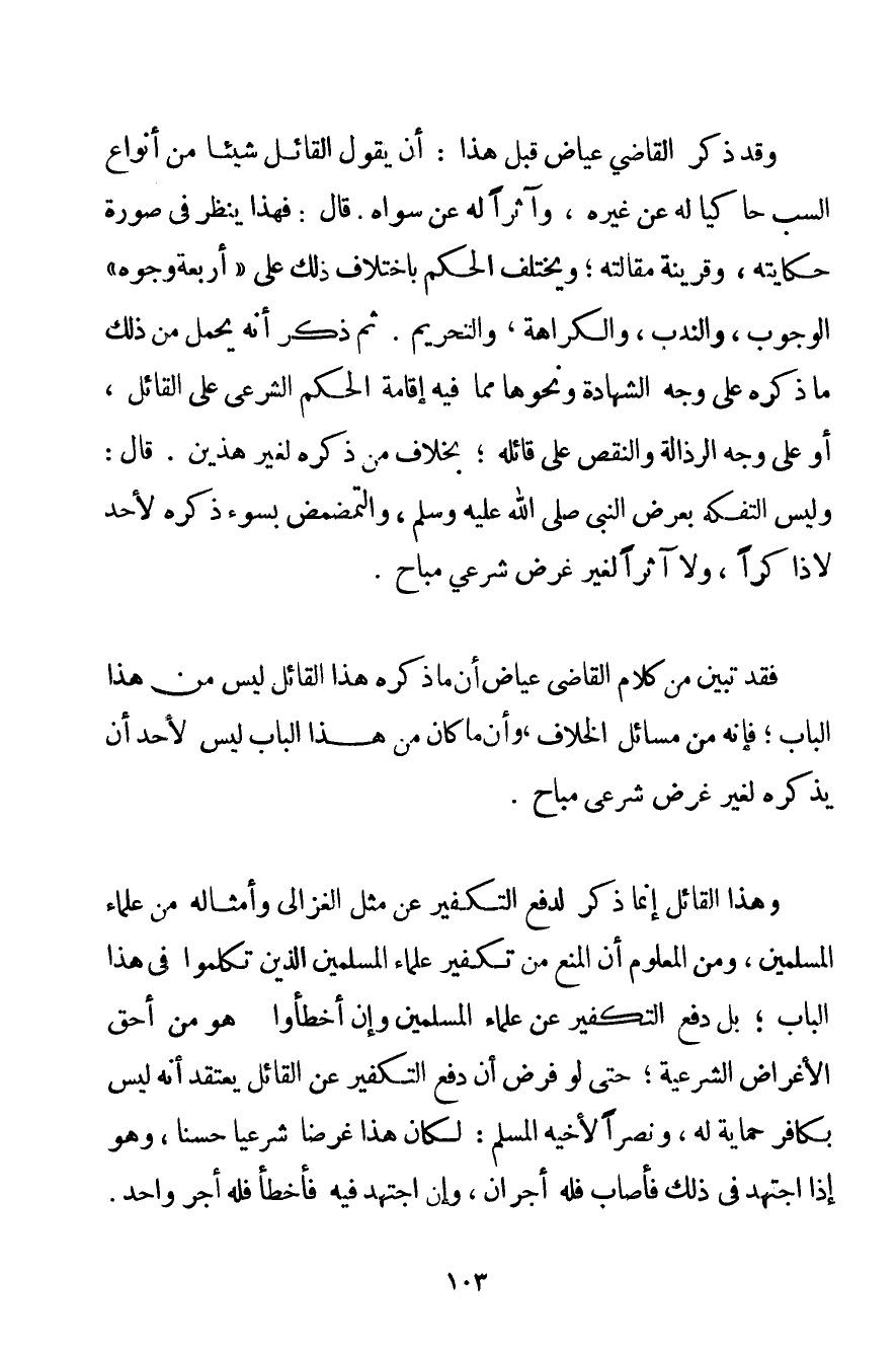 وَقَدْ ذَكَرَ الْقَاضِي عِيَاضٌ قَبْلَ هَذَا: أَنْ يَقُولَ الْقَائِلُ شَيْئًا مِنْ أَنْوَاعِ السَّبِّ حَاكِيًا لَهُ عَنْ غَيْرِهِ، وَآثِرًا لَهُ عَنْ سِوَاهُ. قَالَ: فَهَذَا يُنْظَرُ فِي صُورَةِ حِكَايَتِهِ، وَقَرِينَة مقالته؛ ويختلف الحكم باختلاف ذلك على " أَرْبَعَةِ وُجُوهٍ " الْوُجُوبُ، وَالنَّدْبُ، وَالْكَرَاهَةُ، وَالتَّحْرِيمُ. ثُمَّ ذَكَرَ أَنَّهُ يُحْمَلُ مِنْ ذَلِكَ مَا ذَكَرَهُ عَلَى وَجْهِ الشَّهَادَةِ وَنَحْوِهَا مِمَّا فِيهِ إقَامَةُ الْحُكْمِ الشَّرْعِيِّ عَلَى الْقَائِلِ، أَوْ عَلَى وَجْهِ الرَّذَالَةِ وَالنَّقْصِ عَلَى قَائِلِهِ؛ بِخِلَافِ مَنْ ذَكَرَهُ لِغَيْرِ هَذَيْنِ. قَالَ: وَلَيْسَ التَّفَكُّهُ بِعِرْضِ النَّبِيِّ صَلَّى اللَّهُ عَلَيْهِ وَسَلَّمَ وَالتَّمَضْمُضُ بِسُوءِ ذِكْرِهِ لِأَحَدِ لَا ذَاكِرًا، وَلَا آثِرًا لِغَيْرِ غَرَضٍ شَرْعِيٍّ مُبَاحٍ. فَقَدْ تَبَيَّنَ مِنْ كَلَامِ الْقَاضِي عِيَاضٍ أَنَّ مَا ذَكَرَهُ هَذَا الْقَائِلُ لَيْسَ مِنْ هَذَا الْبَابِ؛ فَإِنَّهُ مِنْ مَسَائِلِ الْخِلَافِ، وَأَنَّ مَا كَانَ مِنْ هَذَا الْبَابِ لَيْسَ لِأَحَدِ أَنْ يَذْكُرَهُ لِغَيْرِ غَرَضٍ شَرْعِيٍّ مُبَاحٍ. وَهَذَا الْقَائِلُ إنَّمَا ذُكِرَ لِدَفْعِ التَّكْفِيرِ عَنْ مِثْلِ الْغَزَالِيِّ وَأَمْثَالِهِ مِنْ عُلَمَاءِ الْمُسْلِمِينَ، وَمِنْ الْمَعْلُومِ أَنَّ الْمَنْعَ مِنْ تَكْفِيرِ عُلَمَاءِ الْمُسْلِمِينَ الَّذِينَ تَكَلَّمُوا فِي هَذَا الْبَابِ؛ بَلْ دَفْعُ التَّكْفِيرِ عَنْ عُلَمَاءِ الْمُسْلِمِينَ وَإِنْ أَخْطَئُوا هُوَ مِنْ أَحَقِّ الْأَغْرَاضِ الشَّرْعِيَّةِ؛ حَتَّى لَوْ فُرِضَ أَنَّ دَفْعَ التَّكْفِيرِ عَنْ الْقَائِلِ يُعْتَقَدُ أَنَّهُ لَيْسَ بِكَافِرِ حِمَايَةً لَهُ، وَنَصْرًا لِأَخِيهِ الْمُسْلِمِ: لَكَانَ هَذَا غَرَضًا شَرْعِيًّا حَسَنًا، وَهُوَ إذَا اجْتَهَدَ فِي ذَلِكَ فَأَصَابَ فَلَهُ أَجْرَانِ، وَإِنْ اجْتَهَدَ فِيهِ فَأَخْطَأَ فَلَهُ أَجْرٌ وَاحِدٌ.