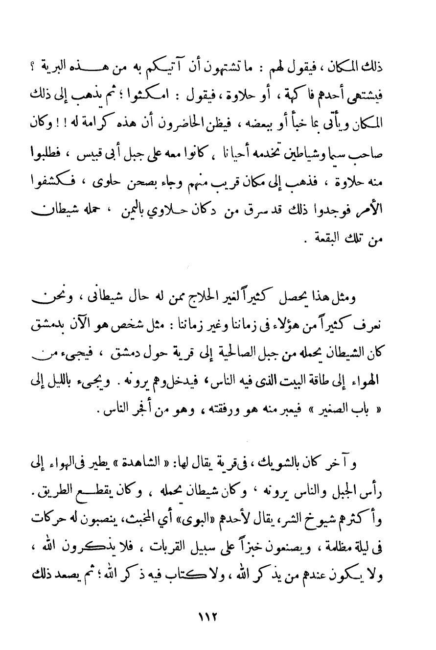 ذَلِكَ الْمَكَانِ فَيَقُولُ لَهُمْ: مَا تَشْتَهُونَ أَنْ آتِيَكُمْ بِهِ مِنْ هَذِهِ الْبَرِيَّةِ؟ فَيَشْتَهِي أَحَدُهُمْ فَاكِهَةً أَوْ حَلَاوَةً فَيَقُولُ: اُمْكُثُوا؛ ثُمَّ يَذْهَبُ إلَى ذَلِكَ الْمَكَانِ وَيَأْتِي بِمَا خَبَّأَ أَوْ بِبَعْضِهِ فَيَظُنُّ الْحَاضِرُونَ أَنَّ هَذِهِ كَرَامَةٌ لَهُ وَكَانَ صَاحِبُ سِيمَا وَشَيَاطِينَ تَخْدِمُهُ أَحْيَانًا كَانُوا مَعَهُ عَلَى جَبَل أَبِي قبيس فَطَلَبُوا مِنْهُ حَلَاوَةً فَذَهَبَ إلَى مَكَانٍ قَرِيبٍ مِنْهُمْ وَجَاءَ بِصَحْنِ حَلْوَى فَكَشَفُوا الْأَمْرَ فَوَجَدُوا ذَلِكَ قَدْ سُرِقَ مِنْ دُكَّانِ حلاوي بِالْيَمَنِ حَمَلَهُ شَيْطَانٌ مِنْ تِلْكَ الْبُقْعَةِ. وَمِثْلُ هَذَا يَحْصُلُ كَثِيرًا لِغَيْرِ الْحَلَّاجِ مِمَّنْ لَهُ حَالٌ شَيْطَانِيٌّ وَنَحْنُ نَعْرِفُ كَثِيرًا مِنْ هَؤُلَاءِ فِي زَمَانِنَا وَغَيْرِ زَمَانِنَا: مِثْلَ شَخْصٍ هُوَ الْآنَ بِدِمَشْقَ كَانَ الشَّيْطَانُ يَحْمِلُهُ مِنْ جَبَلِ الصالحية إلَى قَرْيَةٍ حَوْلَ دِمَشْقَ فَيَجِيءُ مِنْ الْهَوَى إلَى طَاقَةِ الْبَيْتِ الَّذِي فِيهِ النَّاسُ فَيَدْخُلُ وَهُمْ يَرَوْنَهُ. وَيَجِيءُ بِاللَّيْلِ إلَى " بَابِ الصَّغِيرِ " فَيَعْبُرُ مِنْهُ هُوَ وَرُفْقَتُهُ وَهُوَ مِنْ أَفْجَرِ النَّاسِ. وَآخَرُ كَانَ بالشويك فِي قَرْيَةٍ يُقَالُ لَهَا: " الشَّاهِدَةُ " يَطِيرُ فِي الْهَوَاءِ إلَى رَأْسِ الْجَبَلِ وَالنَّاسُ يَرَوْنَهُ وَكَانَ شَيْطَانٌ يَحْمِلُهُ وَكَانَ يَقْطَعُ الطَّرِيقَ. وَأَكْثَرُهُمْ شُيُوخُ الشَّرِّ يُقَالُ لِأَحَدِهِمْ " الْبَوَّيْ " أَيْ الْمُخْبَثُ يَنْصِبُونَ لَهُ حَرَكَاتٍ فِي لَيْلَةٍ مُظْلِمَةٍ وَيَصْنَعُونَ خُبْزًا عَلَى سَبِيلِ الْقُرُبَاتِ فَلَا يَذْكُرُونَ اللَّهَ وَلَا يَكُونُ عِنْدَهُمْ مَنْ يَذْكُرُ اللَّهَ وَلَا كِتَابٌ فِيهِ ذِكْرُ اللَّهِ؛ ثُمَّ يَصْعَدُ ذَلِكَ