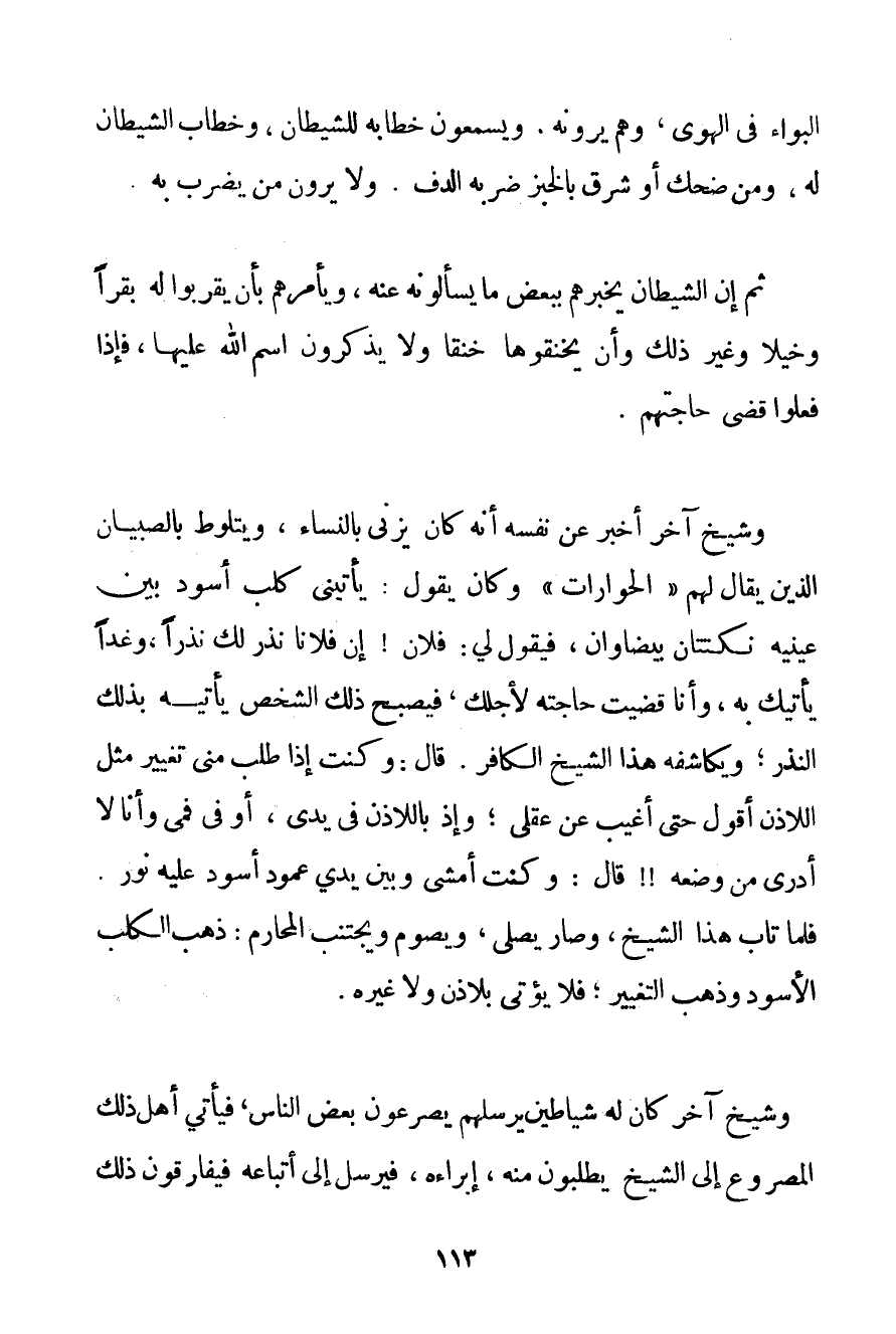 الْبَوَاء فِي الْهَوَى وَهُمْ يَرَوْنَهُ. وَيَسْمَعُونَ خِطَابَهُ لِلشَّيْطَانِ وَخِطَابَ الشَّيْطَانِ لَهُ وَمَنْ ضَحِكَ أَوْ شَرَقَ بِالْخُبْزِ ضَرَبَهُ الدُّفُّ. وَلَا يَرَوْنَ مَنْ يَضْرِبُ بِهِ. ثُمَّ إنَّ الشَّيْطَانَ يُخْبِرُهُمْ بِبَعْضِ مَا يَسْأَلُونَهُ عَنْهُ وَيَأْمُرُهُمْ بِأَنْ يُقَرِّبُوا لَهُ بَقَرًا وَخَيْلًا وَغَيْرَ ذَلِكَ وَأَنْ يَخْنُقُوهَا خَنْقًا وَلَا يَذْكُرُونَ اسْمَ اللَّهِ عَلَيْهَا فَإِذَا فَعَلُوا قَضَى حَاجَتَهُمْ. وَشَيْخٌ آخَرُ أَخْبَرَ عَنْ نَفْسِهِ أَنَّهُ كَانَ يَزْنِي بِالنِّسَاءِ ويتلوط بِالصِّبْيَانِ الَّذِينَ يُقَالُ لَهُمْ " الْحِوَارَات " وَكَانَ يَقُولُ: يَأْتِينِي كَلْبٌ أَسْوَدُ بَيْنَ عَيْنَيْهِ نُكْتَتَانِ بَيْضَاوَانِ فَيَقُولُ لِي: فُلَانٌ إنَّ فُلَانًا نَذَرَ لَك نَذْرًا وَغَدًا يَأْتِيك بِهِ وَأَنَا قَضَيْت حَاجَتَهُ لِأَجْلِك فَيُصْبِحُ ذَلِكَ الشَّخْصُ يَأْتِيهِ بِذَلِكَ النَّذْرِ؛ وَيُكَاشِفُهُ هَذَا الشَّيْخُ الْكَافِرُ. قَالَ: وَكُنْت إذَا طَلَبَ مِنِّي تَغْيِيرَ مِثْلِ اللَّاذَنِ أَقُولُ حَتَّى أَغِيبَ عَنْ عَقْلِي؛ وَإِذْ بِاللَّاذَنِ فِي يَدِي أَوْ فِي فَمِي وَأَنَا لَا أَدْرِي مَنْ وَضَعَهُ قَالَ: وَكُنْت أَمْشِي وَبَيْنَ يَدَيَّ عَمُودٌ أَسْوَدُ عَلَيْهِ نُورٌ. فَلَمَّا تَابَ هَذَا الشَّيْخُ وَصَارَ يُصَلِّي وَيَصُومُ وَيَجْتَنِبُ الْمَحَارِمَ: ذَهَبَ الْكَلْبُ الْأَسْوَدُ وَذَهَبَ التَّغْيِيرُ؛ فَلَا يُؤْتَى بِلَاذَنِ وَلَا غَيْرِهِ. وَشَيْخٌ آخَرُ كَانَ لَهُ شَيَاطِينُ يُرْسِلُهُمْ يَصْرَعُونَ بَعْضَ النَّاسِ فَيَأْتِي أَهْلُ ذَلِكَ