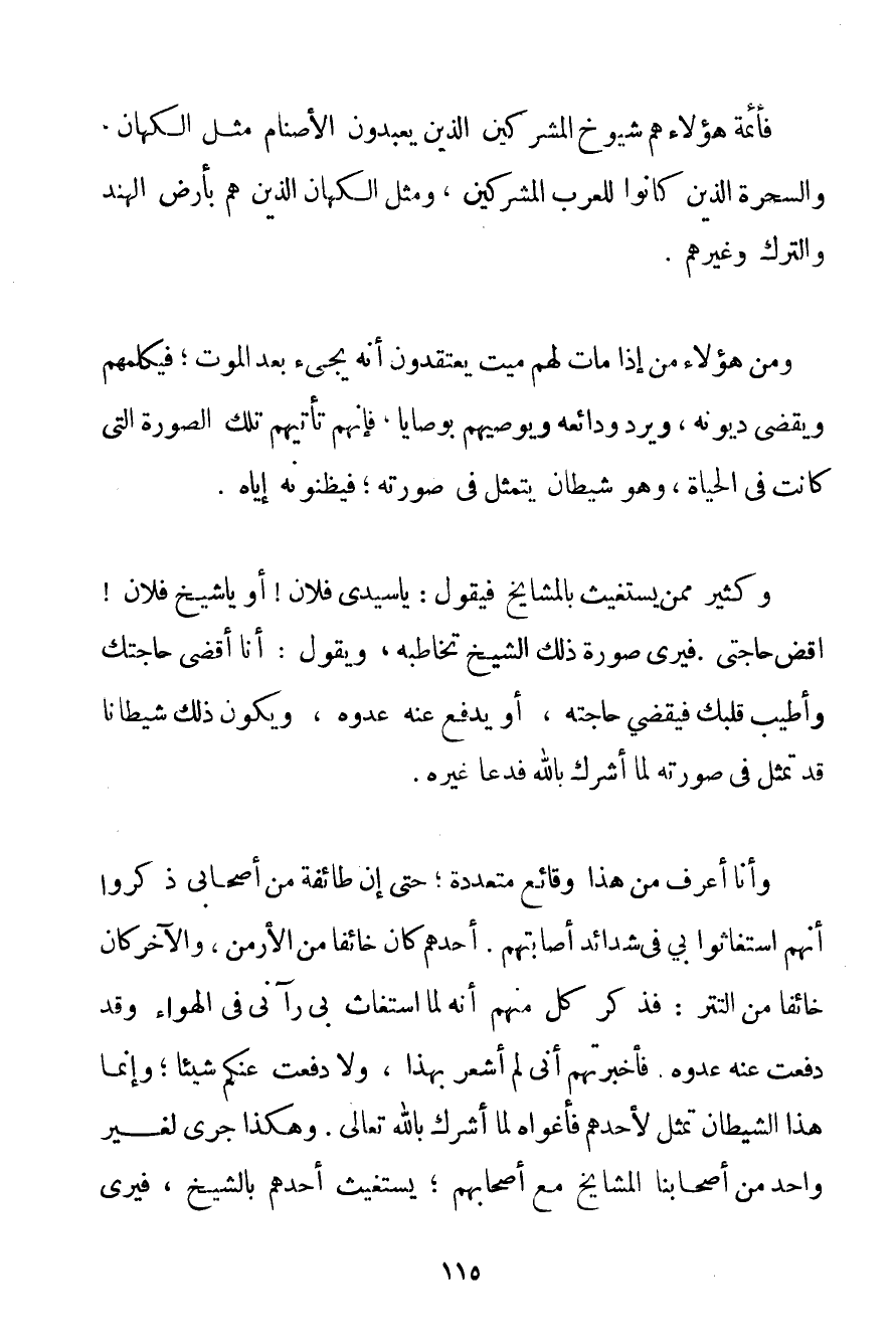 فَأَئِمَّةُ هَؤُلَاءِ هُمْ شُيُوخُ الْمُشْرِكِينَ الَّذِينَ يَعْبُدُونَ الْأَصْنَامَ مِثْلَ الْكُهَّانِ وَالسَّحَرَةِ الَّذِينَ كَانُوا لِلْعَرَبِ الْمُشْرِكِينَ وَمِثْلَ الْكُهَّانِ الَّذِينَ هُمْ بِأَرْضِ الْهِنْدِ وَالتُّرْكِ وَغَيْرِهِمْ. وَمِنْ هَؤُلَاءِ مَنْ إذَا مَاتَ لَهُمْ مَيِّتٌ يَعْتَقِدُونَ أَنَّهُ يَجِيءُ بَعْدَ الْمَوْتِ؛ فَيُكَلِّمُهُمْ وَيَقْضِي دُيُونَهُ وَيَرُدُّ وَدَائِعَهُ وَيُوصِيهِمْ بِوَصَايَا فَإِنَّهُمْ تَأْتِيهِمْ تِلْكَ الصُّورَةُ الَّتِي كَانَتْ فِي الْحَيَاةِ وَهُوَ شَيْطَانٌ يَتَمَثَّلُ فِي صُورَتِهِ؛ فَيَظُنُّونَهُ إيَّاهُ. وَكَثِيرٌ مِمَّنْ يَسْتَغِيثُ بِالْمَشَايِخِ فَيَقُولُ: يَا سَيِّدِي فُلَانٌ أَوْ يَا شَيْخُ فُلَانٍ اقْضِ حَاجَتِي. فَيَرَى صُورَةَ ذَلِكَ الشَّيْخِ تُخَاطِبُهُ وَيَقُولُ: أَنَا أَقْضِي حَاجَتَك وَأُطَيِّبُ قَلْبَك فَيَقْضِي حَاجَتَهُ أَوْ يَدْفَعُ عَنْهُ عَدُوَّهُ وَيَكُونُ ذَلِكَ شَيْطَانًا قَدْ تَمَثَّلَ فِي صُورَتِهِ لَمَّا أَشْرَكَ بِاَللَّهِ فَدَعَا غَيْرَهُ. وَأَنَا أَعْرِفُ مِنْ هَذَا وَقَائِعُ مُتَعَدِّدَةٌ؛ حَتَّى إنَّ طَائِفَةً مِنْ أَصْحَابِي ذَكَرُوا أَنَّهُمْ اسْتَغَاثُوا بِي فِي شَدَائِدَ أَصَابَتْهُمْ. أَحَدُهُمْ كَانَ خَائِفًا مِنْ الْأَرْمَنِ وَالْآخَرُ كَانَ خَائِفًا مِنْ التتر: فَذَكَرَ كُلٌّ مِنْهُمْ أَنَّهُ لَمَّا اسْتَغَاثَ بِي رَآنِي فِي الْهَوَاءِ وَقَدْ دَفَعْت عَنْهُ عَدُوَّهُ. فَأَخْبَرْتهمْ أَنِّي لَمْ أَشْعُرْ بِهَذَا وَلَا دَفَعْت عَنْكُمْ شَيْئًا؛ وَإِنَّمَا هَذَا الشَّيْطَانُ تَمَثَّلَ لِأَحَدِهِمْ فَأَغْوَاهُ لَمَّا أَشْرَكَ بِاَللَّهِ تَعَالَى. وَهَكَذَا جَرَى لِغَيْرِ وَاحِدٍ مِنْ أَصْحَابِنَا الْمَشَايِخِ مَعَ أَصْحَابِهِمْ؛ يَسْتَغِيثُ أَحَدُهُمْ بِالشَّيْخِ فَيَرَى