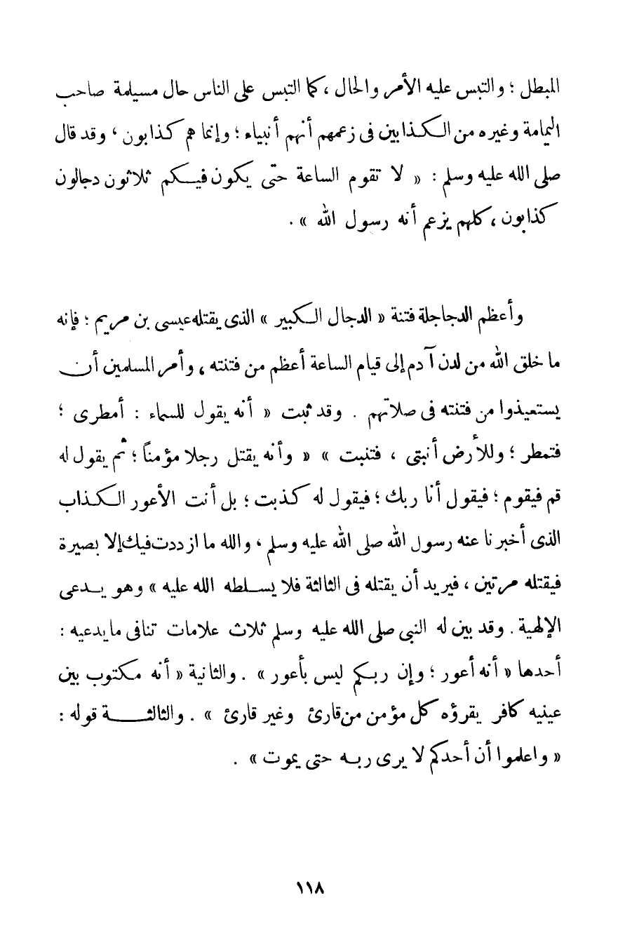 الْمُبْطِلِ؛ وَالْتَبَسَ عَلَيْهِ الْأَمْرُ وَالْحَالُ كَمَا الْتَبَسَ عَلَى النَّاسِ حَالُ مُسَيْلِمَةَ صَاحِبِ الْيَمَامَةِ وَغَيْرِهِ مِنْ الْكَذَّابِينَ فِي زَعْمِهِمْ أَنَّهُمْ أَنْبِيَاءُ؛ وَإِنَّمَا هُمْ كَذَّابُونَ وَقَدْ قَالَ صَلَّى اللَّهُ عَلَيْهِ وَسَلَّمَ " {لَا تَقُومُ السَّاعَةُ حَتَّى يَكُونَ فِيكُمْ ثَلَاثُونَ دَجَّالُونَ كَذَّابُونَ كُلُّهُمْ يَزْعُمُ أَنَّهُ رَسُولُ اللَّهِ} . وَأَعْظَمُ الدَّجَاجِلَةِ فِتْنَةً " الدَّجَّالُ الْكَبِيرُ " الَّذِي يَقْتُلُهُ عِيسَى ابْنُ مَرْيَمَ؛ فَإِنَّهُ مَا خَلَقَ اللَّهُ مِنْ لَدُنْ آدَمَ إلَى قِيَامِ السَّاعَةِ أَعْظَمَ مِنْ فِتْنَتِهِ وَأَمَرَ الْمُسْلِمِينَ أَنْ يَسْتَعِيذُوا مِنْ فِتْنَتِهِ فِي صَلَاتِهِمْ. وَقَدْ ثَبَتَ " أَنَّهُ يَقُولُ لِلسَّمَاءِ: أَمْطِرِي؛ فَتُمْطِرُ؛ وَلِلْأَرْضِ أَنْبِتِي فَتُنْبِتُ " " وَأَنَّهُ يَقْتُلُ رَجُلًا مُؤْمِنًا؛ ثُمَّ يَقُولُ لَهُ قُمْ فَيَقُومُ؛ فَيَقُولُ أَنَا رَبُّك؛ فَيَقُولُ لَهُ كَذَبْت؛ بَلْ أَنْتَ الْأَعْوَرُ الْكَذَّابُ الَّذِي أَخْبَرَنَا عَنْهُ رَسُولُ اللَّهِ صَلَّى اللَّهُ عَلَيْهِ وَسَلَّمَ وَاَللَّهِ مَا ازْدَدْت فِيك إلَّا بَصِيرَةً فَيَقْتُلُهُ مَرَّتَيْنِ فَيُرِيدُ أَنْ يَقْتُلَهُ فِي الثَّالِثَةِ فَلَا يُسَلِّطُهُ اللَّهُ عَلَيْهِ " وَهُوَ يَدَّعِي الْإِلَهِيَّةَ. وَقَدْ بَيَّنَ لَهُ النَّبِيُّ صَلَّى اللَّهُ عَلَيْهِ وَسَلَّمَ ثَلَاثَ عَلَامَاتٍ تُنَافِي مَا يَدَّعِيهِ: أَحَدُهَا " {أَنَّهُ أَعْوَرُ؛ وَإِنَّ رَبَّكُمْ لَيْسَ بِأَعْوَرَ} . وَالثَّانِيَةُ " {أَنَّهُ مَكْتُوبٌ بَيْنَ عَيْنَيْهِ كَافِرٌ يَقْرَؤُهُ كُلُّ مُؤْمِنٍ مِنْ قَارِئٍ وَغَيْرِ قَارِئٍ} . وَالثَّالِثَةُ قَوْلُهُ: " {وَاعْلَمُوا أَنَّ أَحَدَكُمْ لَا يَرَى رَبَّهُ حَتَّى يَمُوتَ} .
