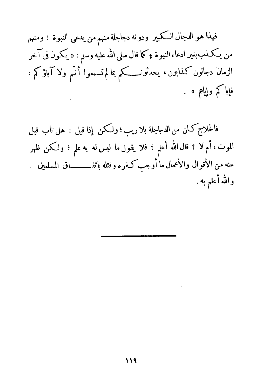 فَهَذَا هُوَ الدَّجَّالُ الْكَبِيرُ وَدُونَهُ دَجَاجِلَةُ مِنْهُمْ مِنْ يَدَّعِي النُّبُوَّةَ؛ وَمِنْهُمْ مِنْ يُكَذَّبُ بِغَيْرِ ادِّعَاءِ النُّبُوَّةِ؛ كَمَا قَالَ صَلَّى اللَّهُ عَلَيْهِ وَسَلَّمَ " {يَكُونُ فِي آخِرِ الزَّمَانِ دَجَّالُونَ كَذَّابُونَ يُحَدِّثُونَكُمْ بِمَا لَمْ تَسْمَعُوا أَنْتُمْ وَلَا آبَاؤُكُمْ فَإِيَّاكُمْ وَإِيَّاهُمْ} . فَالْحَلَّاجُ كَانَ مِنْ الدَّجَاجِلَةِ بِلَا رَيْبٍ؛ وَلَكِنْ إذَا قِيلَ: هَلْ تَابَ قَبْلَ الْمَوْتِ أَمْ لَا؟ قَالَ اللَّهُ أَعْلَمُ؛ فَلَا يَقُولُ مَا لَيْسَ لَهُ بِهِ عِلْمٌ؛ وَلَكِنْ ظَهَرَ عَنْهُ مِنْ الْأَقْوَالِ وَالْأَعْمَالِ مَا أَوْجَبَ كُفْرَهُ وَقَتْلَهُ بِاتِّفَاقِ الْمُسْلِمِينَ. وَاَللَّهُ أَعْلَمُ بِهِ.