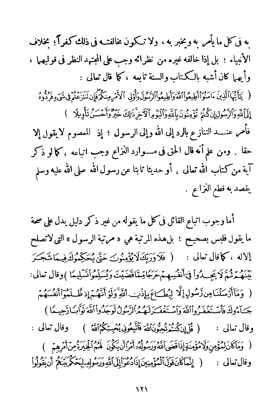 بِهِ فِي كُلِّ مَا يَأْمُرُ بِهِ وَيُخْبِرُ بِهِ وَلَا تَكُونُ مُخَالَفَتُهُ فِي ذَلِكَ كُفْرًا؛ بِخِلَافِ الْأَنْبِيَاءِ؛ بَلْ إذَا خَالَفَهُ غَيْرُهُ مِنْ نُظَرَائِهِ وَجَبَ عَلَى الْمُجْتَهِدِ النَّظَرُ فِي قَوْلَيْهِمَا وَأَيُّهُمَا كَانَ أَشْبَهَ بِالْكِتَابِ وَالسُّنَّةِ تَابَعَهُ كَمَا قَالَ تَعَالَى: {يَا أَيُّهَا الَّذِينَ آمَنُوا أَطِيعُوا اللَّهَ وَأَطِيعُوا الرَّسُولَ وَأُولِي الْأَمْرِ مِنْكُمْ فَإِنْ تَنَازَعْتُمْ فِي شَيْءٍ فَرُدُّوهُ إلَى اللَّهِ وَالرَّسُولِ إنْ كُنْتُمْ تُؤْمِنُونَ بِاللَّهِ وَالْيَوْمِ الْآخِرِ ذَلِكَ خَيْرٌ وَأَحْسَنُ تَأْوِيلًا} فَأَمَرَ عِنْدَ التَّنَازُعِ بِالرَّدِّ إلَى اللَّهِ وَإِلَى الرَّسُولِ؛ إذْ الْمَعْصُومُ لَا يَقُولُ إلَّا حَقًّا. وَمَنْ عَلِمَ أَنَّهُ قَالَ الْحَقَّ فِي مَوَارِدَ النِّزَاعِ وَجَبَ اتِّبَاعُهُ كَمَا لَوْ ذَكَرَ آيَةً مِنْ كِتَابِ اللَّهِ تَعَالَى أَوْ حَدِيثًا ثَابِتًا عَنْ رَسُولِ اللَّهِ صَلَّى اللَّهُ عَلَيْهِ وَسَلَّمَ يَقْصِدُ بِهِ قَطْعَ النِّزَاعِ. أَمَّا وُجُوبُ اتِّبَاعِ الْقَائِلِ فِي كُلِّ مَا يَقُولُهُ مِنْ غَيْرِ ذِكْرِ دَلِيلٍ يَدُلُّ عَلَى صِحَّةِ مَا يَقُولُ فَلَيْسَ بِصَحِيحِ؛ بَلْ هَذِهِ الْمَرْتَبَةُ هِيَ " مَرْتَبَةُ الرَّسُولِ " الَّتِي لَا تَصْلُحُ إلَّا لَهُ كَمَا قَالَ تَعَالَى: {فَلَا وَرَبِّكَ لَا يُؤْمِنُونَ حَتَّى يُحَكِّمُوكَ فِيمَا شَجَرَ بَيْنَهُمْ ثُمَّ لَا يَجِدُوا فِي أَنْفُسِهِمْ حَرَجًا مِمَّا قَضَيْتَ وَيُسَلِّمُوا تَسْلِيمًا} وَقَالَ تَعَالَى: {وَمَا أَرْسَلْنَا مِنْ رَسُولٍ إلَّا لِيُطَاعَ بِإِذْنِ اللَّهِ وَلَوْ أَنَّهُمْ إذْ ظَلَمُوا أَنْفُسَهُمْ جَاءُوكَ فَاسْتَغْفَرُوا اللَّهَ وَاسْتَغْفَرَ لَهُمُ الرَّسُولُ لَوَجَدُوا اللَّهَ تَوَّابًا رَحِيمًا} وَقَالَ تَعَالَى: {قُلْ إنْ كُنْتُمْ تُحِبُّونَ اللَّهَ فَاتَّبِعُونِي يُحْبِبْكُمُ اللَّهُ} وَقَالَ تَعَالَى: {وَمَا كَانَ لِمُؤْمِنٍ وَلَا مُؤْمِنَةٍ إذَا قَضَى اللَّهُ وَرَسُولُهُ أَمْرًا أَنْ يَكُونَ لَهُمُ الْخِيَرَةُ مِنْ أَمْرِهِمْ} وَقَالَ تَعَالَى: {إنَّمَا كَانَ قَوْلَ الْمُؤْمِنِينَ إذَا دُعُوا إلَى اللَّهِ وَرَسُولِهِ