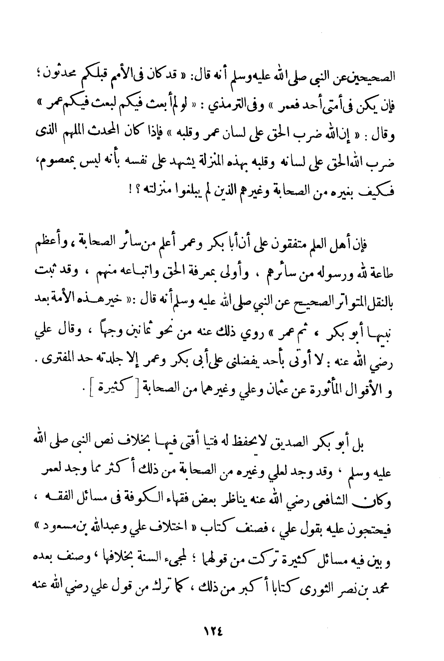 الصَّحِيحَيْنِ عَنْ النَّبِيِّ صَلَّى اللَّهُ عَلَيْهِ وَسَلَّمَ أَنَّهُ قَالَ: " {قَدْ كَانَ فِي الْأُمَمِ قَبْلَكُمْ مُحَدِّثُونَ؛ فَإِنْ يَكُنْ فِي أُمَّتِي أَحَدٌ فَعُمَرُ} وَفِي التِّرْمِذِيِّ: " {لَوْ لَمْ أُبْعَثْ فِيكُمْ لَبُعِثَ فِيكُمْ عُمَرُ} وَقَالَ: " {إنَّ اللَّهَ ضَرَبَ الْحَقَّ عَلَى لِسَانِ عُمَرَ وَقَلْبِهِ} فَإِذَا كَانَ الْمُحَدِّثُ الْمُلْهَمُ الَّذِي ضَرَبَ اللَّهُ الْحَقَّ عَلَى لِسَانِهِ وَقَلْبِهِ بِهَذِهِ الْمَنْزِلَةِ يَشْهَدُ عَلَى نَفْسِهِ بِأَنَّهُ لَيْسَ بِمَعْصُومِ فَكَيْفَ بِغَيْرِهِ مِنْ الصَّحَابَةِ وَغَيْرِهِمْ الَّذِينَ لَمْ يَبْلُغُوا مَنْزِلَتَهُ فَإِنَّ أَهْلَ الْعِلْمِ مُتَّفِقُونَ عَلَى أَنَّ أَبَا بَكْرٍ وَعُمَرَ أَعْلَمُ مِنْ سَائِرِ الصَّحَابَةِ وَأَعْظَمُ طَاعَةً لِلَّهِ وَرَسُولِهِ مِنْ سَائِرِهِمْ وَأَوْلَى بِمَعْرِفَةِ الْحَقِّ وَاتِّبَاعِهِ مِنْهُمْ وَقَدْ ثَبَتَ بِالنَّقْلِ الْمُتَوَاتِرِ الصَّحِيحِ عَنْ النَّبِيِّ صَلَّى اللَّهُ عَلَيْهِ وَسَلَّمَ أَنَّهُ قَالَ: " {خَيْرُ هَذِهِ الْأُمَّةِ بَعْدَ نَبِيِّهَا أَبُو بَكْرٍ ثُمَّ عُمَرُ} رُوِيَ ذَلِكَ عَنْهُ مِنْ نَحْوِ ثَمَانِينَ وَجْهًا وَقَالَ عَلِيٌّ رَضِيَ اللَّهُ عَنْهُ لَا أوتى بِأَحَدِ يُفَضِّلُنِي عَلَى أَبِي بَكْرٍ وَعُمَرَ إلَّا جَلَدْته حَدَّ الْمُفْتَرِي. وَالْأَقْوَالُ الْمَأْثُورَةُ عَنْ عُثْمَانَ وَعَلِيٍّ وَغَيْرِهِمَا مِنْ الصَّحَابَةِ كَثِيرَةٌ.