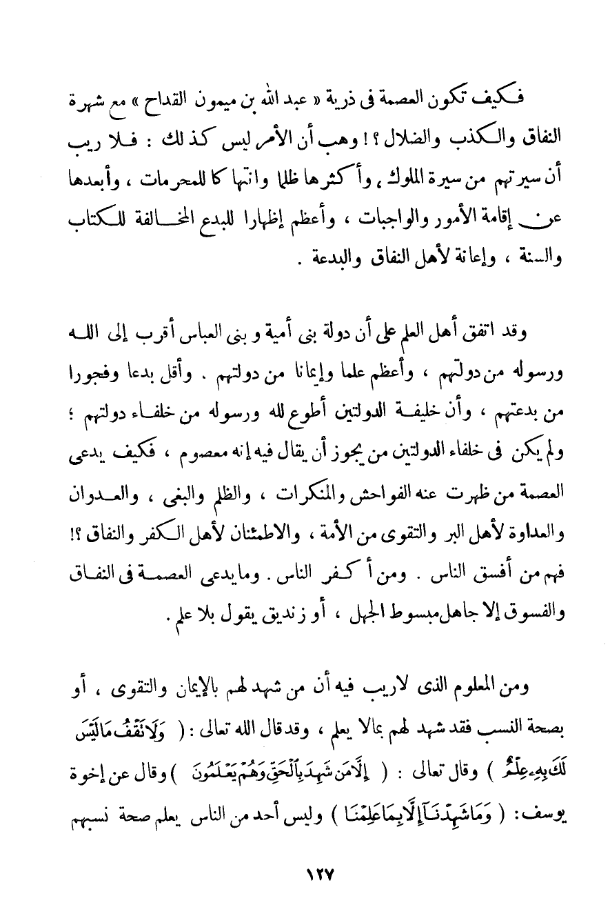 فَكَيْفَ تَكُونُ الْعِصْمَةُ فِي ذُرِّيَّةِ " عُبَيْدِ اللَّهِ بْنِ مَيْمُونٍ الْقَدَّاحِ " مَعَ شُهْرَةِ النِّفَاقِ وَالْكَذِبِ وَالضَّلَالِ وَهَبْ أَنَّ الْأَمْرَ لَيْسَ كَذَلِكَ: فَلَا رَيْبَ أَنَّ سِيرَتَهُمْ مِنْ سِيرَةِ الْمُلُوكِ وَأَكْثَرِهَا ظُلْمًا وَانْتِهَاكًا لِلْمُحَرَّمَاتِ وَأَبْعَدِهَا عَنْ إقَامَةِ الْأُمُورِ وَالْوَاجِبَاتِ وَأَعْظَمَ إظْهَارًا لِلْبِدَعِ الْمُخَالَفَةُ لِلْكِتَابِ وَالسُّنَّةِ وَإِعَانَةً لِأَهْلِ النِّفَاقِ وَالْبِدْعَةِ. وَقَدْ اتَّفَقَ أَهْلُ الْعِلْمِ عَلَى أَنَّ دَوْلَةَ بَنِي أُمَيَّةَ وَبَنِيَّ الْعَبَّاسِ أَقْرَبُ إلَى اللَّهِ وَرَسُولِهِ مِنْ دَوْلَتِهِمْ وَأَعْظَمُ عِلْمًا وَإِيمَانًا مِنْ دَوْلَتِهِمْ وَأَقَلُّ بِدَعًا وَفُجُورًا مِنْ بِدْعَتِهِمْ وَأَنَّ خَلِيفَةَ الدَّوْلَتَيْنِ أَطْوَعُ لِلَّهِ وَرَسُولِهِ مِنْ خُلَفَاءِ دَوْلَتِهِمْ؛ وَلَمْ يَكُنْ فِي خُلَفَاءِ الدَّوْلَتَيْنِ مَنْ يَجُوزُ أَنْ يُقَالَ فِيهِ إنَّهُ مَعْصُومٌ فَكَيْفَ يَدَّعِي الْعِصْمَةَ مَنْ ظَهَرَتْ عَنْهُ الْفَوَاحِشُ وَالْمُنْكَرَاتُ وَالظُّلْمُ وَالْبَغْيُ وَالْعُدْوَانُ وَالْعَدَاوَةُ لِأَهْلِ الْبِرِّ وَالتَّقْوَى مِنْ الْأُمَّةِ وَالِاطْمِئْنَانُ لِأَهْلِ الْكُفْرِ وَالنِّفَاقِ فَهُمْ مِنْ أَفْسَقِ النَّاسِ. وَمِنْ أَكْفَرِ النَّاسِ. وَمَا يَدَّعِي الْعِصْمَةَ فِي النِّفَاقِ وَالْفُسُوقِ إلَّا جَاهِلٌ مَبْسُوطُ الْجَهْلِ أَوْ زِنْدِيقٌ يَقُولُ بِلَا عِلْمٍ. وَمِنْ الْمَعْلُومِ الَّذِي لَا رَيْبَ فِيهِ أَنَّ مَنْ شَهِدَ لَهُمْ بِالْإِيمَانِ وَالتَّقْوَى أَوْ بِصِحَّةِ النَّسَبِ فَقَدْ شَهِدَ لَهُمْ بِمَا لَا يَعْلَمُ وَقَدْ قَالَ اللَّهُ تَعَالَى: {وَلَا تَقْفُ مَا لَيْسَ لَكَ بِهِ عِلْمٌ} وَقَالَ تَعَالَى: {إلَّا مَنْ شَهِدَ بِالْحَقِّ وَهُمْ يَعْلَمُونَ} وَقَالَ عَنْ إخْوَةِ يُوسُفَ: {وَمَا شَهِدْنَا إلَّا بِمَا عَلِمْنَا} وَلَيْسَ أَحَدٌ مِنْ النَّاسِ يَعْلَمُ صِحَّةَ نَسَبِهِمْ