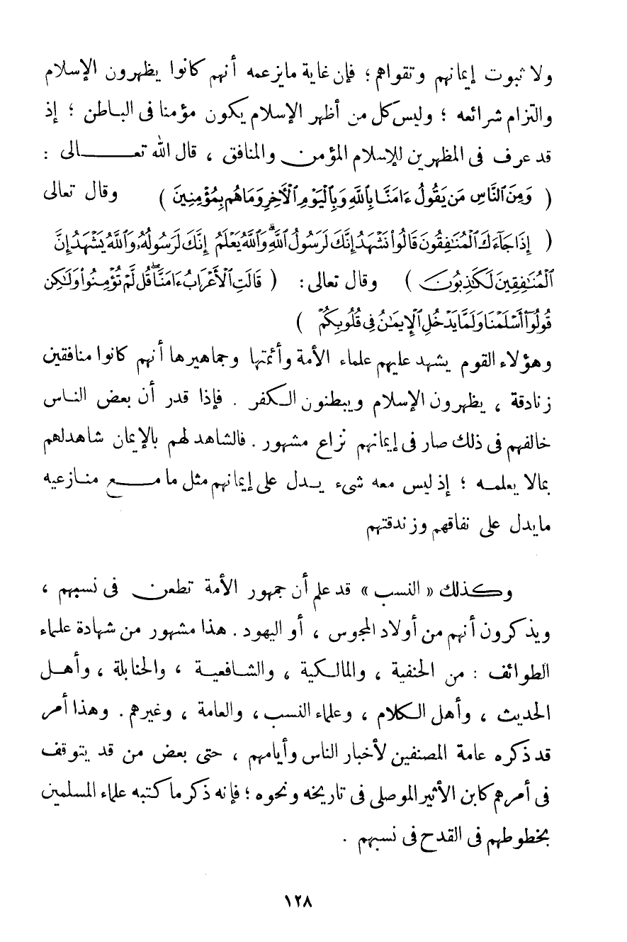 وَلَا ثُبُوتَ إيمَانِهِمْ وَتَقْوَاهُمْ؛ فَإِنَّ غَايَةَ مَا يَزْعُمُهُ أَنَّهُمْ كَانُوا يُظْهِرُونَ الْإِسْلَامَ وَالْتِزَامَ شَرَائِعِهِ؛ وَلَيْسَ كُلُّ مَنْ أَظْهَرَ الْإِسْلَامَ يَكُونُ مُؤْمِنًا فِي الْبَاطِنِ؛ إذْ قَدْ عُرِفَ فِي الْمُظْهِرِينَ لِلْإِسْلَامِ الْمُؤْمِنُ وَالْمُنَافِقُ قَالَ اللَّهُ تَعَالَى: {وَمِنَ النَّاسِ مَنْ يَقُولُ آمَنَّا بِاللَّهِ وَبِالْيَوْمِ الْآخِرِ وَمَا هُمْ بِمُؤْمِنِينَ} وَقَالَ تَعَالَى {إذَا جَاءَكَ الْمُنَافِقُونَ قَالُوا نَشْهَدُ إنَّكَ لَرَسُولُ اللَّهِ وَاللَّهُ يَعْلَمُ إنَّكَ لَرَسُولُهُ وَاللَّهُ يَشْهَدُ إنَّ الْمُنَافِقِينَ لَكَاذِبُونَ} وَقَالَ تَعَالَى: {قَالَتِ الْأَعْرَابُ آمَنَّا قُلْ لَمْ تُؤْمِنُوا وَلَكِنْ قُولُوا أَسْلَمْنَا وَلَمَّا يَدْخُلِ الْإِيمَانُ فِي قُلُوبِكُمْ} وَهَؤُلَاءِ الْقَوْمُ يَشْهَدُ عَلَيْهِمْ عُلَمَاءُ الْأُمَّةِ وَأَئِمَّتُهَا وَجَمَاهِيرُهَا أَنَّهُمْ كَانُوا مُنَافِقِينَ زَنَادِقَةٌ يُظْهِرُونَ الْإِسْلَامَ وَيُبْطِنُونَ الْكُفْرَ. فَإِذَا قُدِّرَ أَنَّ بَعْضَ النَّاسِ خَالَفَهُمْ فِي ذَلِكَ صَارَ فِي إيمَانِهِمْ نِزَاعٌ مَشْهُورٌ. فَالشَّاهِدُ لَهُمْ بِالْإِيمَانِ شَاهِدٌ لَهُمْ بِمَا لَا يَعْلَمُهُ؛ إذْ لَيْسَ مَعَهُ شَيْءٌ يَدُلُّ عَلَى إيمَانِهِمْ مِثْلَ مَا مَعَ مُنَازَعِيهِ مَا يَدُلُّ عَلَى نِفَاقِهِمْ وَزَنْدَقَتِهِمْ وَكَذَلِكَ " النَّسَبُ " قَدْ عُلِمَ أَنَّ جُمْهُورَ الْأُمَّةِ تَطْعَنُ فِي نَسَبِهِمْ وَيَذْكُرُونَ أَنَّهُمْ مِنْ أَوْلَادِ الْمَجُوسِ أَوْ الْيَهُودِ. هَذَا مَشْهُورٌ مِنْ شَهَادَةِ عُلَمَاءَ الطَّوَائِفِ: مِنْ الْحَنَفِيَّةِ وَالْمَالِكِيَّةِ وَالشَّافِعِيَّةِ وَالْحَنَابِلَةِ وَأَهْلِ الْحَدِيثِ وَأَهْلِ الْكَلَامِ وَعُلَمَاءِ النَّسَبِ وَالْعَامَّةِ وَغَيْرِهِمْ. وَهَذَا أَمْرٌ قَدْ ذَكَرَهُ عَامَّةُ الْمُصَنِّفِينَ لِأَخْبَارِ النَّاسِ وَأَيَّامِهِمْ حَتَّى بَعْضُ مَنْ قَدْ يُتَوَقَّفُ فِي أَمْرِهِمْ كَابْنِ الْأَثِيرِ الموصلي فِي تَارِيخِهِ وَنَحْوِهِ؛ فَإِنَّهُ ذَكَرَ مَا كَتَبَهُ عُلَمَاءُ الْمُسْلِمِينَ بِخُطُوطِهِمْ فِي الْقَدْحِ فِي نَسَبِهِمْ.