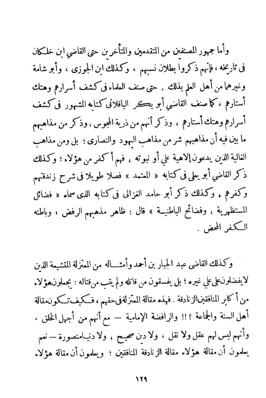 وَأَمَّا جُمْهُورُ الْمُصَنِّفِينَ مِنْ الْمُتَقَدِّمِينَ والمتأخرين حَتَّى الْقَاضِي ابْنُ خِلِّكَان فِي تَارِيخِهِ فَإِنَّهُمْ ذَكَرُوا بُطْلَانَ نَسَبِهِمْ وَكَذَلِكَ ابْنُ الْجَوْزِيِّ وَأَبُو شَامَةَ وَغَيْرُهُمَا مِنْ أَهْلِ الْعِلْمِ بِذَلِكَ حَتَّى صَنَّفَ الْعُلَمَاءُ فِي كَشْفِ أَسْرَارِهِمْ وَهَتْكِ أَسْتَارِهِمْ كَمَا صَنَّفَ الْقَاضِي أَبُو بَكْرٍ الْبَاقِلَانِي كِتَابَهُ الْمَشْهُورَ فِي كَشْفِ أَسْرَارِهِمْ وَهَتْكِ أَسْتَارِهِمْ وَذَكَرَ أَنَّهُمْ مِنْ ذُرِّيَّةٍ الْمَجُوسِ وَذَكَرَ مِنْ مَذَاهِبِهِمْ مَا بَيَّنَ فِيهِ أَنَّ مَذَاهِبَهُمْ شَرٌّ مِنْ مَذَاهِبِ الْيَهُودِ وَالنَّصَارَى؛ بَلْ وَمِنْ مَذَاهِبِ الْغَالِيَةِ الَّذِينَ يَدَّعُونَ إلَهِيَّةَ عَلِيٍّ أَوْ نُبُوَّتَهُ فَهُمْ أَكْفَرُ مِنْ هَؤُلَاءِ؛ وَكَذَلِكَ ذَكَرَ الْقَاضِي أَبُو يَعْلَى فِي كِتَابِهِ " الْمُعْتَمَدُ " فَصْلًا طَوِيلًا فِي شَرْحِ زَنْدَقَتِهِمْ وَكُفْرِهِمْ وَكَذَلِكَ ذَكَرَ أَبُو حَامِدٍ الْغَزَالِيُّ فِي كِتَابِهِ الَّذِي سَمَّاهُ " فَضَائِلُ المستظهرية وَفَضَائِحُ الْبَاطِنِيَّةِ " قَالَ: ظَاهِرُ مَذْهَبِهِمْ الرَّفْضُ وَبَاطِنُهُ الْكُفْرُ الْمَحْضُ. وَكَذَلِكَ الْقَاضِي عَبْدُ الْجَبَّارِ بْنُ أَحْمَد وَأَمْثَالُهُ مِنْ الْمُعْتَزِلَةِ الْمُتَشَيِّعَةِ الَّذِينَ لَا يُفَضِّلُونَ عَلَى عَلِيٍّ غَيْرَهُ؛ بَلْ يُفَسِّقُونِ مَنْ قَاتَلَهُ وَلَمْ يَتُبْ مِنْ قِتَالِهِ: يَجْعَلُونَ هَؤُلَاءِ مِنْ أَكَابِرَ الْمُنَافِقِينَ الزَّنَادِقَةِ. فَهَذِهِ مَقَالَةُ الْمُعْتَزِلَةِ فِي حَقِّهِمْ فَكَيْفَ تَكُونُ مَقَالَةُ أَهْلِ السُّنَّةِ وَالْجَمَاعَةِ وَالرَّافِضَةِ الْإِمَامِيَّةِ - مَعَ أَنَّهُمْ مِنْ أَجْهَلِ الْخَلْقِ وَأَنَّهُمْ لَيْسَ لَهُمْ عَقْلٌ وَلَا نَقْلٌ وَلَا دِينٌ صَحِيحٌ وَلَا دُنْيَا مَنْصُورَةٌ - نَعَمْ يَعْلَمُونَ أَنَّ مَقَالَةَ هَؤُلَاءِ مَقَالَةُ الزَّنَادِقَةِ الْمُنَافِقِينَ؛ وَيَعْلَمُونَ أَنَّ مَقَالَةَ هَؤُلَاءِ