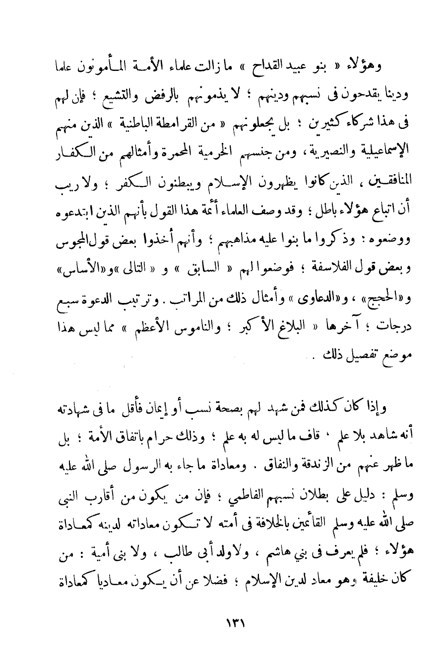 وَهَؤُلَاءِ " بَنُو عَبِيدِ الْقَدَّاحِ " مَا زَالَتْ عُلَمَاءُ الْأُمَّةِ الْمَأْمُونُونَ عِلْمًا وَدِينًا يَقْدَحُونَ فِي نَسَبِهِمْ وَدِينِهِمْ؛ لَا يَذُمُّونَهُمْ بِالرَّفْضِ وَالتَّشَيُّعِ؛ فَإِنَّ لَهُمْ فِي هَذَا شُرَكَاءَ كَثِيرِينَ؛ بَلْ يَجْعَلُونَهُمْ " مِنْ الْقَرَامِطَةِ الْبَاطِنِيَّةِ " الَّذِينَ مِنْهُمْ الْإِسْمَاعِيلِيَّة وَالْنُصَيْرِيَّة وَمِنْ جِنْسِهِمْ الخرمية الْمُحَمِّرَةُ وَأَمْثَالُهُمْ مِنْ الْكُفَّارِ الْمُنَافِقُونَ الَّذِينَ كَانُوا يُظْهِرُونَ الْإِسْلَامَ وَيُبْطِنُونَ الْكُفْرَ؛ وَلَا رَيْبَ أَنَّ اتِّبَاعَ هَؤُلَاءِ بَاطِلٌ؛ وَقَدْ وَصَفَ الْعُلَمَاءُ أَئِمَّةَ هَذَا الْقَوْلِ بِأَنَّهُمْ الَّذِينَ ابْتَدَعُوهُ وَوَضَعُوهُ؛ وَذَكَرُوا مَا بَنَوْا عَلَيْهِ مَذَاهِبَهُمْ؛ وَأَنَّهُمْ أَخَذُوا بَعْضَ قَوْلِ الْمَجُوسِ وَبَعْضَ قَوْلِ الْفَلَاسِفَةِ؛ فَوَضَعُوا لَهُمْ " السَّابِقَ " و " التَّالِيَ " و " الْأَسَاسَ " و " الْحُجَجَ " و " الدَّعَاوَى " وَأَمْثَالَ ذَلِكَ مِنْ الْمَرَاتِبِ. وَتَرْتِيبُ الدَّعْوَةِ سَبْعُ دَرَجَاتٍ؛ آخِرُهَا " الْبَلَاغُ الْأَكْبَرُ؛ وَالنَّامُوسُ الْأَعْظَمُ " مِمَّا لَيْسَ هَذَا مَوْضِعَ تَفْصِيلِ ذَلِكَ. وَإِذَا كَانَ كَذَلِكَ فَمَنْ شَهِدَ لَهُمْ بِصِحَّةِ نَسَبٍ أَوْ إيمَانٍ فَأَقَلُّ مَا فِي شَهَادَتِهِ أَنَّهُ شَاهِدٌ بِلَا عِلْمٍ قَافٍ مَا لَيْسَ لَهُ بِهِ عِلْمٌ؛ وَذَلِكَ حَرَامٌ بِاتِّفَاقِ الْأُمَّةِ؛ بَلْ مَا ظَهَرَ عَنْهُمْ مِنْ الزَّنْدَقَةِ وَالنِّفَاقِ وَمُعَادَاةِ مَا جَاءَ بِهِ الرَّسُولُ صَلَّى اللَّهُ عَلَيْهِ وَسَلَّمَ دَلِيلٌ عَلَى بُطْلَانِ نَسَبِهِمْ الْفَاطِمِيِّ؛ فَإِنَّ مَنْ يَكُونُ مِنْ أَقَارِبَ النَّبِيِّ صَلَّى اللَّهُ عَلَيْهِ وَسَلَّمَ الْقَائِمَيْنِ بِالْخِلَافَةِ فِي أُمَّتِهِ لَا تَكُونُ مُعَادَاتُهُ لِدِينِهِ كَمُعَادَاةِ هَؤُلَاءِ؛ فَلَمْ يُعْرَفْ فِي بَنِي هَاشِمٍ وَلَا وَلَدِ أَبِي طَالِبٍ وَلَا بَنِي أُمَيَّةَ: مَنْ كَانَ خَلِيفَةً وَهُوَ مُعَادٍ لِدِينِ الْإِسْلَامِ؛ فَضْلًا عَنْ أَنْ يَكُونَ مُعَادِيًا كَمُعَادَاةِ