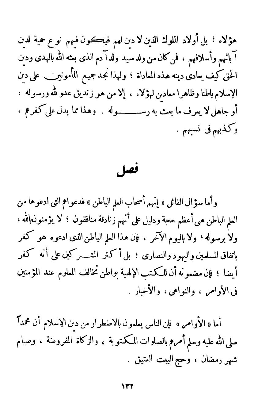 وَأَمَّا سُؤَالُ الْقَائِلِ " إنَّهُمْ أَصْحَابُ الْعِلْمِ الْبَاطِنِ " فَدَعْوَاهُمْ الَّتِي ادَّعَوْهَا مِنْ الْعِلْمِ الْبَاطِنِ هُوَ أَعْظَمُ حُجَّةٍ وَدَلِيلٍ عَلَى أَنَّهُمْ زَنَادِقَةٌ مُنَافِقُونَ؛ لَا يُؤْمِنُونَ بِاَللَّهِ وَلَا بِرَسُولِهِ وَلَا بِالْيَوْمِ الْآخِرِ فَإِنَّ هَذَا الْعِلْمَ الْبَاطِنَ الَّذِي ادَّعَوْهُ هُوَ كُفْرٌ بِاتِّفَاقِ الْمُسْلِمِينَ وَالْيَهُودِ وَالنَّصَارَى؛ بَلْ أَكْثَرُ الْمُشْرِكِينَ عَلَى أَنَّهُ كُفْرٌ أَيْضًا؛ فَإِنَّ مَضْمُونَهُ أَنَّ لِلْكُتُبِ الْإِلَهِيَّةِ بَوَاطِنَ تُخَالِفُ الْمَعْلُومَ عِنْدَ الْمُؤْمِنِينَ فِي الْأَوَامِرِ وَالنَّوَاهِي وَالْأَخْبَارِ. أَمَّا " الْأَوَامِرُ " فَإِنَّ النَّاسَ يَعْلَمُونَ بِالِاضْطِرَارِ مِنْ دِينِ الْإِسْلَامِ أَنَّ مُحَمَّدًا صَلَّى اللَّهُ عَلَيْهِ وَسَلَّمَ أَمَرَهُمْ بِالصَّلَوَاتِ الْمَكْتُوبَةِ وَالزَّكَاةِ الْمَفْرُوضَةِ وَصِيَامِ شَهْرِ رَمَضَانَ وَحَجِّ الْبَيْتِ الْعَتِيقِ.