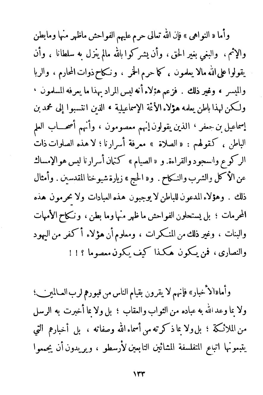 وَأَمَّا " النَّوَاهِي " فَإِنَّ اللَّهَ تَعَالَى حَرَّمَ عَلَيْهِمْ الْفَوَاحِشَ مَا ظَهَرَ مِنْهَا وَمَا بَطَنَ وَالْإِثْمَ وَالْبَغْيَ بِغَيْرِ الْحَقِّ وَأَنْ يُشْرِكُوا بِاَللَّهِ مَا لَمْ يُنَزِّلْ بِهِ سُلْطَانًا وَأَنْ يَقُولُوا عَلَى اللَّهِ مَا لَا يَعْلَمُونَ كَمَا حَرَّمَ الْخَمْرَ وَنِكَاحَ ذَوَاتِ الْمَحَارِمِ وَالرِّبَا وَالْمَيْسِرَ وَغَيْرَ ذَلِكَ. فَزَعَمَ هَؤُلَاءِ أَنَّهُ لَيْسَ الْمُرَادُ بِهَذَا مَا يَعْرِفُهُ الْمُسْلِمُونَ وَلَكِنْ لِهَذَا بَاطِنٌ يَعْلَمُهُ هَؤُلَاءِ الْأَئِمَّةُ الْإِسْمَاعِيلِيَّة الَّذِينَ انْتَسَبُوا إلَى مُحَمَّدِ بْنِ إسْمَاعِيلَ بْنِ جَعْفَرٍ الَّذِينَ يَقُولُونَ إنَّهُمْ مَعْصُومُونَ وَإِنَّهُمْ أَصْحَابُ الْعِلْمِ الْبَاطِنِ كَقَوْلِهِمْ: " الصَّلَاةُ " مَعْرِفَةُ أَسْرَارِنَا؛ لَا هَذِهِ الصَّلَوَاتُ ذَاتُ الرُّكُوعِ وَالسُّجُودِ وَالْقِرَاءَةِ. و " الصِّيَامُ " كِتْمَانُ أَسْرَارِنَا لَيْسَ هُوَ الْإِمْسَاكَ عَنْ الْأَكْلِ وَالشُّرْبِ وَالنِّكَاحِ. و " الْحَجُّ " زِيَارَةُ شُيُوخِنَا الْمُقَدَّسِينَ. وَأَمْثَالُ ذَلِكَ. وَهَؤُلَاءِ الْمُدَّعُونَ لِلْبَاطِنِ لَا يُوجِبُونَ هَذِهِ الْعِبَادَاتِ وَلَا يُحَرِّمُونَ هَذِهِ الْمُحَرَّمَاتِ؛ بَلْ يَسْتَحِلُّونَ الْفَوَاحِشَ مَا ظَهَرَ مِنْهَا وَمَا بَطَنَ وَنِكَاحَ الْأُمَّهَاتِ وَالْبَنَاتِ وَغَيْرَ ذَلِكَ مِنْ الْمُنْكَرَاتِ وَمَعْلُومٌ أَنَّ هَؤُلَاءِ أَكْفَرُ مِنْ الْيَهُودِ وَالنَّصَارَى فَمَنْ يَكُونُ هَكَذَا كَيْفَ يَكُونُ مَعْصُومًا وَأَمَّا " الْأَخْبَارُ " فَإِنَّهُمْ لَا يُقِرُّونَ بِقِيَامِ النَّاسِ مِنْ قُبُورِهِمْ لِرَبِّ الْعَالَمِينَ؛ وَلَا بِمَا وَعَدَ اللَّهُ بِهِ عِبَادَهُ مِنْ الثَّوَابِ وَالْعِقَابِ؛ بَلْ وَلَا بِمَا أَخْبَرَتْ بِهِ الرُّسُلَ مِنْ الْمَلَائِكَةِ؛ بَلْ وَلَا بِمَا ذَكَرَتْهُ مِنْ أَسْمَاءِ اللَّهِ وَصِفَاتِهِ بَلْ أَخْبَارُهُمْ الَّذِي يَتَّبِعُونَهَا اتِّبَاعَ الْمُتَفَلْسِفَةِ الْمَشَّائِينَ التَّابِعِينَ لِأَرِسْطُو وَيُرِيدُونَ أَنْ يَجْمَعُوا