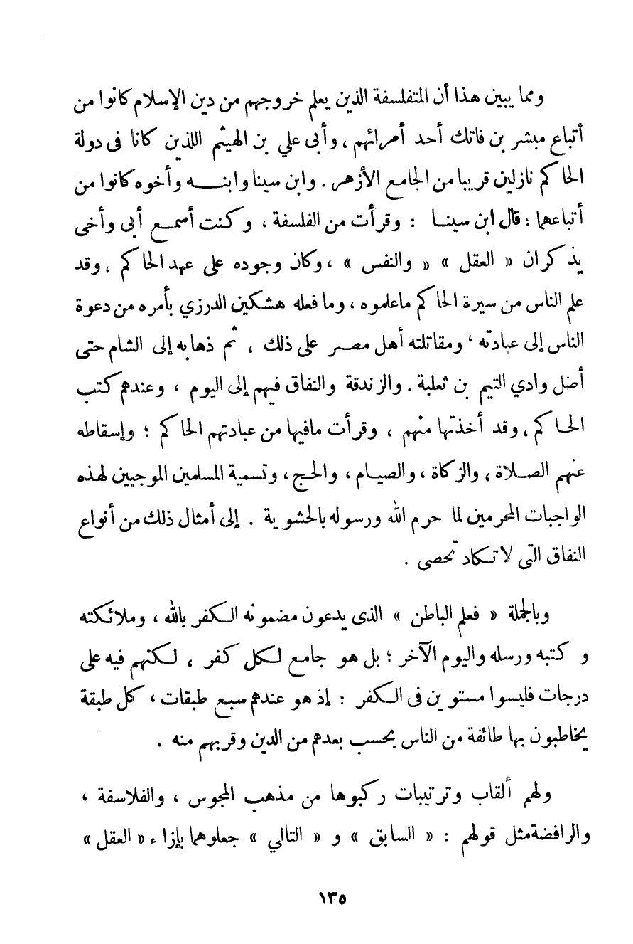 وَمِمَّا يُبَيِّنُ هَذَا أَنَّ الْمُتَفَلْسِفَةَ الَّذِينَ يُعْلَمُ خُرُوجُهُمْ مِنْ دِينِ الْإِسْلَامِ كَانُوا مِنْ أَتْبَاعِ مُبَشِّرِ بْنِ فَاتِكٍ أَحَدُ أُمَرَائِهِمْ وَأَبِي عَلِيِّ بْنِ الْهَيْثَمِ اللَّذَيْنِ كَانَا فِي دَوْلَةِ الْحُكَّامِ نَازِلَيْنِ قَرِيبًا مِنْ الْجَامِعِ الْأَزْهَرِ. وَابْنُ سِينَا وَابْنُهُ وَأَخُوهُ كَانُوا مِنْ أَتْبَاعِهِمَا. قَالَ ابْنُ سِينَا: وَقَرَأْت مِنْ الْفَلْسَفَةِ وَكُنْت أَسْمَعُ أَبِي وَأَخِي يَذْكُرَانِ " الْعَقْلَ " " وَالنَّفْسَ " وَكَانَ وُجُودُهُ عَلَى عَهْدِ الْحَاكِمِ وَقَدْ عَلِمَ النَّاسُ مِنْ سِيرَةِ الْحَاكِمِ مَا عَلِمُوهُ وَمَا فَعَلَهُ هشكين الدُّرْزِيُّ بِأَمْرِهِ مِنْ دَعْوَةِ النَّاسِ إلَى عِبَادَتِهِ وَمُقَاتَلَتِهِ أَهْلَ مِصْرَ عَلَى ذَلِكَ ثُمَّ ذَهَابِهِ إلَى الشَّامِ حَتَّى أَضَلَّ وَادِيَ التَّيْمِ بْنِ ثَعْلَبَةَ. وَالزَّنْدَقَةُ وَالنِّفَاقُ فِيهِمْ إلَى الْيَوْمِ وَعِنْدَهُمْ كُتُبُ الْحَاكِمِ وَقَدْ أَخَذْتهَا مِنْهُمْ وَقَرَأْت مَا فِيهَا مِنْ عِبَادَتِهِمْ الْحَاكِمَ؛ وَإِسْقَاطِهِ عَنْهُمْ الصَّلَاةَ وَالزَّكَاةَ وَالصِّيَامَ وَالْحَجَّ وَتَسْمِيَةِ الْمُسْلِمِينَ الْمُوجِبِينَ لِهَذِهِ الْوَاجِبَاتِ الْمُحَرِّمِينَ لِمَا حَرَّمَ اللَّهُ وَرَسُولُهُ بِالْحَشْوِيَّةِ. إلَى أَمْثَالِ ذَلِكَ مِنْ أَنْوَاعِ النِّفَاقِ الَّتِي لَا تَكَادُ تُحْصَى. وَبِالْجُمْلَةِ " فَعِلْمُ الْبَاطِنِ " الَّذِي يَدَّعُونَ مَضْمُونَهُ الْكُفْرَ بِاَللَّهِ وَمَلَائِكَتِهِ وَكُتُبِهِ وَرُسُلِهِ وَالْيَوْمِ الْآخِرِ؛ بَلْ هُوَ جَامِعٌ لِكُلِّ كُفْرٍ لَكِنَّهُمْ فِيهِ عَلَى دَرَجَاتٍ فَلَيْسُوا مُسْتَوِينَ فِي الْكُفْرِ؛ إذْ هُوَ عِنْدَهُمْ سَبْعُ طَبَقَاتٍ كُلُّ طَبَقَةٍ يُخَاطِبُونَ بِهَا طَائِفَةً مِنْ النَّاسِ بِحَسَبِ بُعْدِهِمْ مِنْ الدِّينِ وَقُرْبِهِمْ مِنْهُ. وَلَهُمْ أَلْقَابٌ وَتَرْتِيبَاتٌ رَكَّبُوهَا مِنْ مَذْهَبِ الْمَجُوسِ وَالْفَلَاسِفَةِ وَالرَّافِضَةِ مِثْلَ قَوْلِهِمْ: " السَّابِقُ " و " التَّالِي " جَعَلُوهُمَا بِإِزَاءِ " الْعَقْلِ "