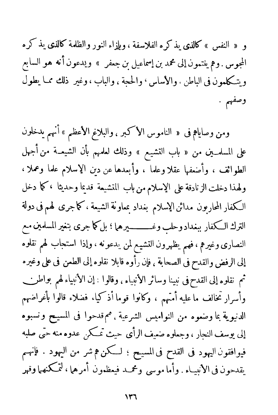 و " النَّفْسِ " كَاَلَّذِي يَذْكُرُهُ الْفَلَاسِفَةُ وَبِإِزَاءِ النُّورِ وَالظُّلْمَةِ كَاَلَّذِي يَذْكُرُهُ الْمَجُوسُ. وَهُمْ يَنْتَمُونَ إلَى مُحَمَّدِ بْنِ إسْمَاعِيلَ بْنِ جَعْفَرٍ " وَيَدَّعُونَ أَنَّهُ هُوَ السَّابِعُ وَيَتَكَلَّمُونَ فِي الْبَاطِنِ وَالْأَسَاسِ وَالْحُجَّةِ وَالْبَابِ وَغَيْرِ ذَلِكَ مِمَّا يَطُولُ وَصْفُهُمْ. وَمِنْ وَصَايَاهُمْ فِي " النَّامُوسِ الْأَكْبَرِ وَالْبَلَاغِ الْأَعْظَمِ " أَنَّهُمْ يَدْخُلُونَ عَلَى الْمُسْلِمِينَ مِنْ " بَابِ التَّشَيُّعِ " وَذَلِكَ لِعِلْمِهِمْ بِأَنَّ الشِّيعَةَ مِنْ أَجْهَلِ الطَّوَائِفِ وَأَضْعَفِهَا عَقْلًا وَعِلْمًا وَأَبْعَدِهَا عَنْ دِينِ الْإِسْلَامِ عِلْمًا وَعَمَلًا وَلِهَذَا دَخَلَتْ الزَّنَادِقَةُ عَلَى الْإِسْلَامِ مِنْ بَابِ الْمُتَشَيِّعَةِ قَدِيمًا وَحَدِيثًا كَمَا دَخَلَ الْكُفَّارُ الْمُحَارِبُونَ مَدَائِنَ الْإِسْلَامِ بَغْدَادَ بِمُعَاوَنَةِ الشِّيعَةِ كَمَا جَرَى لَهُمْ فِي دَوْلَةِ التُّرْكِ الْكُفَّارِ بِبَغْدَادَ وَحَلَبَ وَغَيْرِهِمَا؛ بَلْ كَمَا جَرَى بِتَغَيُّرِ الْمُسْلِمِينَ مَعَ النَّصَارَى وَغَيْرِهِمْ فَهُمْ يُظْهِرُونَ التَّشَيُّعَ لِمَنْ يَدْعُونَهُ وَإِذَا اسْتَجَابَ لَهُمْ نَقَلُوهُ إلَى الرَّفْضِ وَالْقَدْحِ فِي الصَّحَابَةِ فَإِنْ رَأَوْهُ قَابِلًا نَقَلُوهُ إلَى الطَّعْنِ فِي عَلِيٍّ وَغَيْرِهِ ثُمَّ نَقَلُوهُ إلَى الْقَدْحِ فِي نَبِيِّنَا وَسَائِرِ الْأَنْبِيَاءِ وَقَالُوا: إنَّ الْأَنْبِيَاءَ لَهُمْ بَوَاطِنُ وَأَسْرَارٌ تُخَالِفُ مَا عَلَيْهِ أُمَّتُهُمْ وَكَانُوا قَوْمًا أَذْكِيَاءَ فُضَلَاءَ قَالُوا بِأَغْرَاضِهِمْ الدُّنْيَوِيَّةِ بِمَا وَضَعُوهُ مِنْ النَّوَامِيسِ الشَّرْعِيَّةِ ثُمَّ قَدَحُوا فِي الْمَسِيحِ وَنَسَبُوهُ إلَى يُوسُفَ النَّجَّارِ وَجَعَلُوهُ ضَعِيفَ الرَّأْيِ حَيْثُ تَمَكَّنَ عَدُوُّهُ مِنْهُ حَتَّى صَلَبَهُ فَيُوَافِقُونَ الْيَهُودَ فِي الْقَدْحِ فِي الْمَسِيحِ؛ لَكِنْ هُمْ شَرٌّ مِنْ الْيَهُودِ. فَإِنَّهُمْ يَقْدَحُونَ فِي الْأَنْبِيَاءِ. وَأَمَّا مُوسَى وَمُحَمَّدٌ فَيُعَظِّمُونَ أَمْرَهُمَا لِتَمَكُّنِهِمَا وَقَهْرِ
