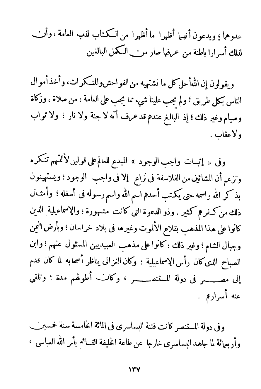 عَدُّوهُمَا؛ وَيَدَّعُونَ أَنَّهُمَا أَظْهَرَا مَا أَظْهَرَا مِنْ الْكِتَابِ لِذَبِّ الْعَامَّةِ وَأَنَّ لِذَلِكَ أَسْرَارًا بَاطِنَةً مَنْ عَرَفَهَا صَارَ مِنْ الكُمَّلِ الْبَالِغِينَ. وَيَقُولُونَ إنَّ اللَّهَ أَحَلَّ كُلَّ مَا نَشْتَهِيهِ مِنْ الْفَوَاحِشِ وَالْمُنْكَرَاتِ وَأَخَذَ أَمْوَالَ النَّاسِ بِكُلِّ طَرِيقٍ؛ وَلَمْ يَجِبْ عَلَيْنَا شَيْءٌ مِمَّا يَجِبُ عَلَى الْعَامَّةِ: مِنْ صَلَاةٍ وَزَكَاةٍ وَصِيَامٍ وَغَيْرِ ذَلِكَ؛ إذْ الْبَالِغُ عِنْدَهُمْ قَدْ عَرَفَ أَنَّهُ لَا جَنَّةَ وَلَا نَارَ؛ وَلَا ثَوَابَ وَلَا عِقَابَ. وَفِي " إثْبَاتِ وَاجِبِ الْوُجُودِ " الْمُبْدِعِ لِلْعَالِمِ عَلَى قَوْلَيْنِ لِأَئِمَّتِهِمْ تُنْكِرُهُ وَتَزْعُمُ أَنَّ الْمَشَّائِينَ مِنْ الْفَلَاسِفَةِ فِي نِزَاعٍ إلَّا فِي وَاجِبِ الْوُجُودِ؛ وَيَسْتَهِينُونَ بِذِكْرِ اللَّهِ وَاسْمِهِ حَتَّى يَكْتُبَ أَحَدُهُمْ اسْمَ اللَّهِ وَاسْمَ رَسُولِهِ فِي أَسْفَلِهِ؛ وَأَمْثَالُ ذَلِكَ مِنْ كُفْرِهِمْ كَثِيرٌ. وَذُو الدَّعْوَةِ الَّتِي كَانَتْ مَشْهُورَةً؛ والْإِسْمَاعِيلِيَّة الَّذِينَ كَانُوا عَلَى هَذَا الْمَذْهَبِ بِقِلَاعِ الألموت وَغَيْرِهَا فِي بِلَادِ خُرَاسَانَ؛ وَبِأَرْضِ الْيَمَنِ وَجِبَالِ الشَّامِ؛ وَغَيْرِ ذَلِكَ: كَانُوا عَلَى مَذْهَبٍ العبيديين الْمَسْئُولُ عَنْهُمْ؛ وَابْنُ الصَّبَاحِ الَّذِي كَانَ رَأْسَ الْإِسْمَاعِيلِيَّة؛ وَكَانَ الْغَزَالِيُّ يُنَاظِرُ أَصْحَابَهُ لَمَّا كَانَ قَدِمَ إلَى مِصْرَ فِي دَوْلَةِ الْمُسْتَنْصِرِ وَكَانَ أَطْوَلَهُمْ مُدَّةً؛ وَتَلَقَّى عَنْهُ أَسْرَارَهُمْ. وَفِي دَوْلَةِ الْمُسْتَنْصِرِ كَانَتْ فِتْنَةُ البساسري فِي الْمِائَةِ الْخَامِسَةِ سَنَةَ خَمْسِينَ وَأَرْبَعِمِائَةٍ لَمَّا جَاهَدَ البساسري خَارِجًا عَنْ طَاعَةِ الْخَلِيفَةِ الْقَائِمِ بِأَمْرِ اللَّهِ الْعَبَّاسِيِّ