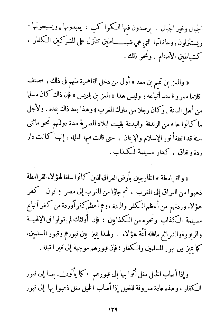 الْجِبَالِ وَغَيْرِ الْجِبَالِ يَرْصُدُونَ فِيهَا الْكَوَاكِبَ يَعْبُدُونَهَا وَيُسَبِّحُونَهَا ويستنزلون رُوحَانِيَّاتِهَا الَّتِي هِيَ شَيَاطِينُ تَتَنَزَّلُ عَلَى الْمُشْرِكِينَ الْكُفَّارِ كَشَيَاطِينِ الْأَصْنَامِ وَنَحْوِ ذَلِكَ. " وَالْمُعِزُّ بْنُ تَمِيمِ بْنِ مَعْدٍ " أَوَّلُ مَنْ دَخَلَ الْقَاهِرَةَ مِنْهُمْ فِي ذَلِكَ فَصَنَّفَ كَلَامًا مَعْرُوفًا عِنْدَ أَتْبَاعِهِ؛ وَلَيْسَ هَذَا " الْمُعِزَّ بْنَ باديس " فَإِنَّ ذَاكَ كَانَ مُسْلِمًا مِنْ أَهْلِ السُّنَّةِ وَكَانَ رَجُلًا مِنْ مُلُوكِ الْمَغْرِبِ؛ وَهَذَا بَعْدَ ذَاكَ بِمُدَّةِ. وَلِأَجْلِ مَا كَانُوا عَلَيْهِ مِنْ الزَّنْدَقَةِ وَالْبِدْعَةِ بَقِيَتْ الْبِلَادُ الْمِصْرِيَّةُ مُدَّةَ دَوْلَتِهِمْ نَحْوَ مِائَتَيْ سَنَةٍ قَدْ انْطَفَأَ نُورُ الْإِسْلَامِ وَالْإِيمَانِ حَتَّى قَالَتْ فِيهَا الْعُلَمَاءُ: إنَّهَا كَانَتْ دَارَ رِدَّةٍ وَنِفَاقٍ كَدَارِ مُسَيْلِمَةِ الْكَذَّابِ. " وَالْقَرَامِطَةِ " الْخَارِجِينَ بِأَرْضِ الْعِرَاقِ الَّذِينَ كَانُوا سَلَفًا لِهَؤُلَاءِ الْقَرَامِطَةِ ذَهَبُوا مِنْ الْعِرَاقِ إلَى الْمَغْرِبِ ثُمَّ جَاءُوا مِنْ الْمَغْرِبِ إلَى مِصْرَ؛ فَإِنَّ كُفْرَ هَؤُلَاءِ وَرِدَّتَهُمْ مِنْ أَعْظَمِ الْكُفْرِ وَالرِّدَّةِ وَهُمْ أَعْظَمُ كُفْرًا وَرِدَّةً مِنْ كُفْرِ أَتْبَاعِ مُسَيْلِمَةَ الْكَذَّابِ وَنَحْوِهِ مِنْ الْكَذَّابِينَ؛ فَإِنَّ أُولَئِكَ لَمْ يَقُولُوا فِي الْإِلَهِيَّةِ وَالرُّبُوبِيَّةِ وَالشَّرَائِعِ مَا قَالَهُ أَئِمَّةُ هَؤُلَاءِ. وَلِهَذَا يُمَيَّزُ بَيْنَ قُبُورِهِمْ وَقُبُورِ الْمُسْلِمِينَ كَمَا يُمَيَّزُ بَيْنَ قُبُورِ الْمُسْلِمِينَ وَالْكُفَّارِ؛ فَإِنَّ قُبُورَهُمْ مُوَجَّهَةٌ إلَى غَيْرِ الْقِبْلَةِ. وَإِذَا أَصَابَ الْخَيْلَ مَغْلٌ أَتَوْا بِهَا إلَى قُبُورِهِمْ كَمَا يَأْتُونَ بِهَا إلَى قُبُورِ الْكُفَّارِ وَهَذِهِ عَادَةٌ مَعْرُوفَةٌ لِلْخَيْلِ إذَا أَصَابَ الْخَيْلَ مَغْلٌ ذَهَبُوا بِهَا إلَى قُبُورِ