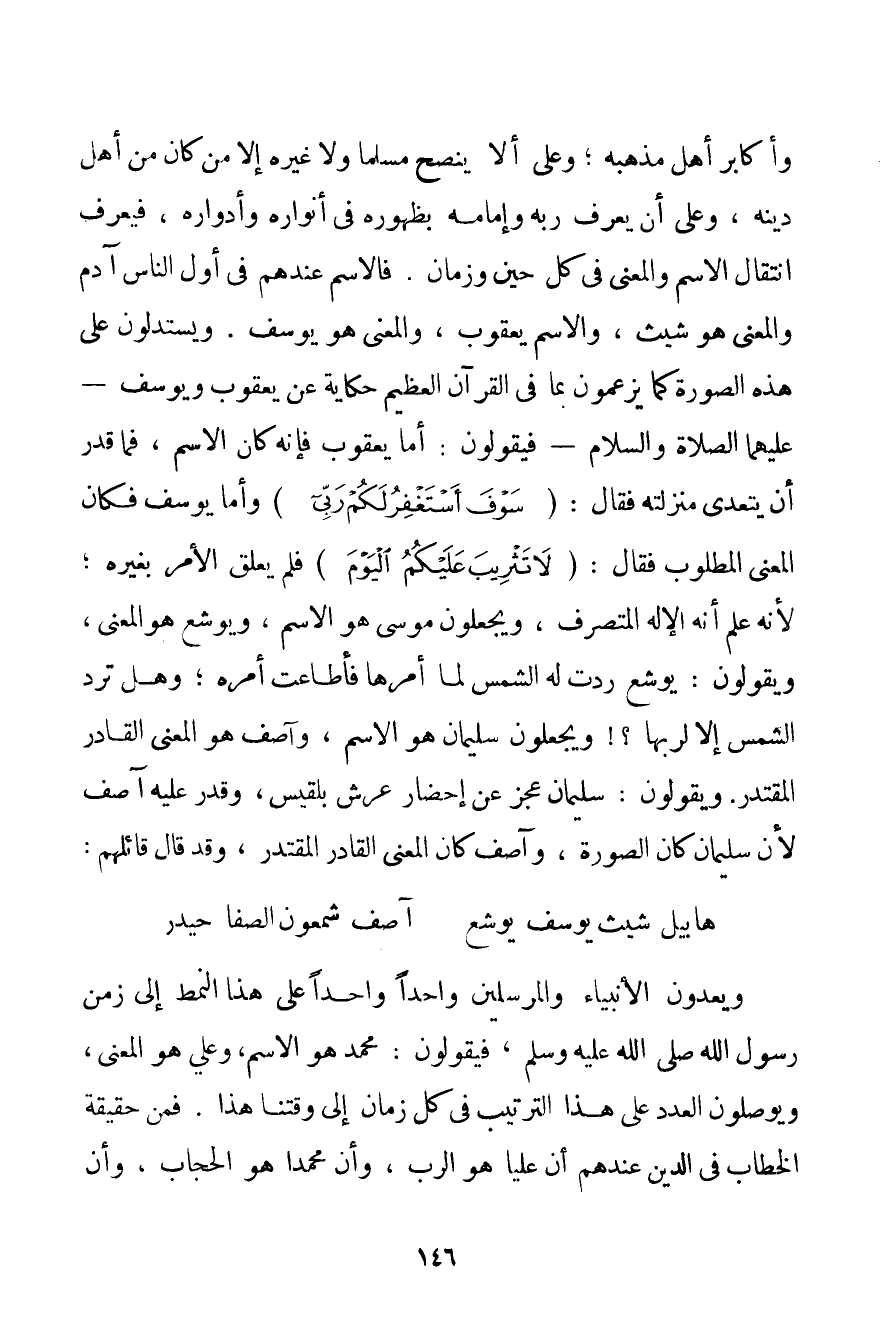 وَأَكَابِرِ أَهْلِ مَذْهَبِهِ؛ وَعَلَى أَلَّا يَنْصَحَ مُسْلِمًا وَلَا غَيْرَهُ إلَّا مَنْ كَانَ مِنْ أَهْلِ دِينِهِ وَعَلَى أَنْ يَعْرِفَ رَبَّهُ وَإِمَامَهُ بِظُهُورِهِ فِي أَنْوَارِهِ وَأَدْوَارِهِ فَيَعْرِفُ انْتِقَالَ الِاسْمِ وَالْمَعْنَى فِي كُلِّ حِينٍ وَزَمَانٍ. فَالِاسْمُ عِنْدَهُمْ فِي أَوَّلِ النَّاسِ آدَمَ وَالْمَعْنَى هُوَ شيث وَالِاسْمُ يَعْقُوبُ وَالْمَعْنَى هُوَ يُوسُفُ. وَيَسْتَدِلُّونَ عَلَى هَذِهِ الصُّورَةِ كَمَا يَزْعُمُونَ بِمَا فِي الْقُرْآنِ الْعَظِيمِ حِكَايَةً عَنْ يَعْقُوبَ وَيُوسُفَ - عَلَيْهِمَا الصَّلَاةُ وَالسَّلَامُ - فَيَقُولُونَ: أَمَّا يَعْقُوبُ فَإِنَّهُ كَانَ الِاسْمَ فَمَا قَدَرَ أَنْ يَتَعَدَّى مَنْزِلَتَهُ فَقَالَ: {سَوْفَ أَسْتَغْفِرُ لَكُمْ رَبِّي} وَأَمَّا يُوسُفُ فَكَانَ الْمَعْنَى الْمَطْلُوبَ فَقَالَ: {لَا تَثْرِيبَ عَلَيْكُمُ الْيَوْمَ} فَلَمْ يُعَلِّقْ الْأَمْرَ بِغَيْرِهِ؛ لِأَنَّهُ عَلِمَ أَنَّهُ الْإِلَهُ الْمُتَصَرِّفُ وَيَجْعَلُونَ مُوسَى هُوَ الِاسْمَ وَيُوشَعَ هُوَ الْمَعْنَى وَيَقُولُونَ: يُوشَعُ رُدَّتْ لَهُ الشَّمْسُ لَمَّا أَمَرَهَا فَأَطَاعَتْ أَمْرَهُ؛ وَهَلْ تُرَدُّ الشَّمْسُ إلَّا لِرَبِّهَا وَيَجْعَلُونَ سُلَيْمَانَ هُوَ الِاسْمَ وآصف هُوَ الْمَعْنَى الْقَادِرُ الْمُقْتَدِرُ. وَيَقُولُونَ: سُلَيْمَانُ عَجَزَ عَنْ إحْضَارِ عَرْشِ بلقيس وَقَدَرَ عَلَيْهِ آصف لِأَنَّ سُلَيْمَانَ كَانَ الصُّورَةَ وآصف كَانَ الْمَعْنَى الْقَادِرَ الْمُقْتَدِرَ وَقَدْ قَالَ قَائِلُهُمْ: هَابِيلُ شيث يُوسُفُ يُوشَعُ آصف شمعون الصَّفَا حَيْدَرُ وَيَعُدُّونَ الْأَنْبِيَاءَ وَالْمُرْسَلِينَ وَاحِدًا وَاحِدًا عَلَى هَذَا النَّمَطِ إلَى زَمَنِ رَسُولِ اللَّهِ صَلَّى اللَّهُ عَلَيْهِ وَسَلَّمَ فَيَقُولُونَ: مُحَمَّدٌ هُوَ الِاسْمُ وَعَلِيٌّ هُوَ الْمَعْنَى وَيُوصِلُونَ الْعَدَدَ عَلَى هَذَا التَّرْتِيبِ فِي كُلِّ زَمَانٍ إلَى وَقْتِنَا هَذَا. فَمِنْ حَقِيقَةِ الْخِطَابِ فِي الدِّينِ عِنْدَهُمْ أَنَّ عَلِيًّا هُوَ الرَّبُّ وَأَنْ مُحَمَّدًا هُوَ الْحِجَابُ