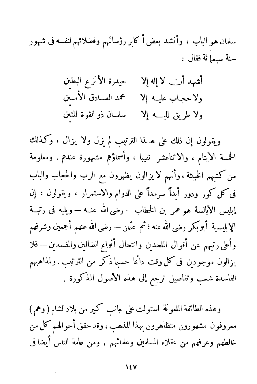 وَأَنَّ سَلْمَانَ هُوَ الْبَابُ وَأَنْشَدَ بَعْضُ أَكَابِرِ رُؤَسَائِهِمْ وَفُضَلَائِهِمْ لِنَفْسِهِ فِي شُهُورِ سَنَةِ سَبْعِمِائَةٍ فَقَالَ: أَشْهَدُ أَنْ لَا إلَهَ إلَّا حيدرة الْأَنْزَعُ الْبَطِينُ وَلَا حِجَابَ عَلَيْهِ إلَّا مُحَمَّدٌ الصَّادِقُ الْأَمِينُ وَلَا طَرِيقَ إلَيْهِ إلَّا سَلْمَانُ ذُو الْقُوَّةِ الْمَتِينُ وَيَقُولُونَ إنَّ ذَلِكَ عَلَى هَذَا التَّرْتِيبِ لَمْ يَزَلْ وَلَا يَزَالُ وَكَذَلِكَ الْخَمْسَةُ الْأَيْتَامُ وَالِاثْنَا عَشَرَ نَقِيبًا وَأَسْمَاؤُهُمْ مَشْهُورَةٌ عِنْدَهُمْ وَمَعْلُومَةٌ مِنْ كُتُبِهِمْ الْخَبِيثَةِ وَأَنَّهُمْ لَا يَزَالُونَ يُظْهِرُونَ مَعَ الرَّبِّ وَالْحِجَابِ وَالْبَابِ فِي كُلٍّ كَوْرٍ وَدَوْرٍ أَبَدًا سَرْمَدًا عَلَى الدَّوَامِ وَالِاسْتِمْرَارِ وَيَقُولُونَ: إنَّ إبْلِيسَ الْأَبَالِسَةِ هُوَ عُمَرُ بْنُ الْخَطَّابِ - رَضِيَ اللَّهُ عَنْهُ - وَيَلِيهِ فِي رُتْبَةِ الإبليسية أَبُو بَكْرٍ رَضِيَ اللَّهُ عَنْهُ ثُمَّ عُثْمَانُ - رَضِيَ اللَّهُ عَنْهُمْ أَجْمَعِينَ وَشَرَّفَهُمْ وَأَعْلَى رُتَبَهُمْ عَنْ أَقْوَالِ الْمُلْحِدِينَ وَانْتِحَالِ أَنْوَاعِ الضَّالِّينَ وَالْمُفْسِدِينَ - فَلَا يَزَالُونَ مَوْجُودِينَ فِي كُلِّ وَقْتٍ دَائِمًا حَسْبَمَا ذُكِرَ مِنْ التَّرْتِيبِ. وَلِمَذَاهِبِهِمْ الْفَاسِدَةِ شُعَبٌ وَتَفَاصِيلُ تَرْجِعُ إلَى هَذِهِ الْأُصُولِ الْمَذْكُورَةِ. وَهَذِهِ الطَّائِفَةُ الْمَلْعُونَةُ اسْتَوْلَتْ عَلَى جَانِبٍ كَبِيرٍ مِنْ بِلَادِ الشَّامِ (وَهُمْ مَعْرُوفُونَ مَشْهُورُونَ مُتَظَاهِرُونَ بِهَذَا الْمَذْهَبِ وَقَدْ حَقَّقَ أَحْوَالَهُمْ كُلُّ مَنْ خَالَطَهُمْ وَعَرَفَهُمْ مِنْ عُقَلَاءَ الْمُسْلِمِينَ وَعُلَمَائِهِمْ وَمِنْ عَامَّةِ النَّاسِ أَيْضًا فِي