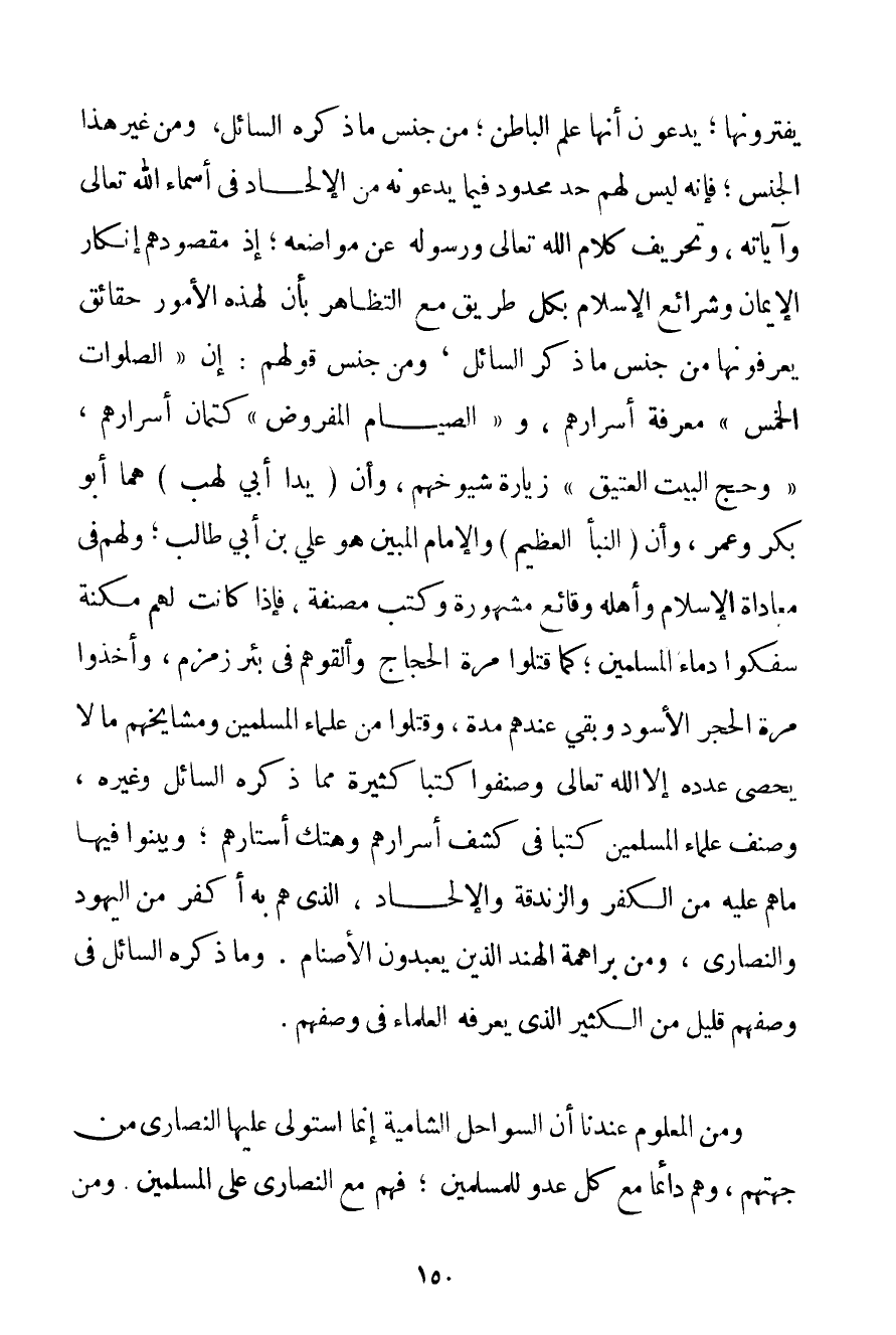 يَفْتَرُونَهَا؛ يَدَّعُونَ أَنَّهَا عِلْمُ الْبَاطِنِ؛ مِنْ جِنْسِ مَا ذَكَرَهُ السَّائِلُ وَمِنْ غَيْرِ هَذَا الْجِنْسِ؛ فَإِنَّهُ لَيْسَ لَهُمْ حَدٌّ مَحْدُودٌ فِيمَا يَدَّعُونَهُ مِنْ الْإِلْحَادِ فِي أَسْمَاءِ اللَّهِ تَعَالَى وَآيَاتِهِ وَتَحْرِيفِ كَلَامِ اللَّهِ تَعَالَى وَرَسُولِهِ عَنْ مَوَاضِعِهِ؛ إذْ مَقْصُودُهُمْ إنْكَارُ الْإِيمَانِ وَشَرَائِعِ الْإِسْلَامِ بِكُلِّ طَرِيقٍ مَعَ التَّظَاهُرِ بِأَنَّ لِهَذِهِ الْأُمُورِ حَقَائِقُ يَعْرِفُونَهَا مِنْ جِنْسِ مَا ذَكَرَ السَّائِلُ وَمِنْ جِنْسِ قَوْلِهِمْ: إنَّ " الصَّلَوَاتِ الْخَمْسَ " مَعْرِفَةُ أَسْرَارِهِمْ و " الصِّيَامَ الْمَفْرُوضَ " كِتْمَانُ أَسْرَارِهِمْ " وَحَجَّ الْبَيْتِ الْعَتِيقِ " زِيَارَةُ شُيُوخِهِمْ وَأَنَّ (يَدَا أَبِي لَهَبٍ) هُمَا أَبُو بَكْرٍ وَعُمَرُ وَأَنَّ (النَّبَأَ الْعَظِيمَ وَالْإِمَامَ الْمُبِينَ) هُوَ عَلِيُّ بْنُ أَبِي طَالِبٍ؛ وَلَهُمْ فِي مُعَادَاةِ الْإِسْلَامِ وَأَهْلِهِ وَقَائِعُ مَشْهُورَةٌ وَكُتُبٌ مُصَنَّفَةٌ فَإِذَا كَانَتْ لَهُمْ مُكْنَةٌ سَفَكُوا دِمَاءَ الْمُسْلِمِينَ؛ كَمَا قَتَلُوا مَرَّةً الْحُجَّاجَ وَأَلْقَوْهُمْ فِي بِئْرِ زَمْزَمَ وَأَخَذُوا مَرَّةً الْحَجَرَ الْأَسْوَدَ وَبَقِيَ عِنْدَهُمْ مُدَّةً وَقَتَلُوا مِنْ عُلَمَاءِ الْمُسْلِمِينَ وَمَشَايِخِهِمْ مَا لَا يُحْصِي عَدَدَهُ إلَّا اللَّهُ تَعَالَى وَصَنَّفُوا كُتُبًا كَثِيرَةً مِمَّا ذَكَرَهُ السَّائِلُ وَغَيْرُهُ وَصَنَّفَ عُلَمَاءُ الْمُسْلِمِينَ كُتُبًا فِي كَشْفِ أَسْرَارِهِمْ وَهَتْكِ أَسْتَارِهِمْ؛ وَبَيَّنُوا فِيهَا مَا هُمْ عَلَيْهِ مِنْ الْكُفْرِ وَالزَّنْدَقَةِ وَالْإِلْحَادِ الَّذِي هُمْ بِهِ أَكْفَرُ مِنْ الْيَهُودِ وَالنَّصَارَى وَمِنْ براهمة الْهِنْدِ الَّذِينَ يَعْبُدُونَ الْأَصْنَامَ. وَمَا ذَكَرَهُ السَّائِلُ فِي وَصْفِهِمْ قَلِيلٌ مِنْ الْكَثِيرِ الَّذِي يَعْرِفُهُ الْعُلَمَاءُ فِي وَصْفِهِمْ. وَمِنْ الْمَعْلُومِ عِنْدَنَا أَنَّ السَّوَاحِلَ الشَّامِيَّةَ إنَّمَا اسْتَوْلَى عَلَيْهَا النَّصَارَى مِنْ جِهَتِهِمْ وَهُمْ دَائِمًا مَعَ كُلِّ عَدُوٍّ لِلْمُسْلِمِينَ؛ فَهُمْ مَعَ النَّصَارَى عَلَى الْمُسْلِمِينَ. وَمِنْ