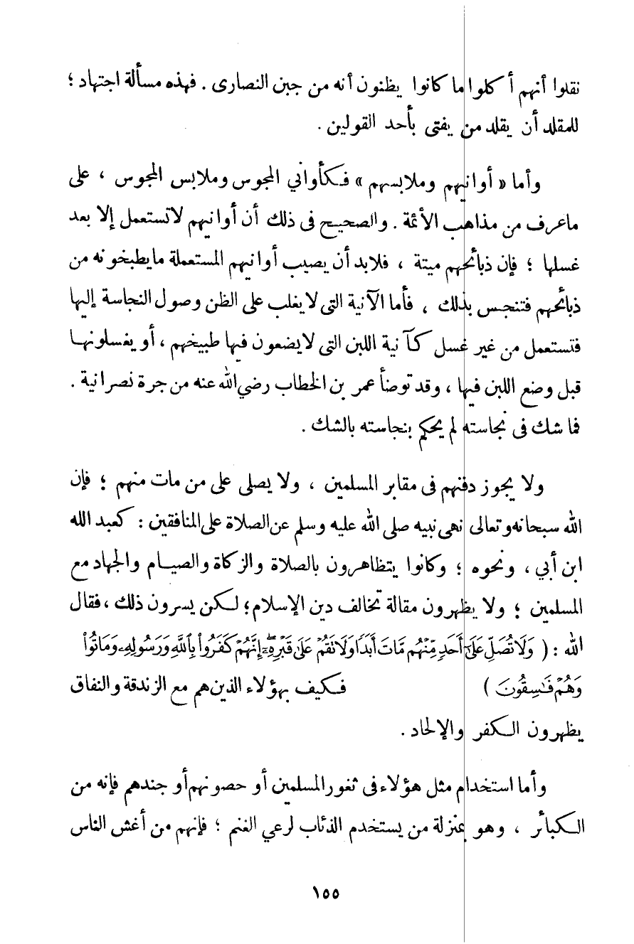 نَقَلُوا أَنَّهُمْ أَكَلُوا مَا كَانُوا يَظُنُّونَ أَنَّهُ مِنْ جُبْنِ النَّصَارَى. فَهَذِهِ مَسْأَلَةُ اجْتِهَادٍ؛ لِلْمُقَلِّدِ أَنْ يُقَلِّدَ مَنْ يُفْتِي بِأَحَدِ الْقَوْلَيْنِ. وَأَمَّا " أَوَانِيهمْ وَمَلَابِسُهُمْ " فَكَأَوَانِي الْمَجُوسِ وَمَلَابِسِ الْمَجُوسِ عَلَى مَا عُرِفَ مِنْ مَذَاهِبِ الْأَئِمَّةِ. وَالصَّحِيحُ فِي ذَلِكَ أَنَّ أَوَانِيَهُمْ لَا تُسْتَعْمَلُ إلَّا بَعْدَ غَسْلِهَا؛ فَإِنَّ ذَبَائِحَهُمْ مَيْتَةٌ فَلَا بُدَّ أَنْ يُصِيبَ أَوَانِيَهُمْ الْمُسْتَعْمَلَةَ مَا يَطْبُخُونَهُ مِنْ ذَبَائِحِهِمْ فَتَنْجُسُ بِذَلِكَ فَأَمَّا الْآنِيَةُ الَّتِي لَا يَغْلِبُ عَلَى الظَّنِّ وُصُولُ النَّجَاسَةِ إلَيْهَا فَتُسْتَعْمَلُ مِنْ غَيْرِ غَسْلٍ كَآنِيَةِ اللَّبَنِ الَّتِي لَا يَضَعُونَ فِيهَا طَبِيخَهُمْ أَوْ يَغْسِلُونَهَا قَبْلَ وَضْعِ اللَّبَنِ فِيهَا وَقَدْ تَوَضَّأَ عُمَرُ بْنُ الْخَطَّابِ رَضِيَ اللَّهُ عَنْهُ مِنْ جَرَّةِ نَصْرَانِيَّةٍ. فَمَا شُكَّ فِي نَجَاسَتِهِ لَمْ يُحْكَمْ بِنَجَاسَتِهِ بِالشَّكِّ. وَلَا يَجُوزُ دَفْنُهُمْ فِي مَقَابِرِ الْمُسْلِمِينَ وَلَا يُصَلَّى عَلَى مَنْ مَاتَ مِنْهُمْ؛ فَإِنَّ اللَّهَ سُبْحَانَهُ وَتَعَالَى نَهَى نَبِيَّهُ صَلَّى اللَّهُ عَلَيْهِ وَسَلَّمَ عَنْ الصَّلَاةِ عَلَى الْمُنَافِقِينَ: كَعَبْدِ اللَّهِ ابْن أبي وَنَحْوِهِ؛ وَكَانُوا يَتَظَاهَرُونَ بِالصَّلَاةِ وَالزَّكَاةِ وَالصِّيَامِ وَالْجِهَادِ مَعَ الْمُسْلِمِينَ؛ وَلَا يُظْهِرُونَ مَقَالَةً تُخَالِفُ دِينَ الْإِسْلَامِ؛ لَكِنْ يُسِرُّونَ ذَلِكَ فَقَالَ اللَّهُ: {وَلَا تُصَلِّ عَلَى أَحَدٍ مِنْهُمْ مَاتَ أَبَدًا وَلَا تَقُمْ عَلَى قَبْرِهِ إنَّهُمْ كَفَرُوا بِاللَّهِ وَرَسُولِهِ وَمَاتُوا وَهُمْ فَاسِقُونَ} فَكَيْفَ بِهَؤُلَاءِ الَّذِينَ هُمْ مَعَ الزَّنْدَقَةِ وَالنِّفَاقِ يُظْهِرُونَ الْكُفْرَ وَالْإِلْحَادَ.