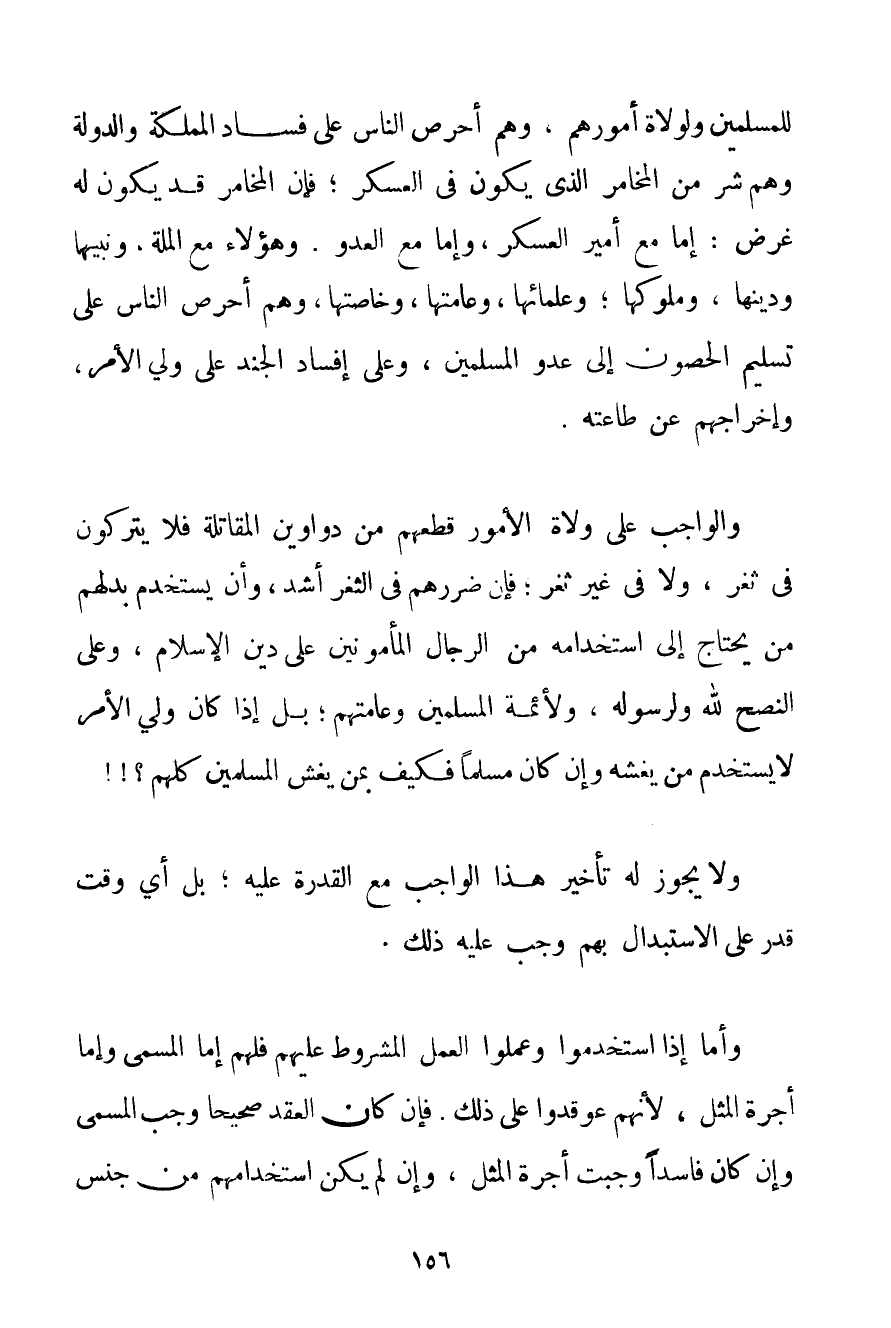 لِلْمُسْلِمِينَ وَلِوُلَاةِ أُمُورِهِمْ وَهُمْ أَحْرَصُ النَّاسِ عَلَى فَسَادِ الْمَمْلَكَةِ وَالدَّوْلَةِ وَهُمْ شَرٌّ مِنْ الْمُخَامِرِ الَّذِي يَكُونُ فِي الْعَسْكَرِ؛ فَإِنَّ الْمُخَامِرَ قَدْ يَكُونُ لَهُ غَرَضٌ: إمَّا مَعَ أَمِيرِ الْعَسْكَرِ وَإِمَّا مَعَ الْعَدُوِّ. وَهَؤُلَاءِ مَعَ الْمِلَّةِ وَنَبِيِّهَا وَدِينِهَا وَمُلُوكِهَا؛ وَعُلَمَائِهَا وَعَامَّتِهَا وَخَاصَّتِهَا وَهُمْ أَحْرَصُ النَّاسِ عَلَى تَسْلِيمِ الْحُصُونِ إلَى عَدُوِّ الْمُسْلِمِينَ وَعَلَى إفْسَادِ الْجُنْدِ عَلَى وَلِيِّ الْأَمْرِ وَإِخْرَاجِهِمْ عَنْ طَاعَتِهِ. وَالْوَاجِبُ عَلَى وُلَاةِ الْأُمُورِ قَطْعُهُمْ مِنْ دَوَاوِينِ الْمُقَاتِلَةِ فَلَا يُتْرَكُونَ فِي ثَغْرٍ وَلَا فِي غَيْرِ ثَغْرٍ؛ فَإِنَّ ضَرَرَهُمْ فِي الثَّغْرِ أَشَدُّ وَأَنْ يَسْتَخْدِمَ بَدَلَهُمْ مَنْ يَحْتَاجُ إلَى اسْتِخْدَامِهِ مِنْ الرِّجَالِ الْمَأْمُونِينَ عَلَى دِينِ الْإِسْلَامِ وَعَلَى النُّصْحِ لِلَّهِ وَلِرَسُولِهِ وَلِأَئِمَّةِ الْمُسْلِمِينَ وَعَامَّتِهِمْ؛ بَلْ إذَا كَانَ وَلِيُّ الْأَمْرِ لَا يَسْتَخْدِمُ مَنْ يَغُشُّهُ وَإِنْ كَانَ مُسْلِمًا فَكَيْفَ بِمَنْ يَغُشُّ الْمُسْلِمِينَ كُلَّهُمْ وَلَا يَجُوزُ لَهُ تَأْخِيرُ هَذَا الْوَاجِبِ مَعَ الْقُدْرَةِ عَلَيْهِ بَلْ أَيُّ وَقْتٍ قَدَرَ عَلَى الِاسْتِبْدَالِ بِهِمْ وَجَبَ عَلَيْهِ ذَلِكَ. وَأَمَّا إذَا اُسْتُخْدِمُوا وَعَمِلُوا الْعَمَلَ الْمَشْرُوطَ عَلَيْهِمْ فَلَهُمْ إمَّا الْمُسَمَّى وَإِمَّا أُجْرَةُ الْمِثْلِ لِأَنَّهُمْ عوقدوا عَلَى ذَلِكَ. فَإِنْ كَانَ الْعَقْدُ صَحِيحًا وَجَبَ الْمُسَمَّى وَإِنْ كَانَ فَاسِدًا وَجَبَتْ أُجْرَةُ الْمِثْلِ وَإِنْ لَمْ يَكُنْ اسْتِخْدَامُهُمْ مِنْ جِنْسِ