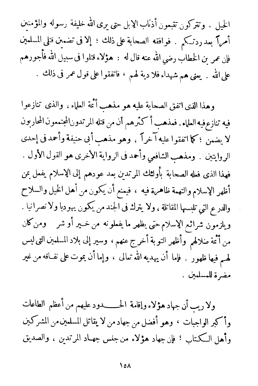 الْخَيْلِ وَتُتْرَكُونَ تَتَّبِعُونَ أَذْنَابَ الْإِبِلِ حَتَّى يَرَى اللَّهُ خَلِيفَةَ رَسُولِهِ وَالْمُؤْمِنَيْنِ أَمْرًا بَعْدَ رِدَّتِكُمْ. فَوَافَقَهُ الصَّحَابَةُ فِي ذَلِكَ؛ إلَّا فِي تَضْمِينِ قَتْلَى الْمُسْلِمِينَ فَإِنَّ عُمَرَ بْنَ الْخَطَّابِ رَضِيَ اللَّهُ عَنْهُ قَالَ لَهُ: هَؤُلَاءِ قُتِلُوا فِي سَبِيلِ اللَّهِ فَأُجُورُهُمْ عَلَى اللَّهِ. يَعْنِي هُمْ شُهَدَاءُ فَلَا دِيَةَ لَهُمْ فَاتَّفَقُوا عَلَى قَوْلِ عُمَرَ فِي ذَلِكَ. وَهَذَا الَّذِي اتَّفَقَ الصَّحَابَةُ عَلَيْهِ هُوَ مَذْهَبُ أَئِمَّةِ الْعُلَمَاءِ وَاَلَّذِي تَنَازَعُوا فِيهِ تَنَازَعَ فِيهِ الْعُلَمَاءُ. فَمَذْهَبُ أَكْثَرِهِمْ أَنَّ مَنْ قَتَلَهُ الْمُرْتَدُّونَ الْمُجْتَمِعُونَ الْمُحَارِبُونَ لَا يُضْمَنُ؛ كَمَا اتَّفَقُوا عَلَيْهِ آخِرًا وَهُوَ مَذْهَبُ أَبِي حَنِيفَةَ وَأَحْمَد فِي إحْدَى الرِّوَايَتَيْنِ. وَمَذْهَبُ الشَّافِعِيِّ وَأَحْمَد فِي الرِّوَايَةِ الْأُخْرَى هُوَ الْقَوْلُ الْأَوَّلُ. فَهَذَا الَّذِي فَعَلَهُ الصَّحَابَةُ بِأُولَئِكَ الْمُرْتَدِّينَ بَعْدَ عَوْدِهِمْ إلَى الْإِسْلَامِ يُفْعَلُ بِمَنْ أَظْهَرَ الْإِسْلَامَ وَالتُّهْمَةُ ظَاهِرَةٌ فِيهِ فَيُمْنَعُ أَنْ يَكُونَ مِنْ أَهْلِ الْخَيْلِ وَالسِّلَاحِ وَالدِّرْعِ الَّتِي تَلْبَسُهَا الْمُقَاتِلَةُ وَلَا يُتْرَكُ فِي الْجُنْدِ مَنْ يَكُونُ يَهُودِيًّا وَلَا نَصْرَانِيًّا. وَيُلْزَمُونَ شَرَائِعَ الْإِسْلَامِ حَتَّى يَظْهَرَ مَا يَفْعَلُونَهُ مِنْ خَيْرٍ أَوْ شَرٍّ وَمَنْ كَانَ مِنْ أَئِمَّةِ ضُلَّالِهِمْ وَأَظْهَرَ التَّوْبَةَ أُخْرِجَ عَنْهُمْ وَسُيِّرَ إلَى بِلَادِ الْمُسْلِمِينَ الَّتِي لَيْسَ لَهُمْ فِيهَا ظُهُورٌ. فَإِمَّا أَنْ يَهْدِيَهُ اللَّهُ تَعَالَى وَإِمَّا أَنْ يَمُوتَ عَلَى نِفَاقِهِ مِنْ غَيْرِ مَضَرَّةٍ لِلْمُسْلِمِينَ. وَلَا رَيْبَ أَنَّ جِهَادَ هَؤُلَاءِ وَإِقَامَةَ الْحُدُودِ عَلَيْهِمْ مِنْ أَعْظَمِ الطَّاعَاتِ وَأَكْبَرِ الْوَاجِبَاتِ وَهُوَ أَفْضَلُ مِنْ جِهَادِ مَنْ لَا يُقَاتِلُ الْمُسْلِمِينَ مِنْ الْمُشْرِكِينَ وَأَهْلِ الْكِتَابِ؛ فَإِنَّ جِهَادَ هَؤُلَاءِ مِنْ جِنْسِ جِهَادِ الْمُرْتَدِّينَ وَالصِّدِّيقُ