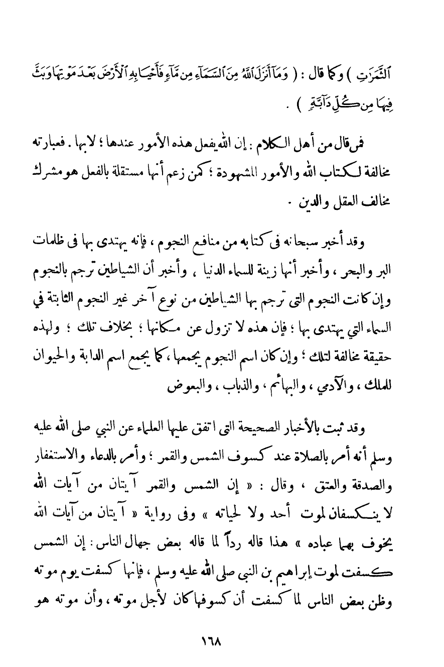 مِنْ كُلِّ الثَّمَرَاتِ} وَكَمَا قَالَ: {وَمَا أَنْزَلَ اللَّهُ مِنَ السَّمَاءِ مِنْ مَاءٍ فَأَحْيَا بِهِ الْأَرْضَ بَعْدَ مَوْتِهَا وَبَثَّ فِيهَا مِنْ كُلِّ دَابَّةٍ} . فَمَنْ قَالَ مِنْ أَهْلِ الْكَلَامِ: إنَّ اللَّهَ يَفْعَلُ هَذِهِ الْأُمُورَ عِنْدَهَا؛ لَا بِهَا. فَعِبَارَتُهُ مُخَالِفَةٌ لِكِتَابِ اللَّهِ وَالْأُمُورِ الْمَشْهُودَةِ؛ كَمَنْ زَعَمَ أَنَّهَا مُسْتَقِلَّةٌ بِالْفِعْلِ هُوَ مُشْرِكٌ مُخَالِفٌ الْعَقْلَ وَالدِّينَ. وَقَدْ أَخْبَرَ سُبْحَانَهُ فِي كِتَابِهِ مِنْ مَنَافِعَ النُّجُومِ فَإِنَّهُ يُهْتَدَى بِهَا فِي ظُلُمَاتِ الْبَرِّ وَالْبَحْرِ وَأَخْبَرَ أَنَّهَا زِينَةٌ لِلسَّمَاءِ الدُّنْيَا وَأَخْبَرَ أَنَّ الشَّيَاطِينَ تُرْجَمُ بِالنُّجُومِ وَإِنْ كَانَتْ النُّجُومُ الَّتِي تُرْجَمُ بِهَا الشَّيَاطِينُ مِنْ نَوْعٍ آخَرَ غَيْرَ النُّجُومِ الثَّابِتَةِ فِي السَّمَاءِ الَّتِي يُهْتَدَى بِهَا؛ فَإِنَّ هَذِهِ لَا تَزُولُ عَنْ مَكَانِهَا؛ بِخِلَافِ تِلْكَ؛ وَلِهَذِهِ حَقِيقَةٌ مُخَالِفَةٌ لِتِلْكَ؛ وَإِنْ كَانَ اسْمُ النُّجُومِ يَجْمَعُهَا؛ كَمَا يَجْمَعُ اسْمَ الدَّابَّةِ وَالْحَيَوَانِ لِلْمَلَكِ وَالْآدَمِيِّ وَالْبَهَائِمِ وَالذُّبَابِ وَالْبَعُوضِ. وَقَدْ ثَبَتَ بِالْأَخْبَارِ الصَّحِيحَةِ الَّتِي اتَّفَقَ عَلَيْهَا الْعُلَمَاءُ عَنْ النَّبِيِّ صَلَّى اللَّهُ عَلَيْهِ وَسَلَّمَ أَنَّهُ أَمَرَ بِالصَّلَاةِ عِنْدَ كُسُوفِ الشَّمْسِ وَالْقَمَرِ؛ وَأَمَرَ بِالدُّعَاءِ وَالِاسْتِغْفَارِ وَالصَّدَقَةِ وَالْعِتْقِ وَقَالَ: {إنَّ الشَّمْسَ وَالْقَمَرَ آيَتَانِ مِنْ آيَاتِ اللَّهِ لَا يَنْكَسِفَانِ لِمَوْتِ أَحَدٍ وَلَا لِحَيَاتِهِ} " وَفِي رِوَايَةٍ " {آيَتَانِ مِنْ آيَاتِ اللَّهِ يُخَوِّفُ بِهِمَا عِبَادَهُ} " هَذَا قَالَهُ رَدًّا لِمَا قَالَهُ بَعْضُ جُهَّالِ النَّاسِ: إنَّ الشَّمْسَ كَسَفَتْ لِمَوْتِ إبْرَاهِيمَ ابْنِ النَّبِيِّ صَلَّى اللَّهُ عَلَيْهِ وَسَلَّمَ فَإِنَّهَا كَسَفَتْ يَوْمَ مَوْتِهِ وَظَنَّ بَعْضُ النَّاسِ لَمَّا كَسَفَتْ أَنَّ كُسُوفَهَا كَانَ لِأَجْلِ مَوْتِهِ وَأَنَّ مَوْتَهُ هُوَ