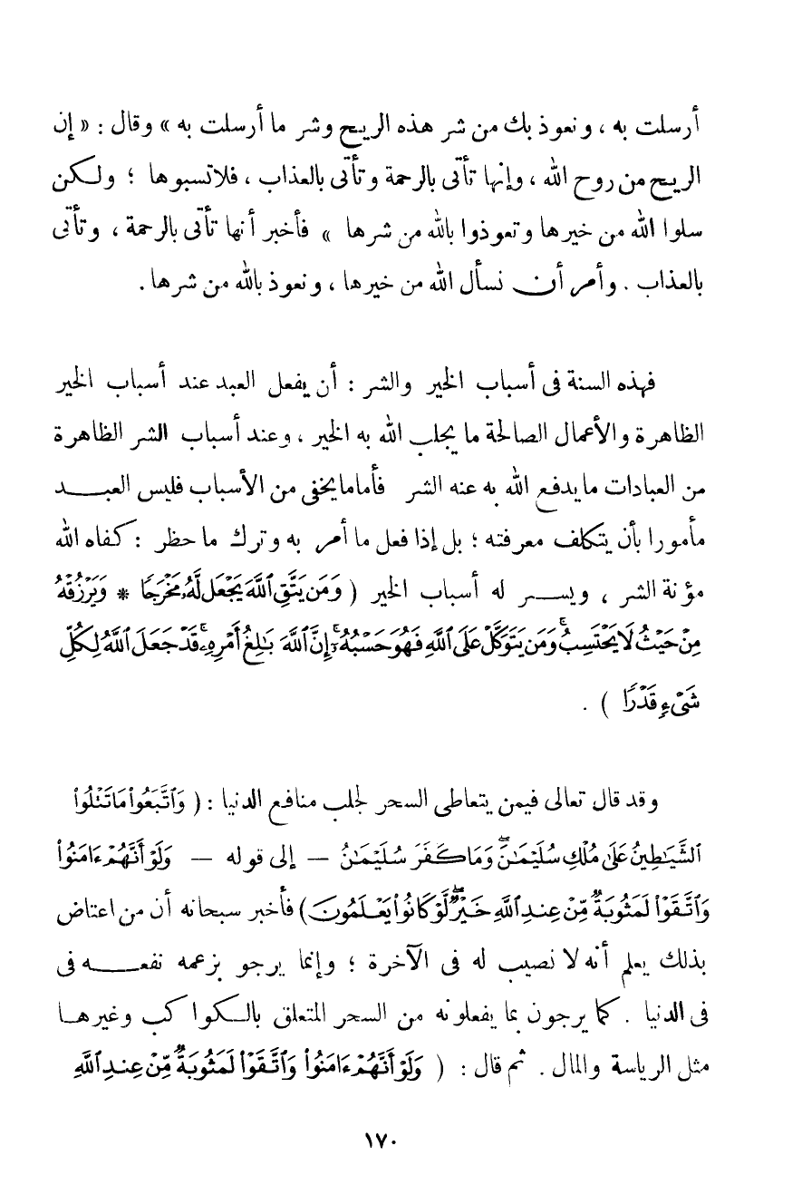 أُرْسِلَتْ بِهِ وَنَعُوذُ بِك مِنْ شَرِّ هَذِهِ الرِّيحِ وَشَرِّ مَا أُرْسِلَتْ بِهِ} " وَقَالَ: " {إنَّ الرِّيحَ مِنْ رَوْحِ اللَّهِ وَإِنَّهَا تَأْتِي بِالرَّحْمَةِ وَتَأْتِي بِالْعَذَابِ فَلَا تَسُبُّوهَا؛ وَلَكِنْ سَلُوا اللَّهَ مِنْ خَيْرِهَا وَتَعَوَّذُوا بِاَللَّهِ مِنْ شَرِّهَا} " فَأَخْبَرَ أَنَّهَا تَأْتِي بِالرَّحْمَةِ وَتَأْتِي بِالْعَذَابِ. وَأَمَرَ أَنْ نَسْأَلَ اللَّهَ مِنْ خَيْرِهَا وَنَعُوذَ بِاَللَّهِ مِنْ شَرِّهَا. فَهَذِهِ السُّنَّةُ فِي أَسْبَابِ الْخَيْرِ وَالشَّرِّ: أَنْ يَفْعَلَ الْعَبْدُ عِنْدَ أَسْبَابِ الْخَيْرِ الظَّاهِرَةِ وَالْأَعْمَالِ الصَّالِحَةِ مَا يَجْلِبُ اللَّهُ بِهِ الْخَيْرَ وَعِنْدَ أَسْبَابِ الشَّرِّ الظَّاهِرَةِ مِنْ الْعِبَادَاتِ مَا يَدْفَعُ اللَّهُ بِهِ عَنْهُ الشَّرَّ فَأَمَّا مَا يَخْفَى مِنْ الْأَسْبَابِ فَلَيْسَ الْعَبْدُ مَأْمُورًا بِأَنْ يَتَكَلَّفَ مَعْرِفَتَهُ؛ بَلْ إذَا فَعَلَ مَا أَمَرَ بِهِ وَتَرَكَ مَا حَظَرَ: كَفَاهُ اللَّهُ مُؤْنَةَ الشَّرِّ وَيَسَّرَ لَهُ أَسْبَابَ الْخَيْرِ {وَمَنْ يَتَّقِ اللَّهَ يَجْعَلْ لَهُ مَخْرَجًا} {وَيَرْزُقْهُ مِنْ حَيْثُ لَا يَحْتَسِبُ وَمَنْ يَتَوَكَّلْ عَلَى اللَّهِ فَهُوَ حَسْبُهُ إنَّ اللَّهَ بَالِغُ أَمْرِهِ قَدْ جَعَلَ اللَّهُ لِكُلِّ شَيْءٍ قَدْرًا} . وَقَدْ قَالَ تَعَالَى فِيمَنْ يَتَعَاطَى السِّحْرَ لِجَلْبِ مَنَافِعِ الدُّنْيَا: {وَاتَّبَعُوا مَا تَتْلُو الشَّيَاطِينُ عَلَى مُلْكِ سُلَيْمَانَ وَمَا كَفَرَ سُلَيْمَانُ} - إلَى قَوْلِهِ - {وَلَوْ أَنَّهُمْ آمَنُوا وَاتَّقَوْا لَمَثُوبَةٌ مِنْ عِنْدِ اللَّهِ خَيْرٌ لَوْ كَانُوا يَعْلَمُونَ} فَأَخْبَرَ سُبْحَانَهُ أَنَّ مَنْ اعْتَاضَ بِذَلِكَ يَعْلَمُ أَنَّهُ لَا نَصِيبَ لَهُ فِي الْآخِرَةِ؛ وَإِنَّمَا يَرْجُو بِزَعْمِهِ نَفْعَهُ فِي فِي الدُّنْيَا. كَمَا يَرْجُونَ بِمَا يَفْعَلُونَهُ مِنْ السِّحْرِ الْمُتَعَلِّقِ بِالْكَوَاكِبِ وَغَيْرِهَا مِثْلَ الرِّيَاسَةِ وَالْمَالِ. ثُمَّ قَالَ: {وَلَوْ أَنَّهُمْ آمَنُوا وَاتَّقَوْا لَمَثُوبَةٌ مِنْ عِنْدِ اللَّهِ