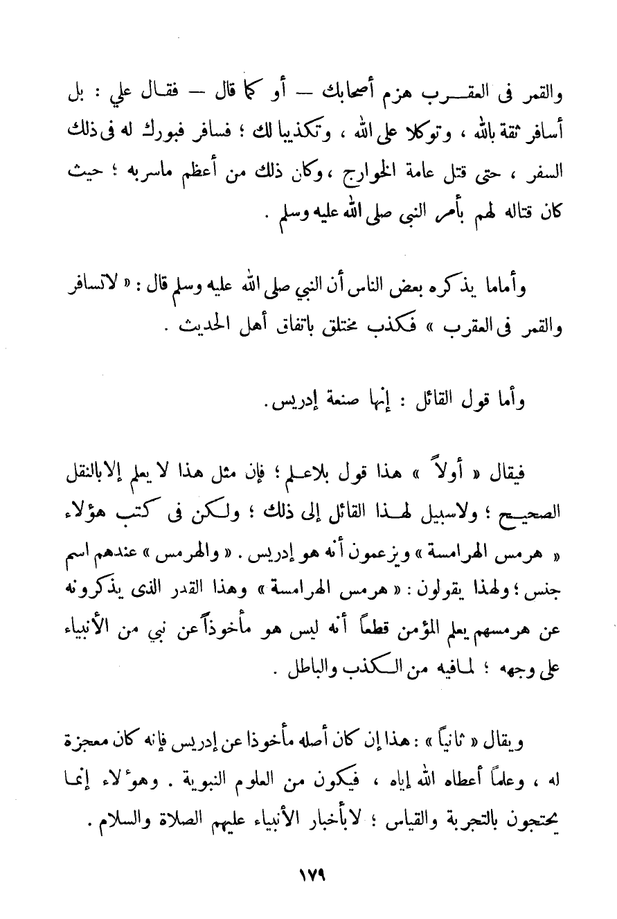 وَالْقَمَر فِي الْعَقْرَبِ هَزَمَ أَصْحَابك - أَوْ كَمَا قَالَ - فَقَالَ عَلَيَّ: بَلْ أُسَافِرُ ثِقَةً بِاَللَّهِ وَتَوَكُّلًا عَلَى اللَّهِ وَتَكْذِيبًا لَك؛ فَسَافَرَ فَبُورِكَ لَهُ فِي ذَلِكَ السَّفَرِ حَتَّى قَتْل عَامَّة الْخَوَارِج وَكَانَ ذَلِكَ مِنْ أَعْظَمِ مَا سِرٌّ بِهِ؛ حَيْثُ كَانَ قِتَاله لَهُمْ بِأَمْرِ النَّبِيِّ صَلَّى اللَّهُ عَلَيْهِ وَسَلَّمَ. وَأَمَّا مَا يُذَكِّرُهُ بَعْضُ النَّاسِ أَنَّ النَّبِيَّ صَلَّى اللَّهُ عَلَيْهِ وَسَلَّمَ قَالَ: " لَا تُسَافِرُ وَالْقَمَر فِي الْعَقْرَبِ " فَكَذِب مُخْتَلَق بِاتِّفَاقِ أَهْلِ الْحَدِيثِ. وَأَمَّا قَوْلُ الْقَائِلِ: إنَّهَا صَنْعَة إدْرِيس. فَيُقَالُ " أَوَّلًا " هَذَا قَوْل بِلَا عِلْم؛ فَإِنَّ مِثْلَ هَذَا لَا يَعْلَمُ إلَّا بِالنَّقْلِ الصَّحِيحِ؛ وَلَا سَبِيلَ لِهَذَا الْقَائِلِ إلَى ذَلِكَ؛ وَلَكِنْ فِي كُتُبٍ هَؤُلَاءِ " هَرْمَسَ الْهَرَامِسَة " وَيَزْعُمُونَ أَنَّهُ هُوَ إدْرِيس. " والهرمس " عِنْدَهُمْ اسْم جِنْس؛ وَلِهَذَا يَقُولُونَ: " هَرْمَسَ الْهَرَامِسَة " وَهَذَا الْقَدْر الَّذِي يُذَكِّرُونَهُ عَنْ هرمسهم يُعْلَمُ الْمُؤْمِن قَطْعًا أَنَّهُ لَيْسَ هُوَ مَأْخُوذًا عَنْ نَبِيٍّ مِنْ الْأَنْبِيَاءِ عَلَى وَجْهِهِ؛ لِمَا فِيهِ مِنْ الْكَذِبِ وَالْبَاطِل. وَيُقَالُ " ثَانِيًا ": هَذَا إنْ كَانَ أَصْله مَأْخُوذًا عَنْ إدْرِيس فَإِنَّهُ كَانَ مُعْجِزَة لَهُ وَعِلْمًا أَعْطَاهُ اللَّهُ إيَّاهُ فَيَكُونُ مِنْ الْعُلُومِ النَّبَوِيَّةِ. وَهَؤُلَاءِ إنَّمَا يَحْتَجُّونَ بِالتَّجْرِبَةِ وَالْقِيَاسِ؛ لَا بِأَخْبَارِ الْأَنْبِيَاء عَلَيْهِمْ الصَّلَاةُ وَالسَّلَام.
