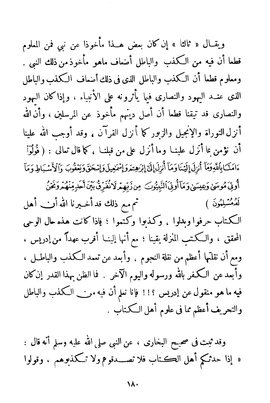 وَيُقَالُ " ثَالِثًا " إنَّ كَانَ بَعْضَ هَذَا مَأْخُوذًا عَنْ نَبِيٍّ فَمِنْ الْمَعْلُومِ قَطْعًا أَنْ فِيهِ مِنْ الْكَذِبِ وَالْبَاطِل أَضْعَاف مَا هُوَ مَأْخُوذٌ مِنْ ذَلِكَ النَّبِيِّ. وَمَعْلُومٌ قَطْعًا أَنَّ الْكَذِبَ وَالْبَاطِل الَّذِي فِي ذَلِكَ أَضْعَاف الْكَذِبِ وَالْبَاطِل الَّذِي عِنْد الْيَهُود وَالنَّصَارَى فِيمَا يَأْثُرُونَهُ عَلَى الْأَنْبِيَاءِ وَإِذَا كَانَ الْيَهُود وَالنَّصَارَى قَدّ تَيَقَّنَّا قَطْعًا أَنَّ أَصْلَ دِينِهِمْ مَأْخُوذٌ عَنْ الْمُرْسَلِينَ وَأَنَّ اللَّهَ أَنْزَلَ التَّوْرَاة وَالْإِنْجِيل وَالزَّبُور كَمَا أَنْزَلَ الْقُرْآنَ وَقَدْ أَوْجَبَ اللَّه عَلَيْنَا أَنْ نُؤْمِنَ بِمَا أَنْزَلَ عَلَيْنَا وَمَا أَنْزَلَ عَلَى مِنْ قَبِلْنَا كَمَا قَالَ تَعَالَى: {قُولُوا آمَنَّا بِاللَّهِ وَمَا أُنْزِلَ إلَيْنَا وَمَا أُنْزِلَ إلَى إبْرَاهِيمَ وَإِسْمَاعِيلَ وَإِسْحَاقَ وَيَعْقُوبَ وَالْأَسْبَاطِ وَمَا أُوتِيَ مُوسَى وَعِيسَى وَمَا أُوتِيَ النَّبِيُّونَ مِنْ رَبِّهِمْ لَا نُفَرِّقُ بَيْنَ أَحَدٍ مِنْهُمْ وَنَحْنُ لَهُ مُسْلِمُونَ} ثُمَّ مَعَ ذَلِكَ قَدْ أَخْبَرَنَا اللَّهُ أَنَّ أَهْلَ الْكِتَابِ حَرَّفُوا وَبَدَّلُوا وَكَذَّبُوا وَكَتَمُوا؛ فَإِذَا كَانَتْ هَذِهِ حَالَ الْوَحْيِ الْمُحَقَّقِ وَالْكُتُبِ الْمُنَزَّلَةِ يَقِينًا؛ مَعَ أَنَّهَا إلَيْنَا أَقْرَبُ عَهْدًا مِنْ إدْرِيس وَمَعَ أَنَّ نَقْلَتَهَا أَعْظَمُ مِنْ نَقْلَةِ النُّجُومِ وَأَبْعَدُ عَنْ تَعَمُّدِ الْكَذِبِ وَالْبَاطِلِ وَأَبْعَدُ عَنْ الْكُفْرِ بِاَللَّهِ وَرَسُولِهِ وَالْيَوْمِ الْآخِرِ. فَمَا الظَّنُّ بِهَذَا الْقَدْرِ إنْ كَانَ فِيهِ مَا هُوَ مَنْقُولٌ عَنْ إدْرِيس فَإِنَّا نَعْلَمُ أَنَّ فِيهِ مِنْ الْكَذِبِ وَالْبَاطِلِ وَالتَّحْرِيفِ أَعْظَمَ مِمَّا فِي عُلُومِ أَهْلِ الْكِتَابِ. وَقَدْ ثَبَتَ فِي صَحِيحِ الْبُخَارِيِّ عَنْ النَّبِيِّ صَلَّى اللَّهُ عَلَيْهِ وَسَلَّمَ أَنَّهُ قَالَ: " {إذَا حَدَّثَكُمْ أَهْلُ الْكِتَابِ فَلَا تُصَدِّقُوهُمْ وَلَا تُكَذِّبُوهُمْ وَقُولُوا