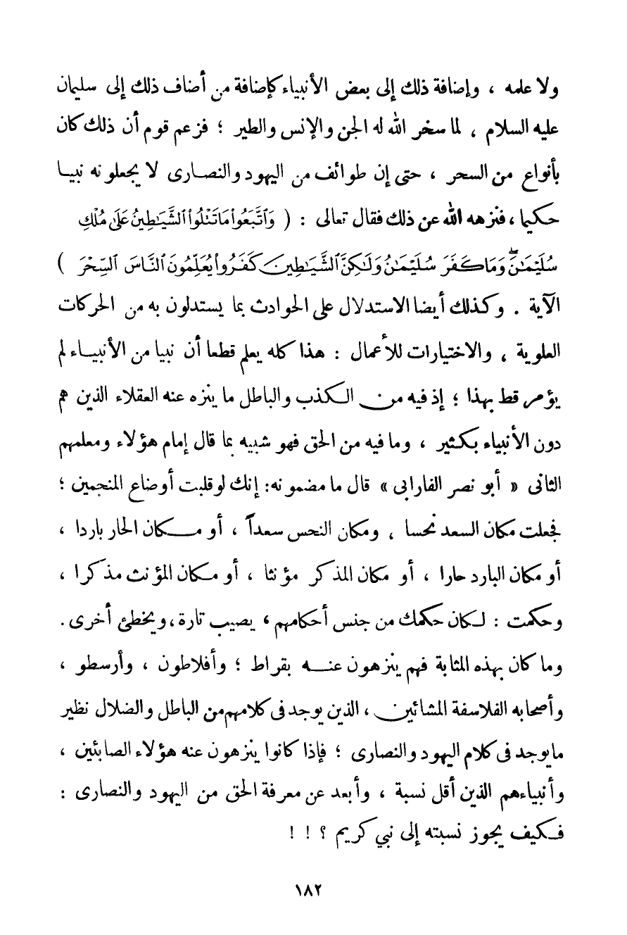وَلَا عَلَّمَهُ وَإِضَافَةُ ذَلِكَ إلَى بَعْضِ الْأَنْبِيَاءِ كَإِضَافَةِ مَنْ أَضَافَ ذَلِكَ إلَى سُلَيْمَانَ عَلَيْهِ السَّلَامُ لَمَّا سَخَّرَ اللَّهُ لَهُ الْجِنَّ وَالْإِنْسَ وَالطَّيْرَ؛ فَزَعَمَ قَوْمٌ أَنَّ ذَلِكَ كَانَ بِأَنْوَاعِ مِنْ السِّحْرِ حَتَّى إنَّ طَوَائِفَ مِنْ الْيَهُودِ وَالنَّصَارَى لَا يَجْعَلُونَهُ نَبِيًّا حَكِيمًا فَنَزَّهَهُ اللَّهُ مِنْ ذَلِكَ فَقَالَ تَعَالَى: {وَاتَّبَعُوا مَا تَتْلُو الشَّيَاطِينُ عَلَى مُلْكِ سُلَيْمَانَ وَمَا كَفَرَ سُلَيْمَانُ وَلَكِنَّ الشَّيَاطِينَ كَفَرُوا يُعَلِّمُونَ النَّاسَ السِّحْرَ} الْآيَةُ. وَكَذَلِكَ أَيْضًا الِاسْتِدْلَالُ عَلَى الْحَوَادِثِ بِمَا يَسْتَدِلُّونَ بِهِ مِنْ الْحَرَكَاتِ الْعُلْوِيَّةِ وَالِاخْتِيَارَاتِ لِلْأَعْمَالِ: هَذَا كُلُّهُ يُعْلِمُ قَطْعًا أَنَّ نَبِيًّا مِنْ الْأَنْبِيَاءِ لَمْ يُؤْمَرْ قَطُّ بِهَذَا؛ إذْ فِيهِ مِنْ الْكَذِبِ وَالْبَاطِلِ مَا يُنَزَّهُ عَنْهُ الْعُقَلَاءُ الَّذِينَ هُمْ دُونَ الْأَنْبِيَاءِ بِكَثِيرِ وَمَا فِيهِ مِنْ الْحَقِّ فَهُوَ شَبِيهٌ بِمَا قَالَ إمَامُ هَؤُلَاءِ وَمُعَلِّمُهُمْ الثَّانِي " أَبُو نَصْرٍ الْفَارَابِيُّ " قَالَ مَا مَضْمُونُهُ: إنَّك لَوْ قَلَبْت أَوْضَاعَ الْمُنَجِّمِينَ؛ فَجَعَلْت مَكَانَ السَّعْدِ نَحْسًا وَمَكَانَ النَّحْسِ سَعْدًا أَوْ مَكَانَ الْحَارِّ بَارِدًا أَوْ مَكَانَ الْبَارِدِ حَارًّا أَوْ مَكَانَ الْمُذَكَّرِ مُؤَنَّثًا أَوْ مَكَانَ الْمُؤَنَّثِ مُذَكَّرًا وَحَكَمْت: لَكَانَ حُكْمُك مِنْ جِنْسِ أَحْكَامِهِمْ يُصِيبُ تَارَةً وَيُخْطِئُ أُخْرَى. وَمَا كَانَ بِهَذِهِ الْمَثَابَةِ فَهُمْ يُنَزِّهُونَ عَنْهُ بقراط وَأَفْلَاطُونَ وَأَرِسْطُو وَأَصْحَابَهُ الْفَلَاسِفَةَ الْمَشَّائِينَ الَّذِينَ يُوجَدُ فِي كَلَامِهِمْ مِنْ الْبَاطِلِ وَالضَّلَالِ نَظِيرُ مَا يُوجَدُ فِي كَلَامِ الْيَهُودِ وَالنَّصَارَى؛ فَإِذَا كَانُوا يُنَزِّهُونَ عَنْهُ هَؤُلَاءِ الصَّابِئِينَ وَأَنْبِيَاءَهُمْ الَّذِينَ أَقَلُّ نِسْبَةً وَأَبْعَدُ عَنْ مَعْرِفَةِ الْحَقِّ مِنْ الْيَهُودِ وَالنَّصَارَى: فَكَيْفَ يَجُوزُ نِسْبَتُهُ إلَى نَبِيٍّ كَرِيمٍ