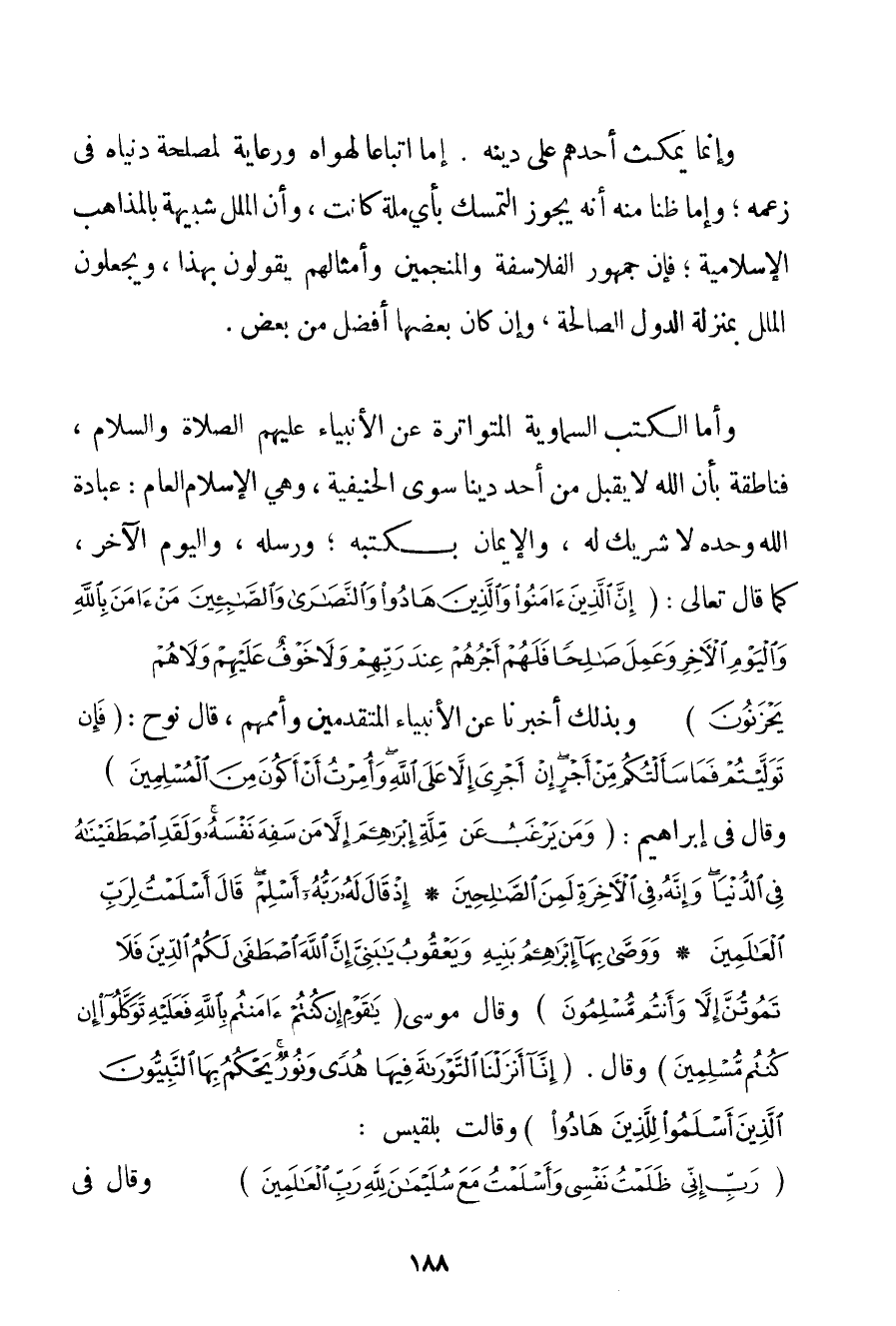 وَإِنَّمَا يَمْكُثُ أَحَدُهُمْ عَلَى دِينِهِ. إمَّا اتِّبَاعًا لِهَوَاهُ وَرِعَايَةً لِمَصْلَحَةِ دُنْيَاهُ فِي زَعْمِهِ؛ وَإِمَّا ظَنًّا مِنْهُ أَنَّهُ يَجُوزُ التَّمَسُّكُ بِأَيِّ مِلَّةٍ كَانَتْ وَأَنَّ الْمِلَلَ شَبِيهَةٌ بِالْمَذَاهِبِ الْإِسْلَامِيَّةِ فَإِنَّ جُمْهُورَ الْفَلَاسِفَةِ وَالْمُنَجِّمِينَ وَأَمْثَالَهُمْ يَقُولُونَ بِهَذَا وَيَجْعَلُونَ الْمِلَلَ بِمَنْزِلَةِ الدُّوَلِ الصَّالِحَةِ وَإِنْ كَانَ بَعْضُهَا أَفْضَلَ مِنْ بَعْضٍ. وَأَمَّا الْكُتُبُ السَّمَاوِيَّةُ الْمُتَوَاتِرَةُ عَنْ الْأَنْبِيَاء عَلَيْهِمْ الصَّلَاةُ وَالسَّلَامُ فَنَاطِقَةٌ بِأَنَّ اللَّهَ لَا يَقْبَلُ مِنْ أَحَدٍ دِينًا سِوَى الْحَنِيفِيَّةِ وَهَى الْإِسْلَامُ الْعَامُّ: عِبَادَةُ اللَّهِ وَحْدَهُ لَا شَرِيكَ لَهُ وَالْإِيمَانُ بِكُتُبِهِ؛ وَرُسُلِهِ وَالْيَوْمِ الْآخِرِ كَمَا قَالَ تَعَالَى: {إنَّ الَّذِينَ آمَنُوا وَالَّذِينَ هَادُوا وَالنَّصَارَى وَالصَّابِئِينَ مَنْ آمَنَ بِاللَّهِ وَالْيَوْمِ الْآخِرِ وَعَمِلَ صَالِحًا فَلَهُمْ أَجْرُهُمْ عِنْدَ رَبِّهِمْ وَلَا خَوْفٌ عَلَيْهِمْ وَلَا هُمْ يَحْزَنُونَ} وَبِذَلِكَ أَخْبَرَنَا عَنْ الْأَنْبِيَاءِ الْمُتَقَدِّمِينَ وَأُمَمِهِمْ قَالَ نُوحٌ: {فَإِنْ تَوَلَّيْتُمْ فَمَا سَأَلْتُكُمْ مِنْ أَجْرٍ إنْ أَجْرِيَ إلَّا عَلَى اللَّهِ وَأُمِرْتُ أَنْ أَكُونَ مِنَ الْمُسْلِمِينَ} وَقَالَ فِي إبْرَاهِيمَ: {وَمَنْ يَرْغَبُ عَنْ مِلَّةِ إبْرَاهِيمَ إلَّا مَنْ سَفِهَ نَفْسَهُ وَلَقَدِ اصْطَفَيْنَاهُ فِي الدُّنْيَا وَإِنَّهُ فِي الْآخِرَةِ لَمِنَ الصَّالِحِينَ} {إذْ قَالَ لَهُ رَبُّهُ أَسْلِمْ قَالَ أَسْلَمْتُ لِرَبِّ الْعَالَمِينَ} {وَوَصَّى بِهَا إبْرَاهِيمُ بَنِيهِ وَيَعْقُوبُ يَا بَنِيَّ إنَّ اللَّهَ اصْطَفَى لَكُمُ الدِّينَ فَلَا تَمُوتُنَّ إلَّا وَأَنْتُمْ مُسْلِمُونَ} وَقَالَ مُوسَى {يَا قَوْمِ إنْ كُنْتُمْ آمَنْتُمْ بِاللَّهِ فَعَلَيْهِ تَوَكَّلُوا إنْ كُنْتُمْ مُسْلِمِينَ} وَقَالَ. {إنَّا أَنْزَلْنَا التَّوْرَاةَ فِيهَا هُدًى وَنُورٌ يَحْكُمُ بِهَا النَّبِيُّونَ الَّذِينَ أَسْلَمُوا لِلَّذِينَ هَادُوا} وَقَالَتْ بلقيس: {رَبِّ إنِّي ظَلَمْتُ نَفْسِي وَأَسْلَمْتُ مَعَ سُلَيْمَانَ لِلَّهِ رَبِّ الْعَالَمِينَ} وَقَالَ فِي