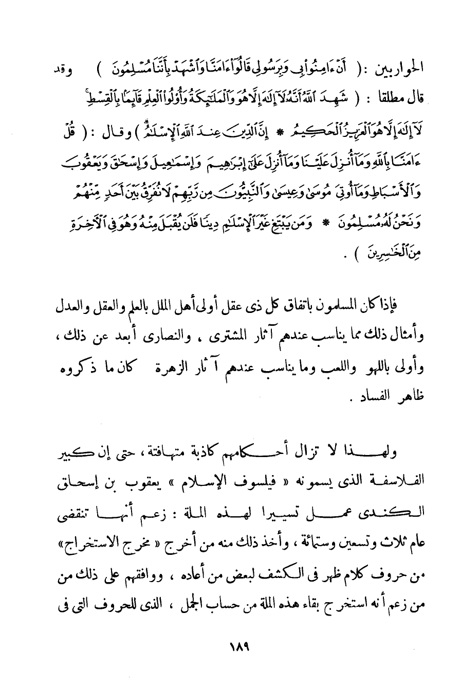 الْحَوَارِيِّينَ: {أَنْ آمِنُوا بِي وَبِرَسُولِي قَالُوا آمَنَّا وَاشْهَدْ بِأَنَّنَا مُسْلِمُونَ} وَقَدْ قَالَ مُطْلِقًا: {شَهِدَ اللَّهُ أَنَّهُ لَا إلَهَ إلَّا هُوَ وَالْمَلَائِكَةُ وَأُولُو الْعِلْمِ قَائِمًا بِالْقِسْطِ لَا إلَهَ إلَّا هُوَ الْعَزِيزُ الْحَكِيمُ} {إنَّ الدِّينَ عِنْدَ اللَّهِ الْإِسْلَامُ} وَقَالَ: {قُلْ آمَنَّا بِاللَّهِ وَمَا أُنْزِلَ عَلَيْنَا وَمَا أُنْزِلَ عَلَى إبْرَاهِيمَ وَإِسْمَاعِيلَ وَإِسْحَاقَ وَيَعْقُوبَ وَالْأَسْبَاطِ وَمَا أُوتِيَ مُوسَى وَعِيسَى وَالنَّبِيُّونَ مِنْ رَبِّهِمْ لَا نُفَرِّقُ بَيْنَ أَحَدٍ مِنْهُمْ وَنَحْنُ لَهُ مُسْلِمُونَ} {وَمَنْ يَبْتَغِ غَيْرَ الْإِسْلَامِ دِينًا فَلَنْ يُقْبَلَ مِنْهُ وَهُوَ فِي الْآخِرَةِ مِنَ الْخَاسِرِينَ} . فَإِذَا كَانَ الْمُسْلِمُونَ بِاتِّفَاقِ كُلِّ ذِي عَقْلٍ أَوْلَى أَهْلِ الْمِلَلِ بِالْعِلْمِ وَالْعَقْلِ وَالْعَدْلِ وَأَمْثَالِ ذَلِكَ مِمَّا يُنَاسِبُ عِنْدَهُمْ آثَارَ الْمُشْتَرَى وَالنَّصَارَى أَبْعَدُ عَنْ ذَلِكَ وَأَوْلَى بِاللَّهْوِ وَاللَّعِبِ وَمَا يُنَاسِبُ عِنْدَهُمْ آثَارَ الزهرة كَانَ مَا ذَكَرُوهُ ظَاهِرَ الْفَسَادِ. وَلِهَذَا لَا تَزَالُ أَحْكَامُهُمْ كَاذِبَةً مُتَهَافِتَةً حَتَّى إنَّ كَبِيرَ الْفَلَاسِفَةِ الَّذِي يُسَمُّونَهُ " فَيْلَسُوفَ الْإِسْلَامِ " يَعْقُوبُ بْنُ إسْحَاقَ الْكِنْدِيُّ عَمِلَ تَسْيِيرًا لِهَذِهِ الْمِلَّةِ: زَعَمَ أَنَّهَا تَنْقَضِي عَامَ ثَلَاثٍ وَتِسْعِينَ وَسِتِّمِائَةٍ وَأَخَذَ ذَلِكَ مِنْهُ مَنْ أَخْرَجَ " مَخْرَجَ الِاسْتِخْرَاجِ " مِنْ حُرُوفِ كَلَامٍ ظَهَرَ فِي الْكَشْفِ لِبَعْضِ مَنْ أَعَادَهُ وَوَافَقَهُمْ عَلَى ذَلِكَ مَنْ زَعَمَ أَنَّهُ اسْتَخْرَجَ بَقَاءَ هَذِهِ الْمِلَّةِ مِنْ حِسَابِ الْجُمَلِ الَّذِي لِلْحُرُوفِ الَّتِي فِي