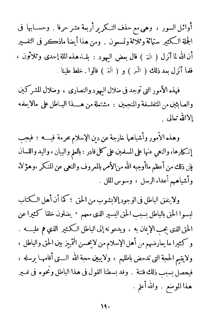 أَوَائِلِ السُّوَرِ وَهِيَ مَعَ حَذْفِ التَّكْرِيرِ أَرْبَعَةَ عَشَرَ حَرْفًا. وَحِسَابُهَا فِي الْجُمْلَةِ الْكَثِيرُ سِتُّمِائَةٍ وَثَلَاثَةٌ وَتِسْعُونَ. وَمِنْ هَذَا أَيْضًا مَا ذُكِرَ فِي التَّفْسِيرِ أَنَّ اللَّهَ لَمَّا أَنْزَلَ {الم} قَالَ بَعْضُ الْيَهُودِ: بَقَاءُ هَذِهِ الْمِلَّةِ إحْدَى وَثَلَاثُونَ فَلَمَّا أَنْزَلَ بَعْدَ ذَلِكَ {الر} و {الم} قَالُوا. خَلَطَ عَلَيْنَا. فَهَذِهِ الْأُمُورُ الَّتِي تُوجَدُ فِي ضَلَالِ الْيَهُودِ وَالنَّصَارَى وَضَلَالِ الْمُشْرِكِينَ وَالصَّابِئِينَ مِنْ الْمُتَفَلْسِفَةِ وَالْمُنَجِّمِينَ: مُشْتَمِلَةٌ مِنْ هَذَا الْبَاطِلِ عَلَى مَا لَا يَعْلَمُهُ إلَّا اللَّهُ تَعَالَى. وَهَذِهِ الْأُمُورُ وَأَشْبَاهُهَا خَارِجَةٌ عَنْ دِينِ الْإِسْلَامِ مُحَرَّمَةٌ فِيهِ؛ فَيَجِبُ إنْكَارُهَا وَالنَّهْيُ عَنْهَا عَلَى الْمُسْلِمِينَ عَلَى كُلِّ قَادِرٍ: بِالْعِلْمِ وَالْبَيَانِ وَالْيَدِ وَاللِّسَانِ فَإِنَّ ذَلِكَ مِنْ أَعْظَمِ مَا أَوْجَبَهُ اللَّهُ مِنْ الْأَمْرِ بِالْمَعْرُوفِ وَالنَّهْيِ عَنْ الْمُنْكَرِ وَهَؤُلَاءِ وَأَشْبَاهُهُمْ أَعْدَاءُ الرُّسُلِ وَسُوسُ الْمِلَلِ. وَلَا يُنْفَقُ الْبَاطِلِ فِي الْوُجُودِ إلَّا بِشَوْبِ مِنْ الْحَقِّ؛ كَمَا أَنَّ أَهْل الْكِتَابِ لَبَّسُوا الْحَقَّ بِالْبَاطِلِ بِسَبَبِ الْحَقِّ الْيَسِيرِ الَّذِي مَعَهُمْ يُضِلُّونَ خَلْقًا كَثِيرًا عَنْ الْحَقِّ الَّذِي يَجِبُ الْإِيمَانُ بِهِ وَيَدَّعُونَهُ إلَى الْبَاطِلِ الْكَثِيرِ الَّذِي هُمْ عَلَيْهِ. وَكَثِيرًا مَا يُعَارِضُهُمْ مِنْ أَهْلِ الْإِسْلَامِ مَنْ لَا يُحْسِنُ التَّمْيِيزَ بَيْنَ الْحَقِّ وَالْبَاطِلِ وَلَا يُقِيمُ الْحُجَّةَ الَّتِي تُدَحِّضُ بَاطِلَهُمْ وَلَا يُبَيِّنُ حُجَّةَ اللَّهِ الَّتِي أَقَامَهَا بِرُسُلِهِ فَيَحْصُلُ بِسَبَبِ ذَلِكَ فِتْنَةٌ. وَقَدْ بَسَطْنَا الْقَوْلَ فِي هَذَا الْبَاطِلِ وَنَحْوَهُ فِي غَيْرِ هَذَا الْمَوْضِعِ. وَاَللَّهُ أَعْلَمُ.