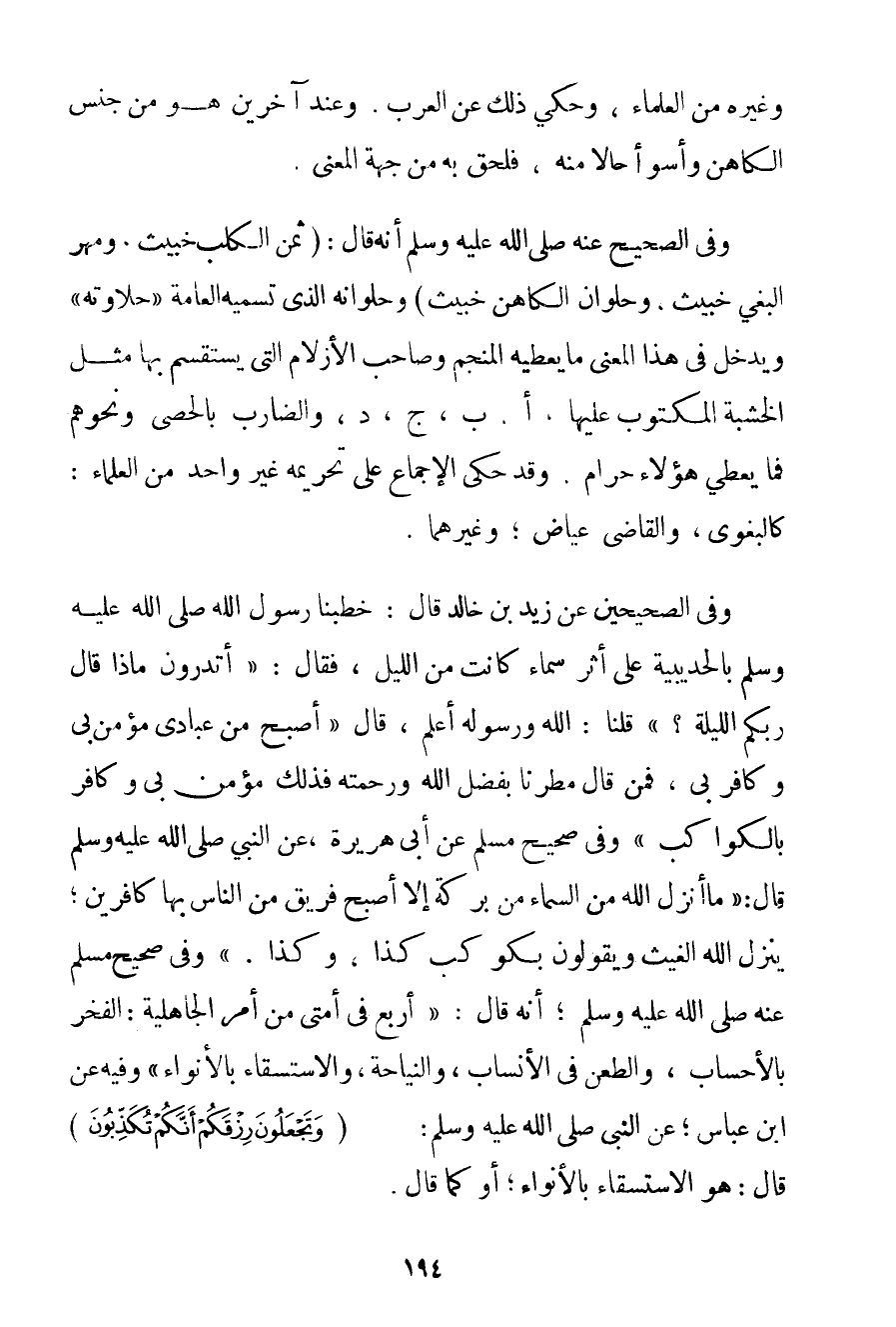 وَغَيْرِهِ مِنْ الْعُلَمَاءِ وَحُكِيَ ذَلِكَ عَنْ الْعَرَبِ. وَعِنْدَ آخَرِينَ هُوَ مِنْ جِنْسِ الْكَاهِنِ وَأَسْوَأُ حَالًا مِنْهُ فَلَحِقَ بِهِ مِنْ جِهَةِ الْمَعْنَى. وَفِي الصَّحِيحِ عَنْهُ صَلَّى اللَّهُ عَلَيْهِ وَسَلَّمَ أَنَّهُ قَالَ: ( {ثَمَنُ الْكَلْبِ خَبِيثٌ. وَمَهْرُ الْبَغِيِّ خَبِيثٌ وَحُلْوَانُ الْكَاهِنِ خَبِيثٌ} وَحُلْوَانُهُ الَّذِي تُسَمِّيهِ الْعَامَّةُ " حَلَاوَتُهُ " وَيَدْخُلُ فِي هَذَا الْمَعْنَى مَا يُعْطِيهِ الْمُنَجِّمُ وَصَاحِبُ الْأَزْلَامِ الَّتِي يَسْتَقْسِمُ بِهَا مِثْلَ الْخَشَبَةِ الْمَكْتُوبِ عَلَيْهَا أب ج د وَالضَّارِبِ بِالْحَصَى وَنَحْوِهِمْ فَمَا يُعْطَى هَؤُلَاءِ حَرَامٌ. وَقَدْ حَكَى الْإِجْمَاعَ عَلَى تَحْرِيمِهِ غَيْرُ وَاحِدٍ مِنْ الْعُلَمَاءِ: كالبغوي وَالْقَاضِي عِيَاضٍ؛ وَغَيْرِهِمَا. وَفِي الصَّحِيحَيْنِ {عَنْ زَيْدِ بْنِ خَالِدٍ قَالَ: خَطَبَنَا رَسُولُ اللَّهِ صَلَّى اللَّهُ عَلَيْهِ وَسَلَّمَ بِالْحُدَيْبِيَةِ عَلَى إثْرِ سَمَاءٍ كَانَتْ مِنْ اللَّيْلِ فَقَالَ: أَتَدْرُونَ مَاذَا قَالَ رَبُّكُمْ اللَّيْلَةَ؟ قُلْنَا: اللَّهُ وَرَسُولُهُ أَعْلَمُ قَالَ أَصْبَحَ مِنْ عِبَادِي مُؤْمِنٌ بِي وَكَافِرٌ بِي فَمَنْ قَالَ مُطِرْنَا بِفَضْلِ اللَّهِ وَرَحْمَتِهِ فَذَلِكَ مُؤْمِنٌ بِي وَكَافِرٌ بِالْكَوَاكِبِ} " وَفِي صَحِيحِ مُسْلِمٍ عَنْ أَبِي هُرَيْرَةَ عَنْ النَّبِيِّ صَلَّى اللَّهُ عَلَيْهِ وَسَلَّمَ قَالَ: " {مَا أَنْزَلَ اللَّهُ مِنْ السَّمَاءِ مِنْ بَرَكَةٍ إلَّا أَصْبَحَ فَرِيقٌ مِنْ النَّاسِ بِهَا كَافِرِينَ؛ يُنَزِّلُ اللَّهُ الْغَيْثَ وَيَقُولُونَ بِكَوْكَبِ كَذَا وَكَذَا.} " وَفِي صَحِيحِ مُسْلِمٍ عَنْهُ صَلَّى اللَّهُ عَلَيْهِ وَسَلَّمَ أَنَّهُ قَالَ: " {أَرْبَعٌ فِي أُمَّتِي مِنْ أَمْرِ الْجَاهِلِيَّةِ: الْفَخْرُ بِالْأَحْسَابِ وَالطَّعْنُ فِي الْأَنْسَابِ وَالنِّيَاحَةُ وَالِاسْتِسْقَاءُ بِالْأَنْوَاءِ} " وَفِيهِ عَنْ ابْنِ عَبَّاسٍ؛ عَنْ النَّبِيِّ صَلَّى اللَّهُ عَلَيْهِ وَسَلَّمَ {وَتَجْعَلُونَ رِزْقَكُمْ أَنَّكُمْ تُكَذِّبُونَ} قَالَ: هُوَ الِاسْتِسْقَاءُ بِالْأَنْوَاءِ؛ أَوْ كَمَا قَالَ.