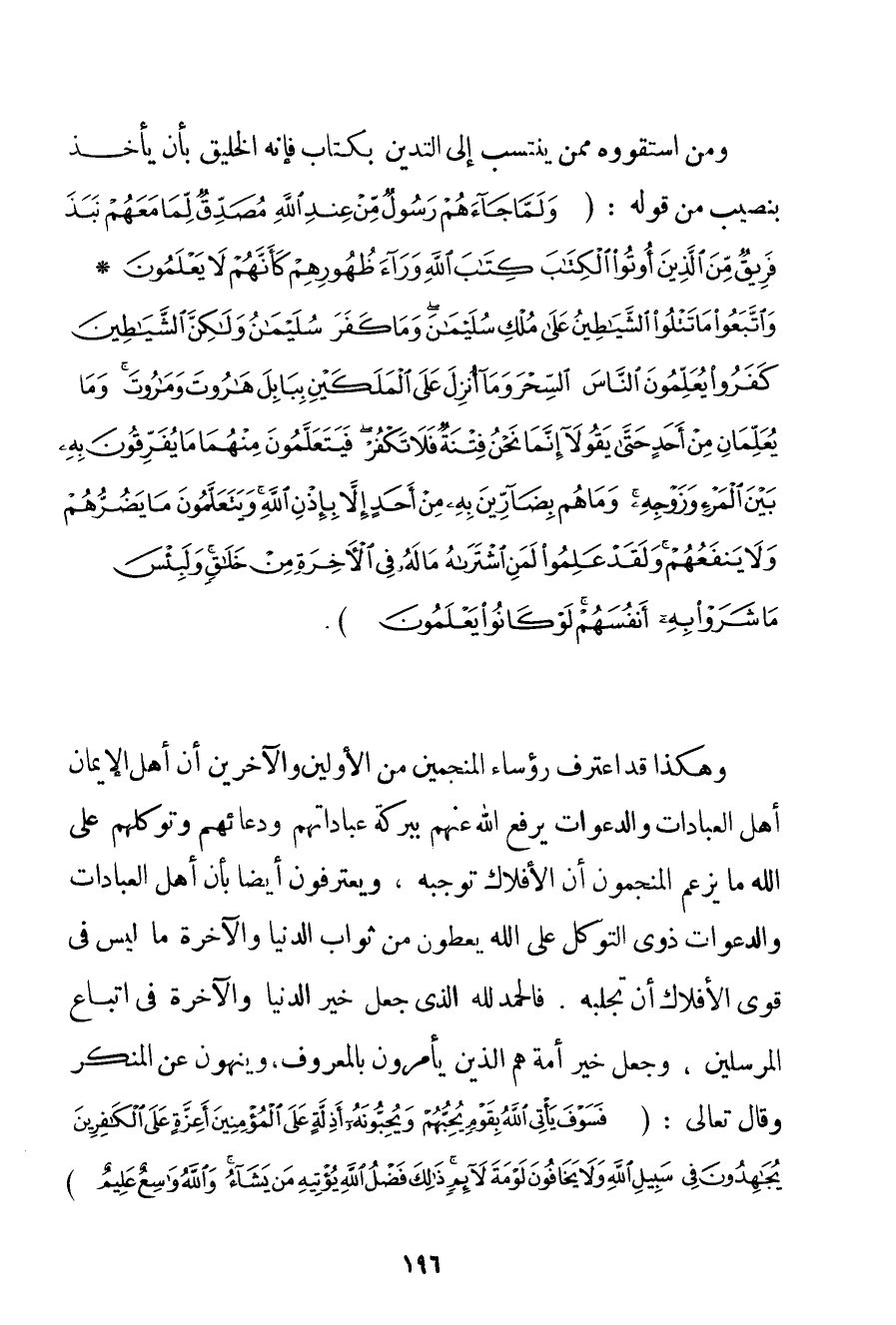 وَمَنْ اسْتَقْوَوْهُ مِمَّنْ يَنْتَسِبُ إلَى التَّدَيُّنِ بِكِتَابِ فَإِنَّهُ الْخَلِيقُ بِأَنْ يَأْخُذَ بِنَصِيبِ مِنْ قَوْلِهِ: {وَلَمَّا جَاءَهُمْ رَسُولٌ مِنْ عِنْدِ اللَّهِ مُصَدِّقٌ لِمَا مَعَهُمْ نَبَذَ فَرِيقٌ مِنَ الَّذِينَ أُوتُوا الْكِتَابَ كِتَابَ اللَّهِ وَرَاءَ ظُهُورِهِمْ كَأَنَّهُمْ لَا يَعْلَمُونَ} {وَاتَّبَعُوا مَا تَتْلُو الشَّيَاطِينُ عَلَى مُلْكِ سُلَيْمَانَ وَمَا كَفَرَ سُلَيْمَانُ وَلَكِنَّ الشَّيَاطِينَ كَفَرُوا يُعَلِّمُونَ النَّاسَ السِّحْرَ وَمَا أُنْزِلَ عَلَى الْمَلَكَيْنِ بِبَابِلَ هَارُوتَ وَمَارُوتَ وَمَا يُعَلِّمَانِ مِنْ أَحَدٍ حَتَّى يَقُولَا إنَّمَا نَحْنُ فِتْنَةٌ فَلَا تَكْفُرْ فَيَتَعَلَّمُونَ مِنْهُمَا مَا يُفَرِّقُونَ بِهِ بَيْنَ الْمَرْءِ وَزَوْجِهِ وَمَا هُمْ بِضَارِّينَ بِهِ مِنْ أَحَدٍ إلَّا بِإِذْنِ اللَّهِ وَيَتَعَلَّمُونَ مَا يَضُرُّهُمْ وَلَا يَنْفَعُهُمْ وَلَقَدْ عَلِمُوا لَمَنِ اشْتَرَاهُ مَا لَهُ فِي الْآخِرَةِ مِنْ خَلَاقٍ وَلَبِئْسَ مَا شَرَوْا بِهِ أَنْفُسَهُمْ لَوْ كَانُوا يَعْلَمُونَ} . وَهَكَذَا قَدْ اعْتَرَفَ رُؤَسَاءُ الْمُنَجِّمِينَ مِنْ الْأَوَّلِينَ والآخرين أَنَّ أَهْلَ الْإِيمَانِ أَهْلُ الْعِبَادَاتِ وَالدَّعَوَاتِ يَرْفَعُ اللَّهُ عَنْهُمْ بِبَرَكَةِ عِبَادَاتِهِمْ وَدُعَائِهِمْ وَتَوَكُّلِهِمْ عَلَى اللَّهِ مَا يَزْعُمُ الْمُنَجِّمُونَ أَنَّ الْأَفْلَاكَ تُوجِبُهُ وَيَعْتَرِفُونَ أَيْضًا بِأَنَّ أَهْلَ الْعِبَادَاتِ وَالدَّعَوَاتِ ذَوِي التَّوَكُّلِ عَلَى اللَّهِ يُعْطَوْنَ مِنْ ثَوَابِ الدُّنْيَا وَالْآخِرَةِ مَا لَيْسَ فِي قُوَى الْأَفْلَاكِ أَنْ تَجْلِبَهُ. فَالْحَمْدُ لِلَّهِ الَّذِي جَعَلَ خَيْرَ الدُّنْيَا وَالْآخِرَةِ فِي اتِّبَاعِ الْمُرْسَلِينَ وَجَعَلَ خَيْرَ أُمَّةٍ هُمْ الَّذِينَ يَأْمُرُونَ بِالْمَعْرُوفِ وَيَنْهَوْنَ عَنْ الْمُنْكَرِ وَقَالَ تَعَالَى: {فَسَوْفَ يَأْتِي اللَّهُ بِقَوْمٍ يُحِبُّهُمْ وَيُحِبُّونَهُ أَذِلَّةً عَلَى الْمُؤْمِنِينَ أَعِزَّةً عَلَى الْكَافِرِينَ يُجَاهِدُونَ فِي سَبِيلِ اللَّهِ وَلَا يَخَافُونَ لَوْمَةَ لَائِمٍ ذَلِكَ